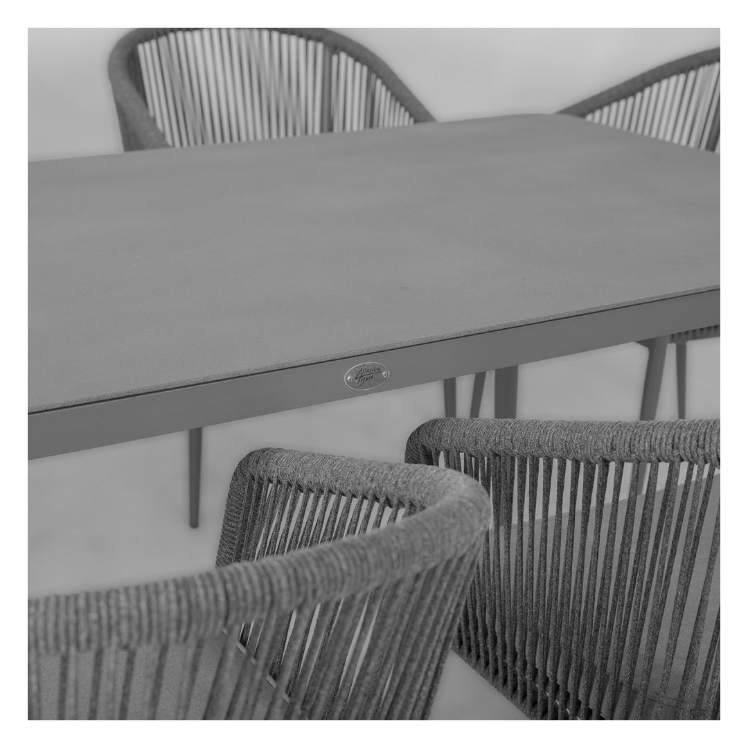 Садовая мебель ECCO стол и 6 стульев. Стол 180x90xH75см, столешница: 5мм темно-серое закаленное стекло под камень. Каркасы стола и стульев изготовлены из алюминия и покрыты порошковой краской серого цвета. Спинка и подлокотники кресла обиты простой веревкой. Подушка входит в комплект. Чехол на подушку изготовлен из полиэстера. Размеры подушки сиденья 45x42x5см. Основание сиденья поддерживается алюминиевыми планками. Размеры кресла 57x65xH8см, предельный вес 100кг. Стулья можно штабелировать, их легко хранить и экономить место. Продукт долговечен в меняющихся погодных условиях и очень прост в уходе. ХРАНЕНИЕ: в конце летнего сезона рекомендуем хранить садовую мебель в помещении. Очистите и высушите мебель перед хранением. Используйте для хранения прохладное, сухое, хорошо проветриваемое помещение. Садовая мебель ECCO стол и 6 стульев. Стол 180x90xH75см, столешница: 5мм темно-серое закаленное стекло под камень. Каркасы стола и стульев изготовлены из алюминия и покрыты порошковой краской серого цвета. Спинка и подлокотники кресла обиты простой веревкой. Подушка входит в комплект. Чехол на подушку изготовлен из полиэстера. Размеры подушки сиденья 45x42x5см. Основание сиденья поддерживается алюминиевыми планками. Размеры кресла 57x65xH8см, предельный вес 100кг. Стулья можно штабелировать, их легко хранить и экономить место. Продукт долговечен в меняющихся погодных условиях и очень прост в уходе. ХРАНЕНИЕ: в конце летнего сезона рекомендуем хранить садовую мебель в помещении. Очистите и высушите мебель перед хранением. Используйте для хранения прохладное, сухое, хорошо проветриваемое помещение.
