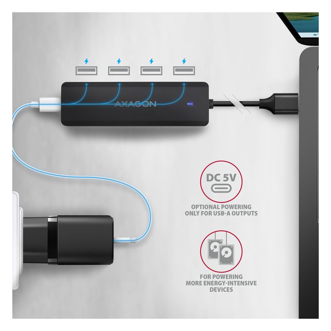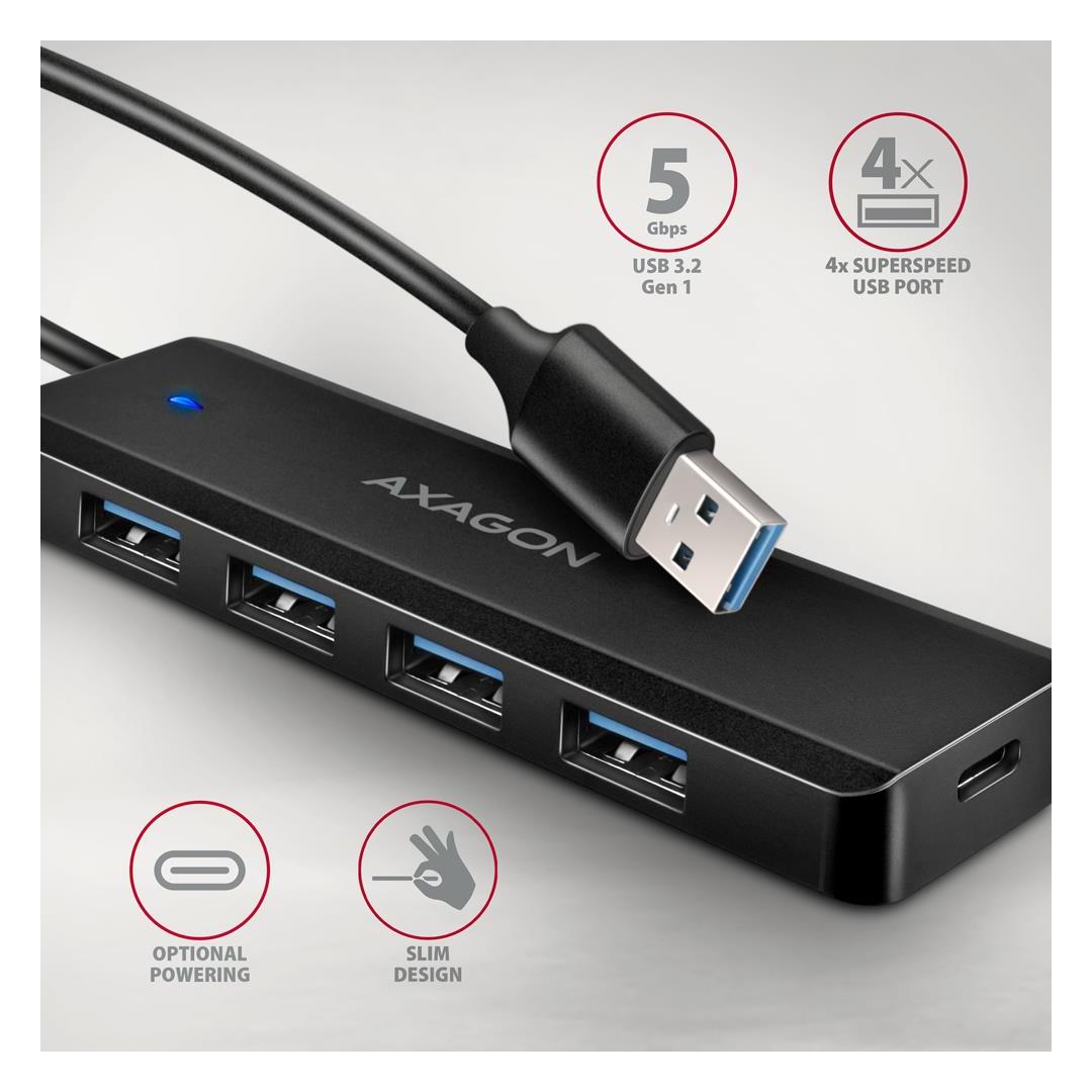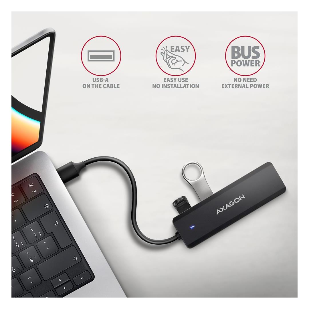 Travel USB-A 5Gbps hub AXAGON HUE-C1A fast and easy connects up to four USB devices to laptop or computer at the same time. Fixed 19 cm long USB-A cable is ideal for mobile devices users. The USB 3.2 Gen 1 standard enables transfer speeds of up to 5 Gb/s.