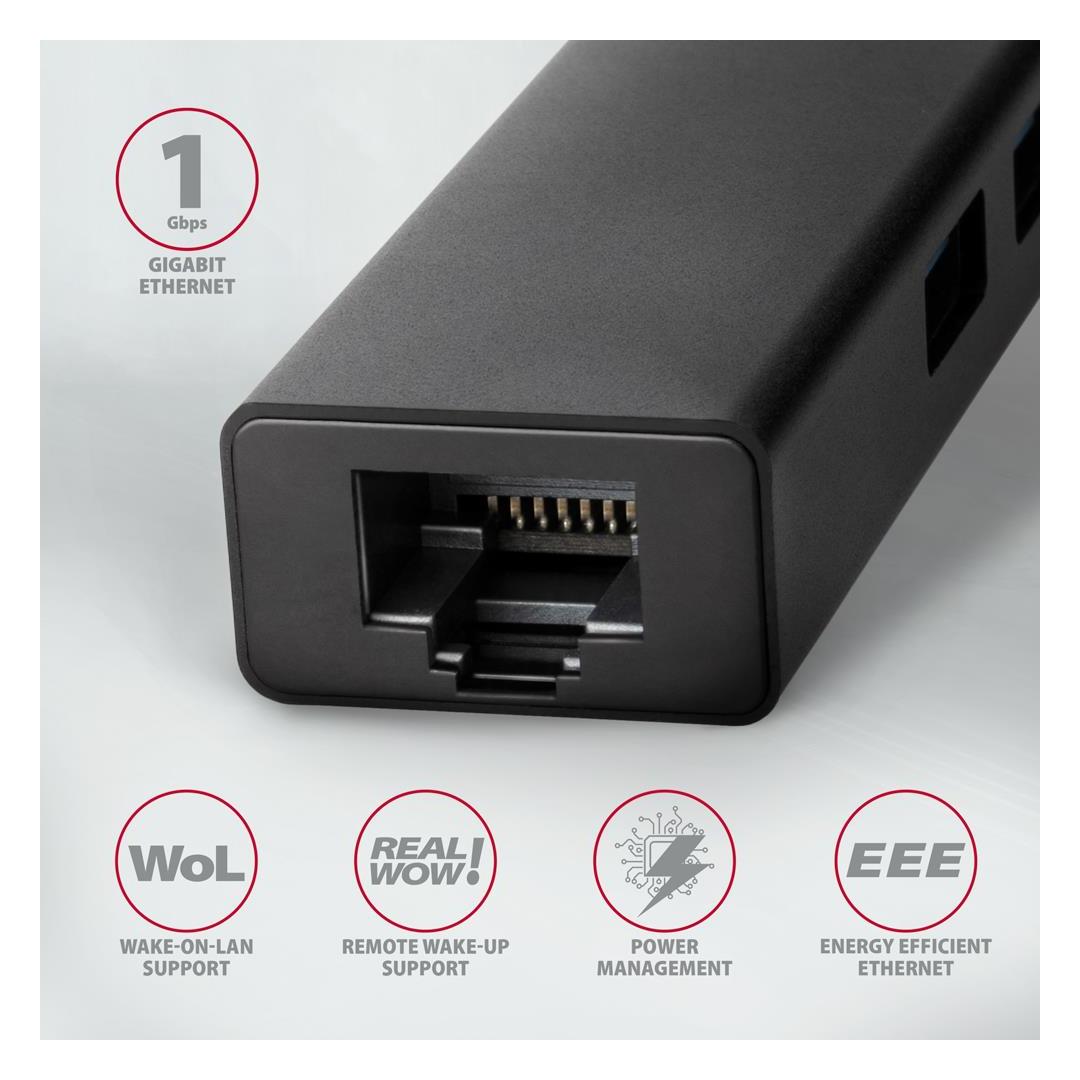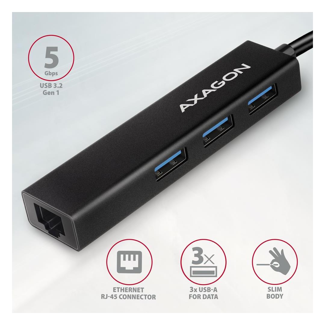 Slim metal USB-C 3.2 Gen 1 (USB 3.0) multi-port hub AXAGON HMC-GL3A connects up to three USB devices to laptop or computer and also adds Gigabit network card which connects your computer to high speed network.