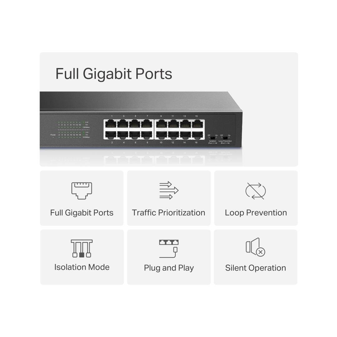 Full Gigabit Ports: 16× 10/100/1000 Mbps Auto-Negotiation RJ45 port supporting Auto-MDI/MDIX