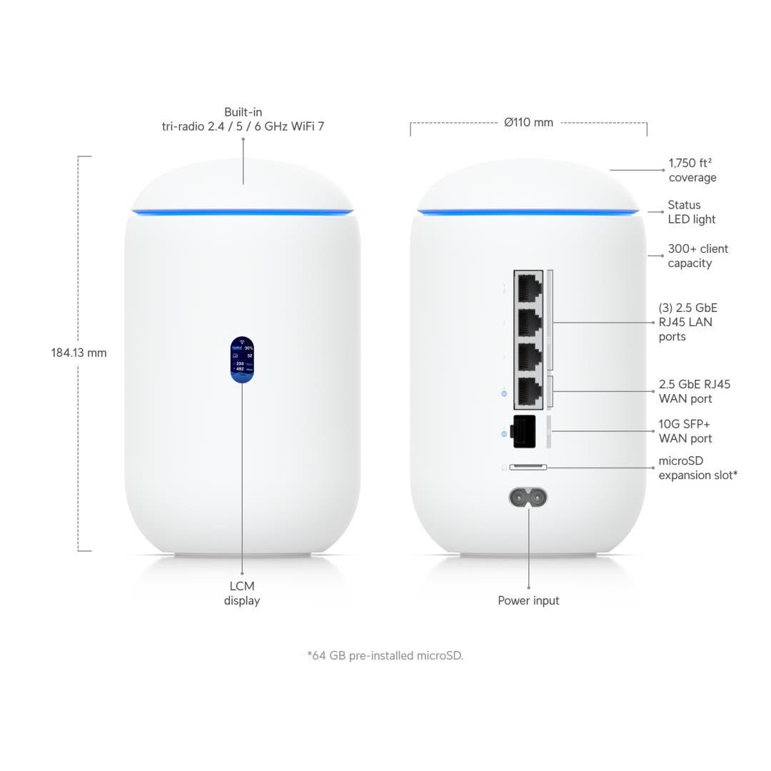 UDR7|Network Device Type Router|1x2.5GbE|1xSFP+|Memory (RAM) 3GB|Dimensions Ø110 x 184.1 mm