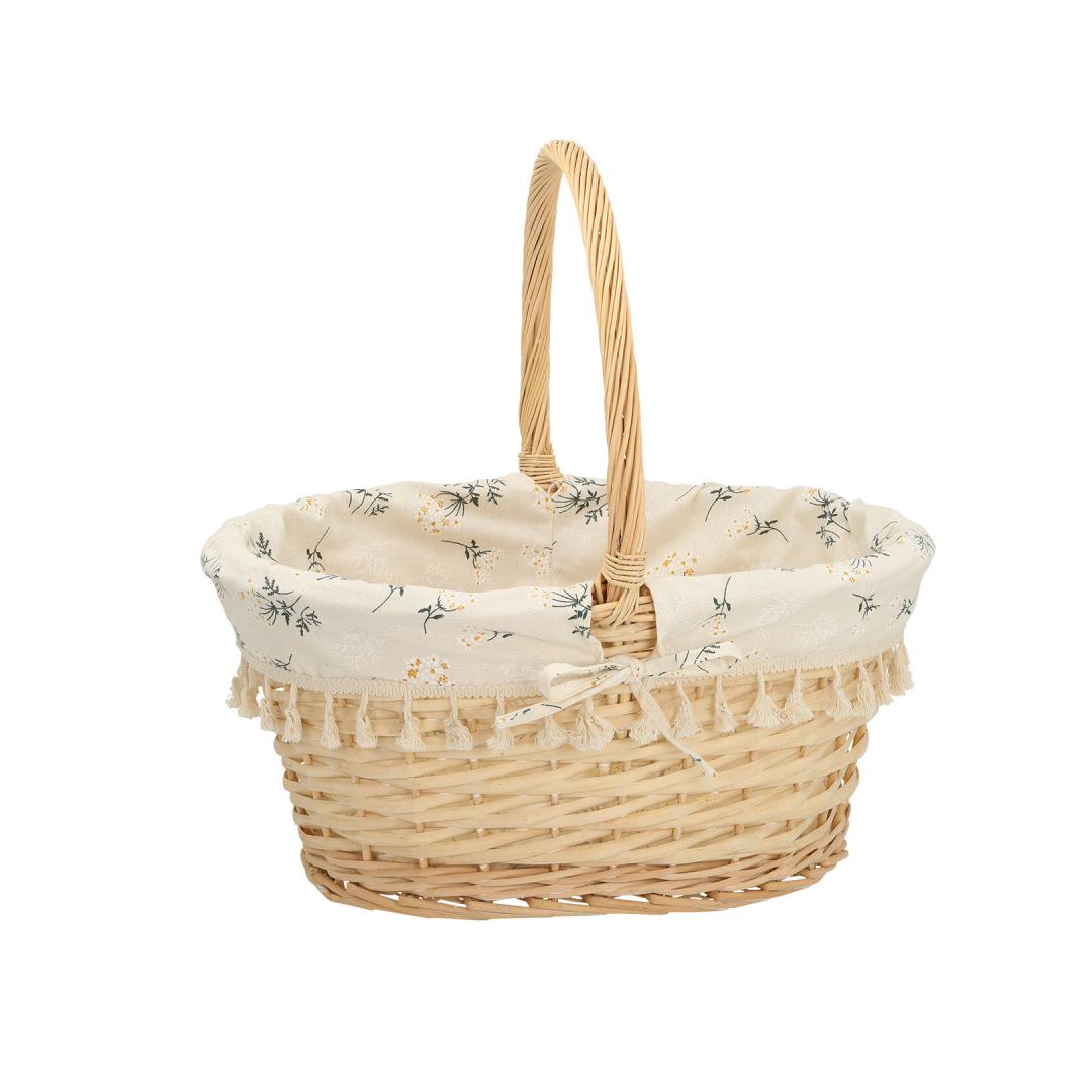 Tekstiilvooder: puuvillane lilleline kangas. Korvi materjal: käsitsi punutud naturaalne pajuvits.