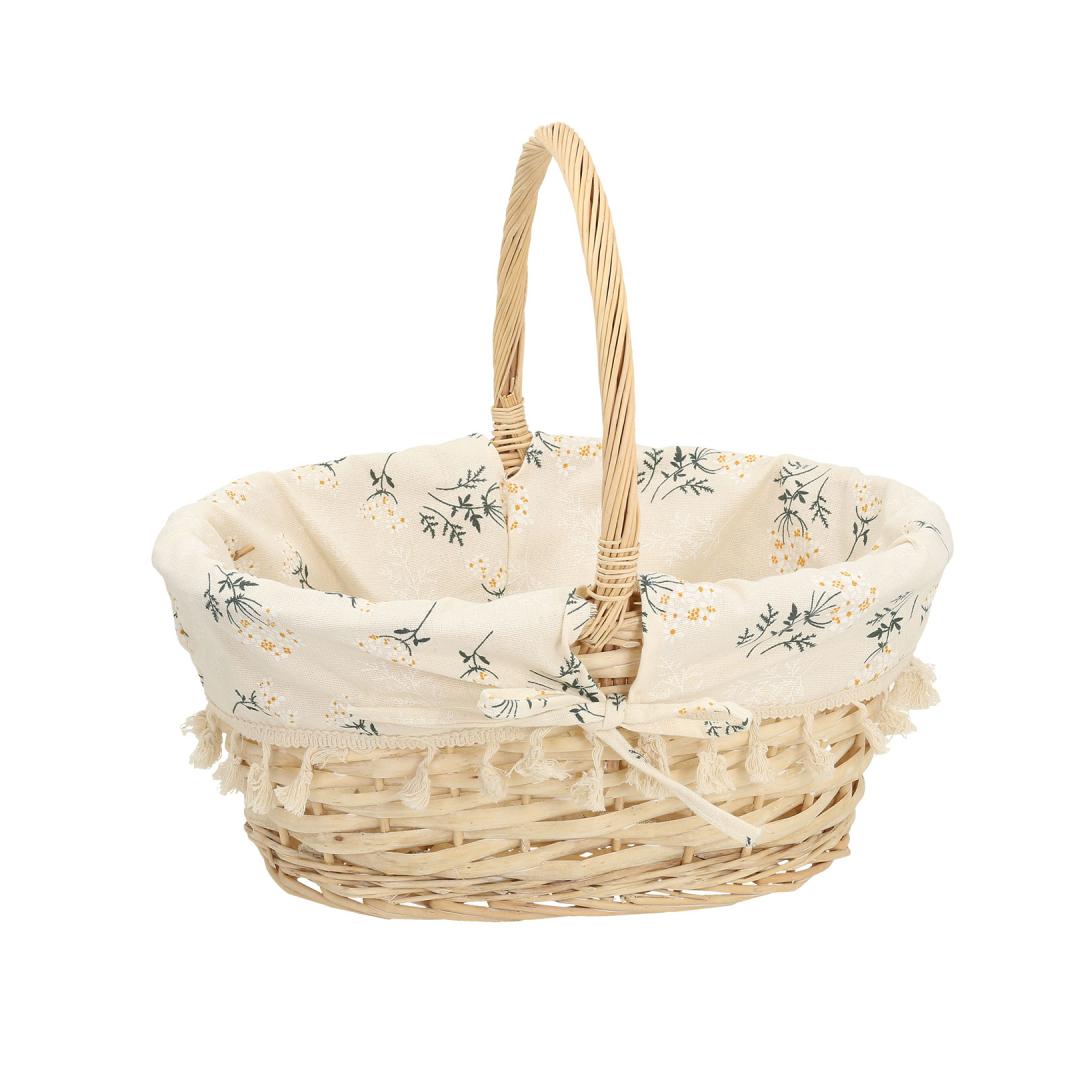 Tekstiilvooder: puuvillane lilleline kangas. Korvi materjal: käsitsi punutud naturaalne pajuvits.