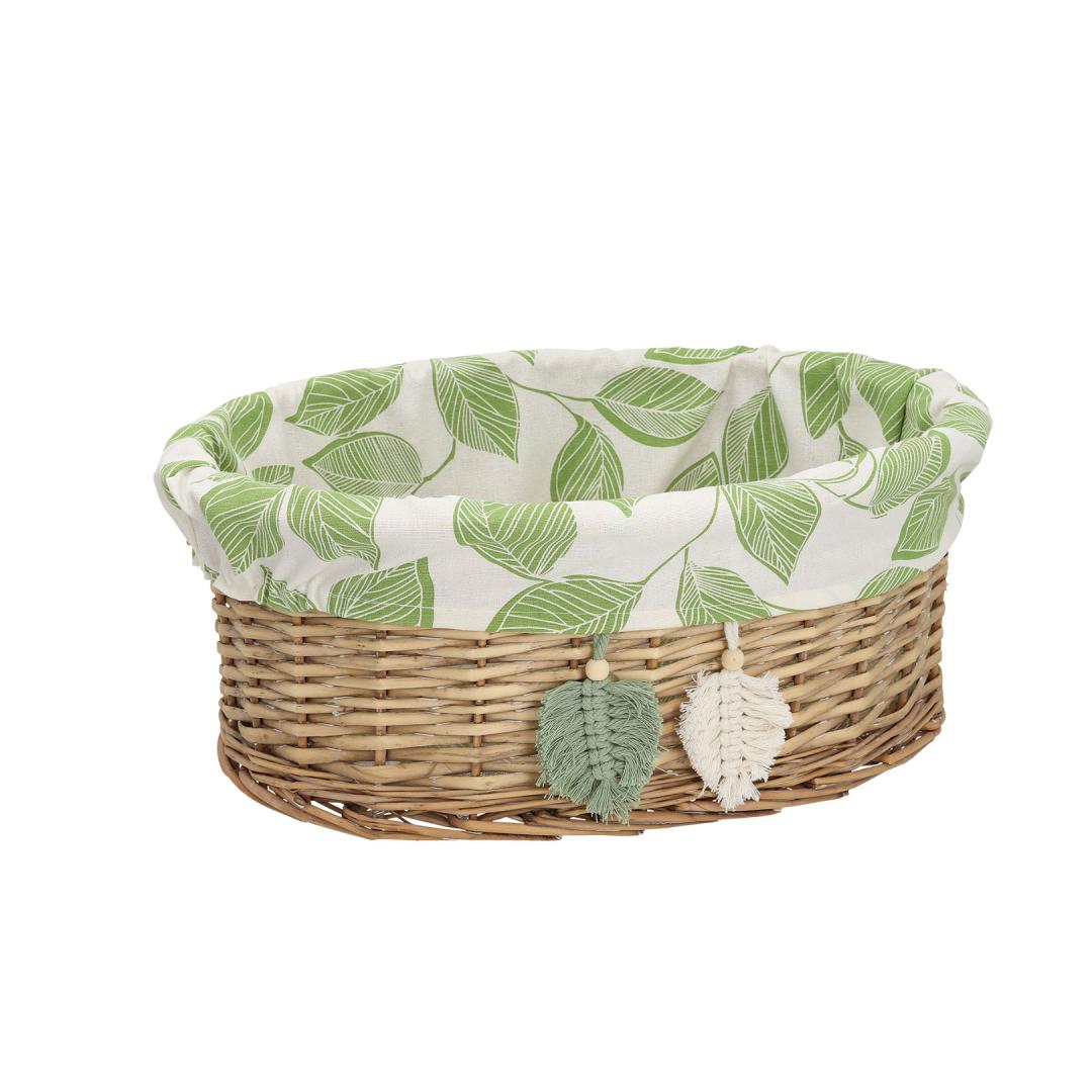 Tekstiilvooder: puuvillane roheliste lehtedega kangas. Korvi materjal: käsitsi punutud naturaalne pajuvits.