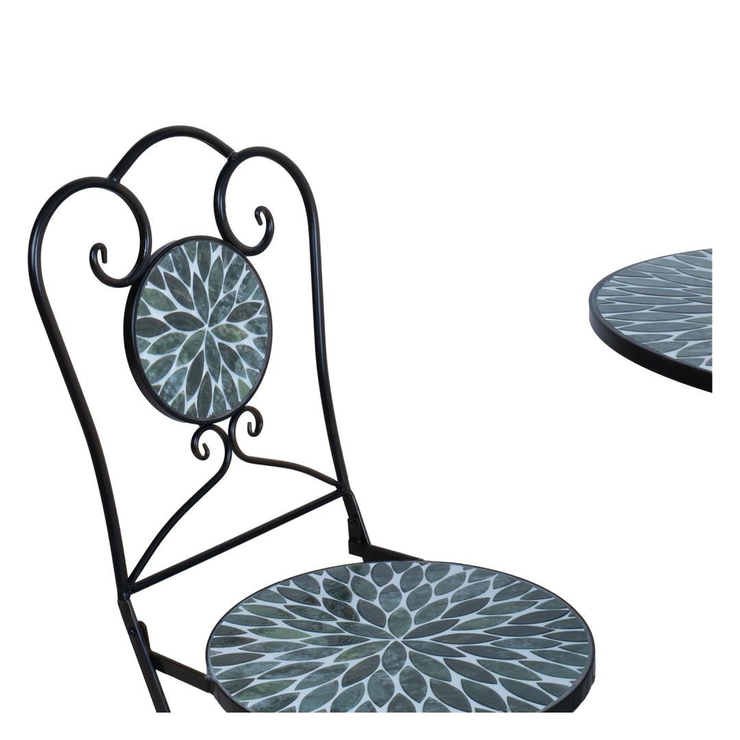 Lauaplaat ja kokkupandavate toolide iste ja seljatugi: roheliste lehemotiividega keramiline plaat.