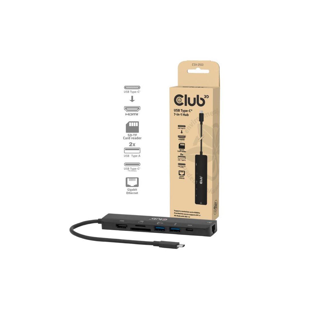 The Club 3D CSV-2553 is a USB Type-C®, 7-in-1 hub with HDMI™, 2x USB Type A, RJ45, microSD/SD card slots and Type-C® female port, providing an ideal solution for extending the port of USB Type-C® or Thunderbolt™ 3 host (PC/Laptop/tablet/Mobile phone, etc.)specially for the host with a single USB Type-C® port.