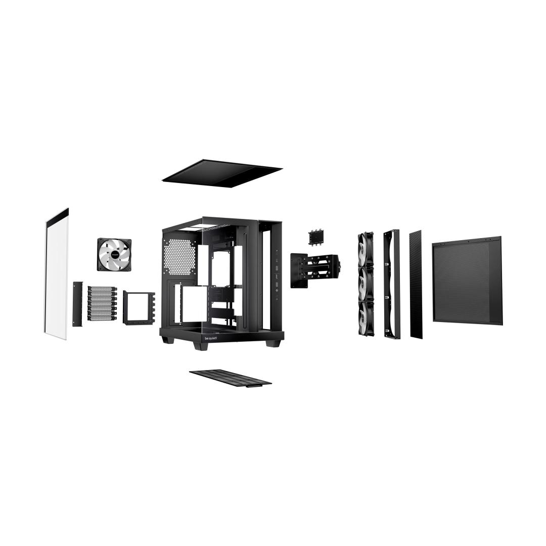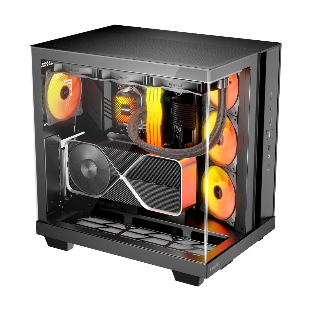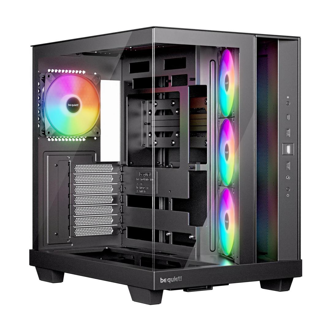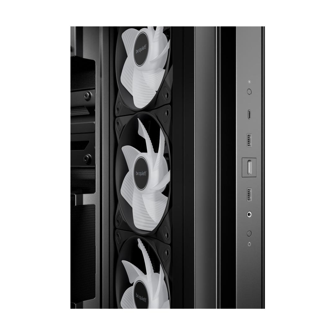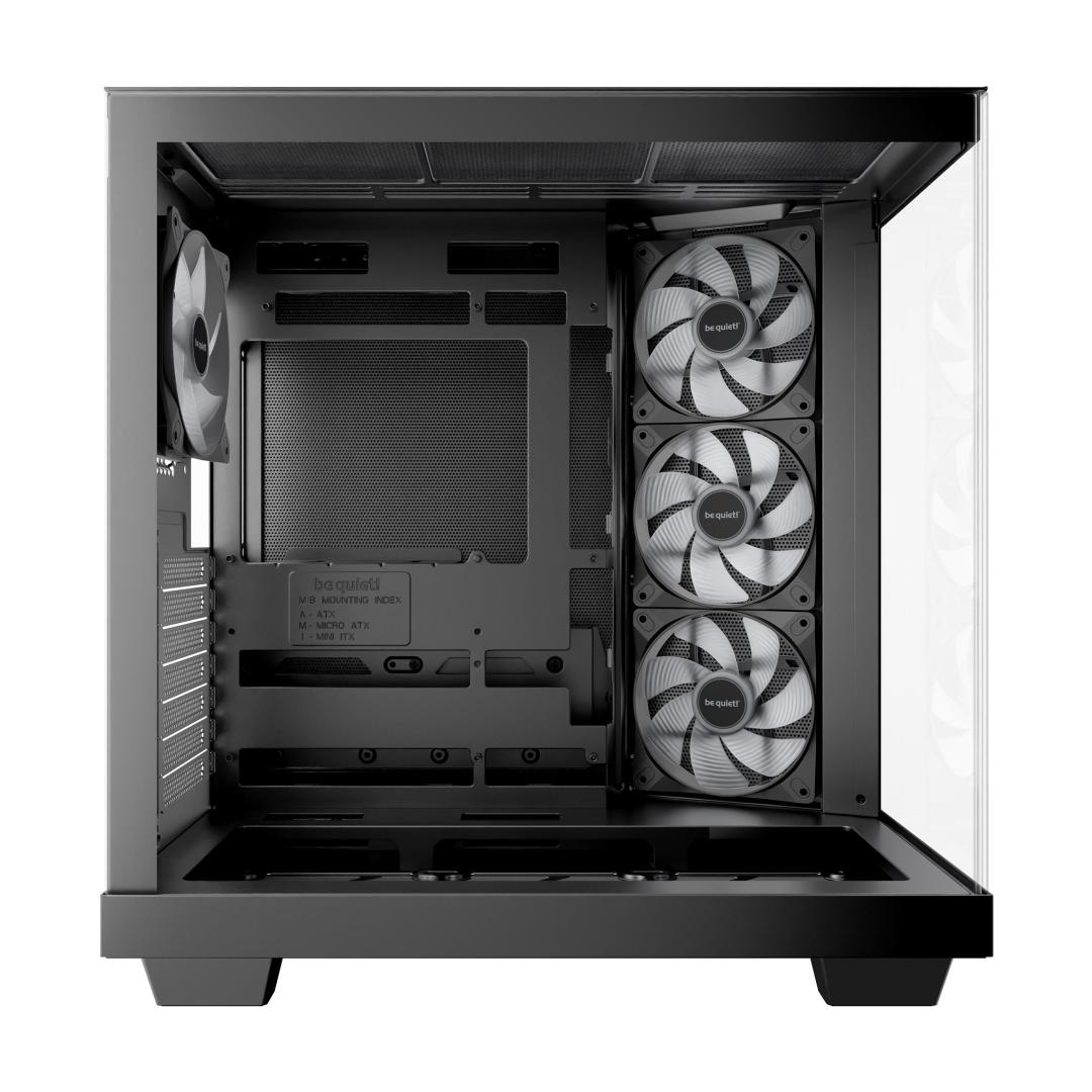 Light Base 500 LX Black features 4 preinstalled Light Wings LX fans. The rear fan is a Light Wings LX 120mm, the fans on the side are Light Wings LX 120mm PWM fans with reversed fan blades. All fans feature 16 LEDs inside their hub of the impeller, making for an unmistakable ARGB illumination. The reversed fan blades make sure that their pretty side is visible at all times.