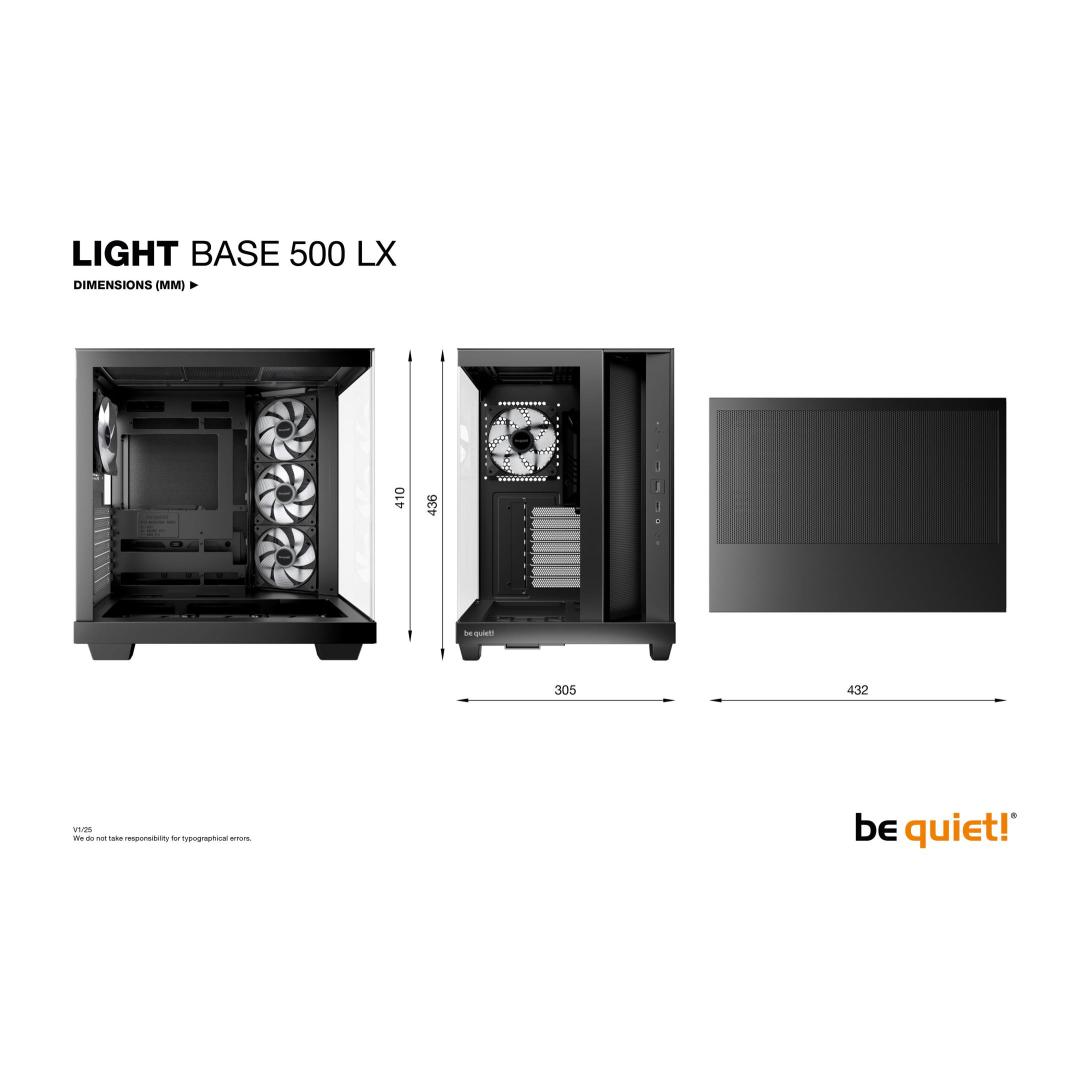 Light Base 500 LX Black might appear compact, but it comes with enough space for a 360mm radiator, an ATX motherboard and graphics cards up to 400mm length. The smart design of the drive bracket features slots for 1 HDD and 2 SSDs at the same time, without impeding the room for cable management behind the motherboard tray.