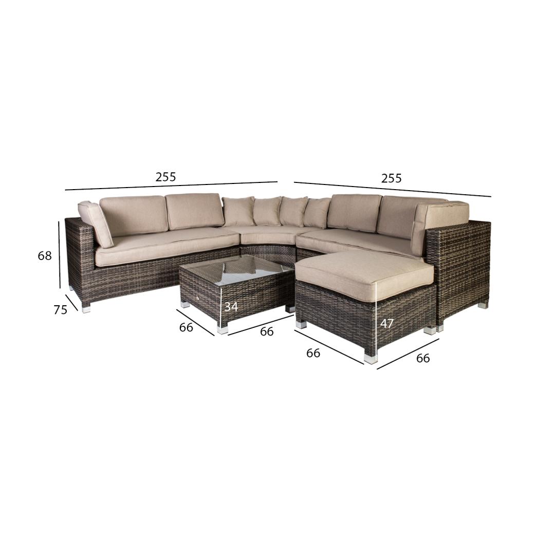 Комплект садовой мебели DAWSON стол, угловой диван и подставка для ног, темно-коричневый. Каркасы всех частей набора изготовлены из стали и покрыты пластиковой оплеткой темно-коричневого цвета. Мягкие подушки обеспечивают комфорт при сидении. Диван состоит из трех частей: угловой модуль 110х110хВ68см, правый и левый 2-местные модули 145х75хВ68см. Габаритные размеры дивана 255х255хВ68см, высота сиденья 34+13см. Размеры стола 66x66xH34см, столешница: закаленное проникающее стекло толщиной 5 мм. Размеры шкафа 66х66хВ34+13см. В комплект входят 4 подушки для сиденья, 6 подушек для спины и 4 небольшие диванные подушки. Чехлы на подушки изготовлены из полиэстера бежевого цвета. Изделие устойчиво к изменяющимся погодным условиям и очень простое в уходе, только подушки нуждаются в защите от погодных условий. Чтобы продлить срок службы садовой мебели, мы рекомендуем использовать чехлы для садовой мебели. ХРАНЕНИЕ: В конце летнего сезона рекомендуем хранить садовую мебель в помещении. Перед хранением очистите и высушите мебель. Для хранения используйте сухое и хорошо проветриваемое помещение.