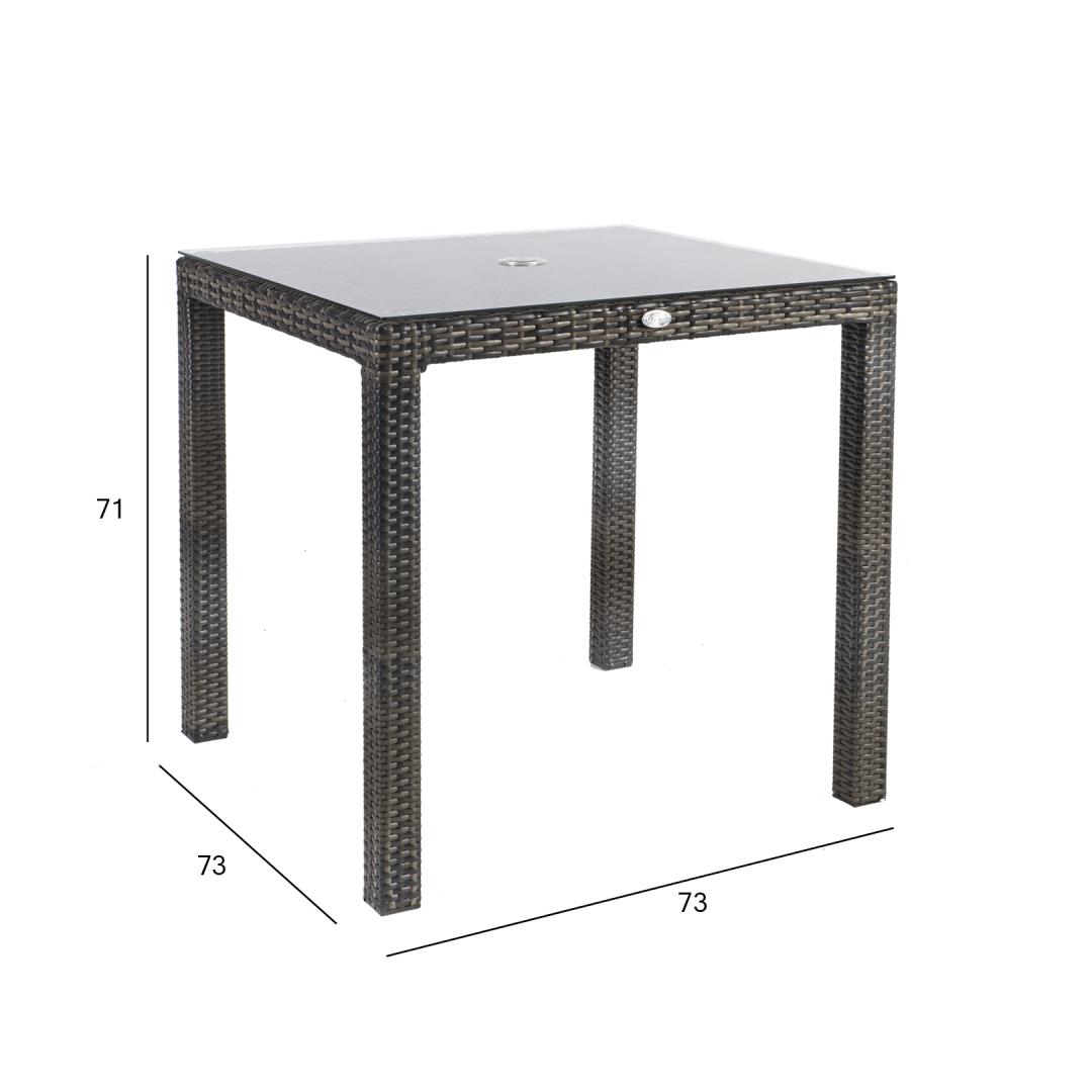 Стол WICKER 73x73xH71см, темно-коричневый. Столешница: прозрачное закаленное стекло толщиной 5 мм. Алюминиевый каркас стола с порошковым покрытием покрыт пластиковой оплеткой. Изделие обладает высокой устойчивостью к изменению погодных условий и не требует специального ухода. Чтобы продлить срок службы садовой мебели, мы рекомендуем использовать чехлы для садовой мебели. ХРАНЕНИЕ: В конце летнего сезона рекомендуем хранить садовую мебель в помещении. Перед хранением очистите и высушите мебель. Для хранения используйте сухое и хорошо проветриваемое помещение.