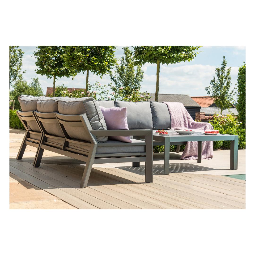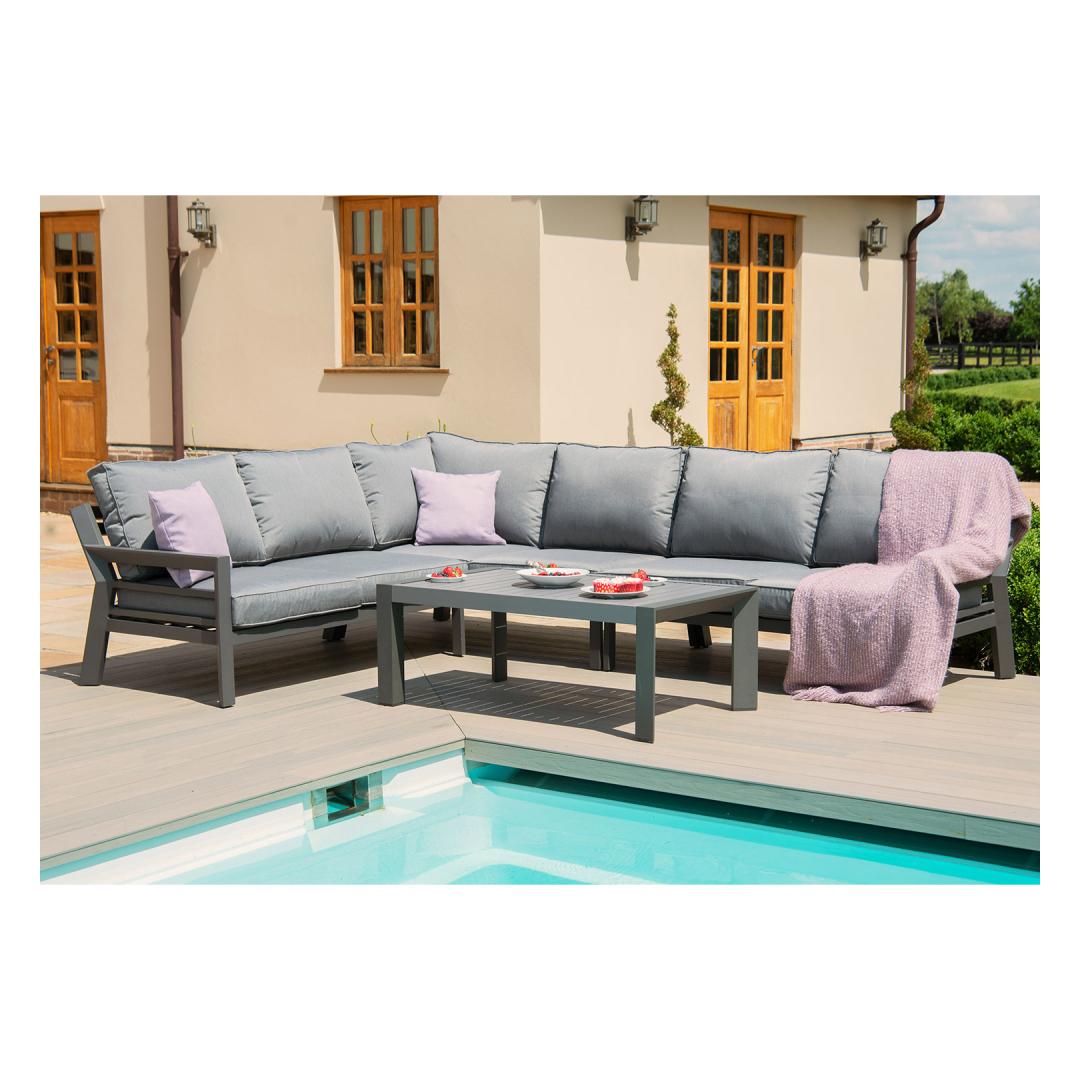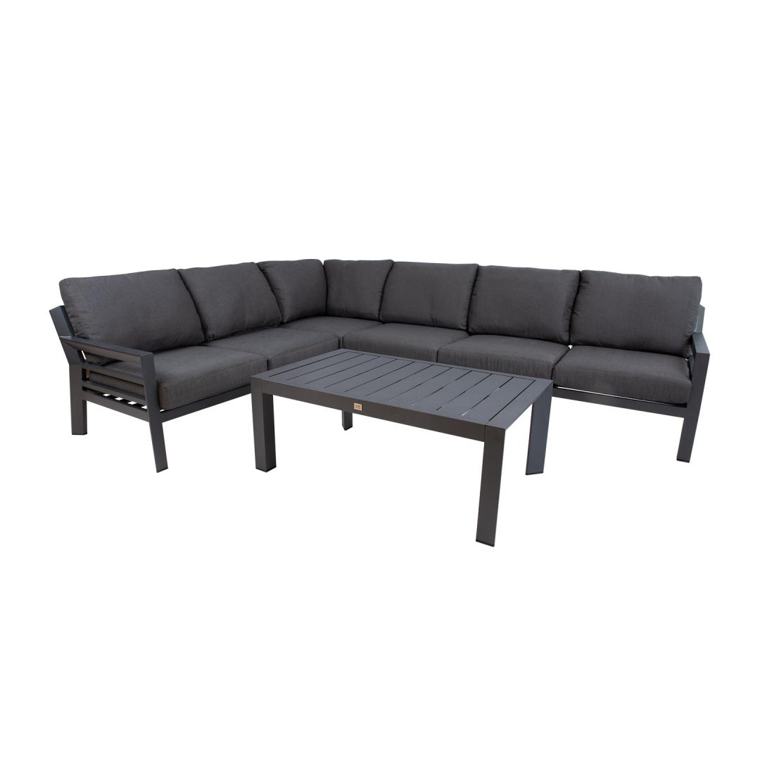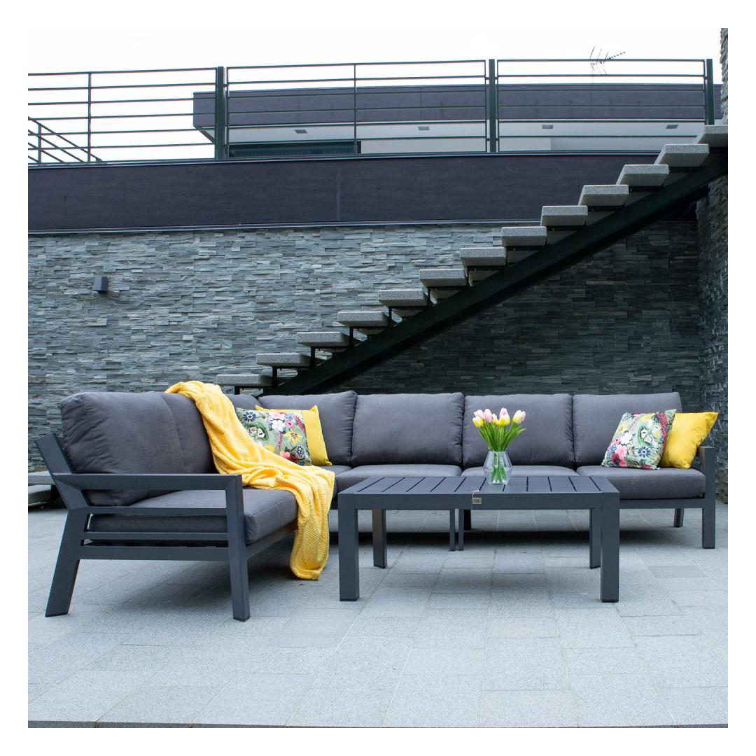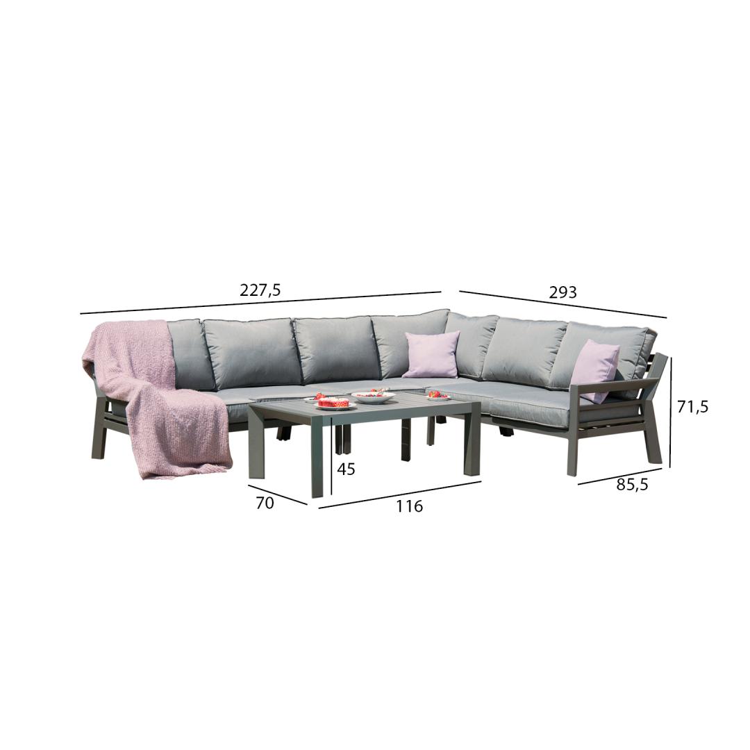 Комплект садовой мебели TOMSON стол и угловой диван, серый. Диван и стол изготовлены из алюминия и окрашены порошковой краской темно-серого цвета. Угловой диван состоит из трех частей: 2-местная часть с левым подлокотником 142х85,5хВ71,5см, 2-местная часть с правым подлокотником 142х85,5хВ71,5см, 2-местная угловая часть 151х85,5хВ71,5см. Размеры стола 116x70xH45см. В комплект входят 6 подушек для сиденья и 7 подушек для спинки. Чехлы на подушки изготовлены из серой олефиновой ткани. Изделие очень прочное в изменяющихся погодных условиях и простое в уходе. Только подушки нуждаются в защите от непогоды. Чтобы продлить срок службы садовой мебели, мы рекомендуем использовать чехлы для садовой мебели. ХРАНЕНИЕ: В конце летнего сезона рекомендуем хранить садовую мебель в помещении. Перед хранением очистите и высушите мебель. Для хранения используйте сухое и хорошо проветриваемое помещение.