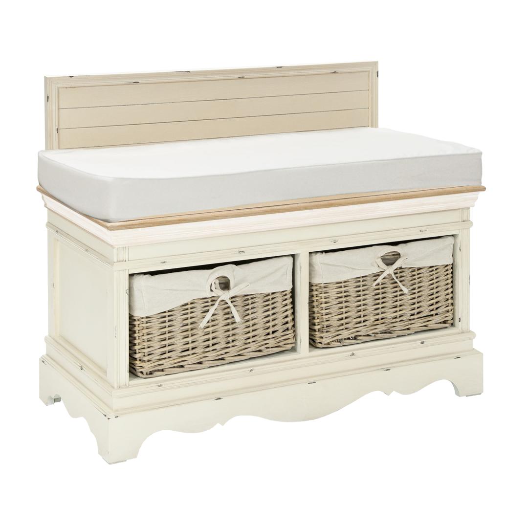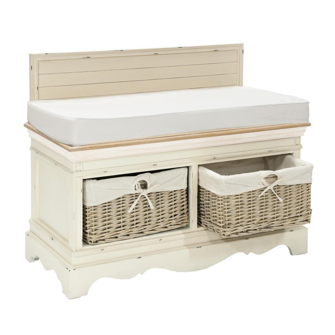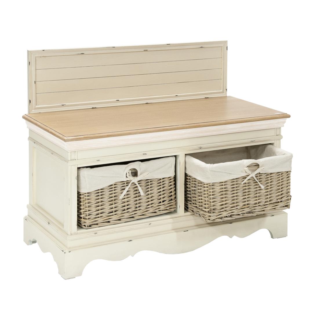 Прихожая скамейка САМИРА с ящиками-корзинами 90x42x70,5см, античный белый. Корпус и постамент скамейки изготовлены из островного дерева и отделаны античным белым. Сиденье из МДФ покрыто натуральным шпоном павловнии. В комплект входит пластинчатая подушка сиденья пролон. Размеры подушки 40x88xH8см. Чехол на подушку изготовлен из легкой хлопчатобумажной ткани. Под сиденьем два ящика-корзины, обитые хлопчатобумажной тканью, размером 30х37х20см.