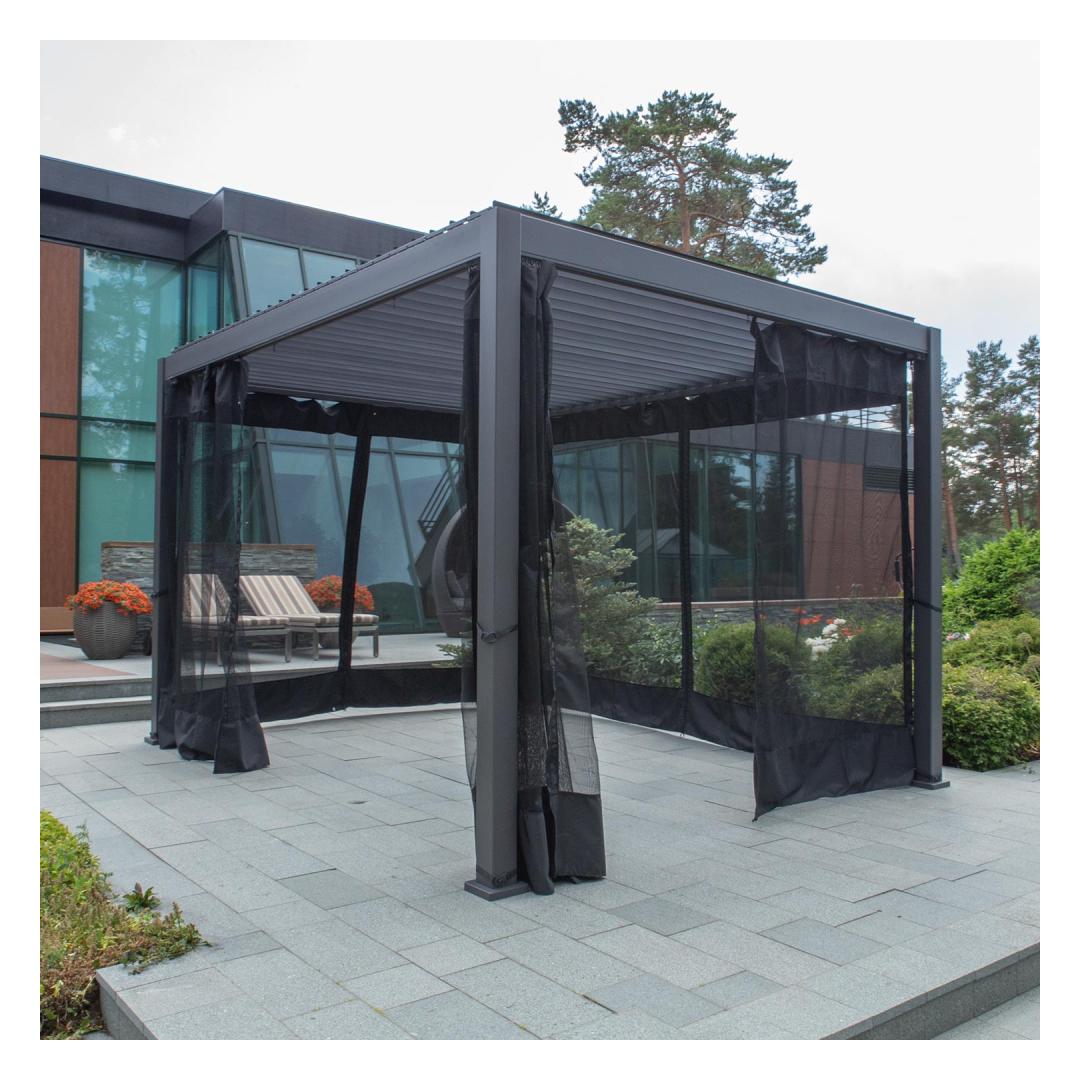 Москитная сетка для навеса МИРАДОР 3х4м. Шторы изготовлены из черной полиэфирной сетки плотностью 70 г/м². Шторы можно закрыть на молнию. В комплект входят шторы на 4 стороны балдахина. Карнизы и крючки для подвешивания штор в комплект не входят. Помимо москитных сеток в качестве дополнительного оборудования к навесу MIRADOR можно приобрести боковые шторы из полиэстера или текстиля, а также глухие или решетчатые стены. С помощью разных типов стен или штор легко изменить функциональность балдахина и придать ему приятный вид и удобство эксплуатации. ХРАНЕНИЕ: По окончании летнего сезона рекомендуем снять москитные сетки с навеса. Перед хранением очистите и высушите противомоскитные сетки. Для хранения используйте сухое и хорошо проветриваемое помещение.