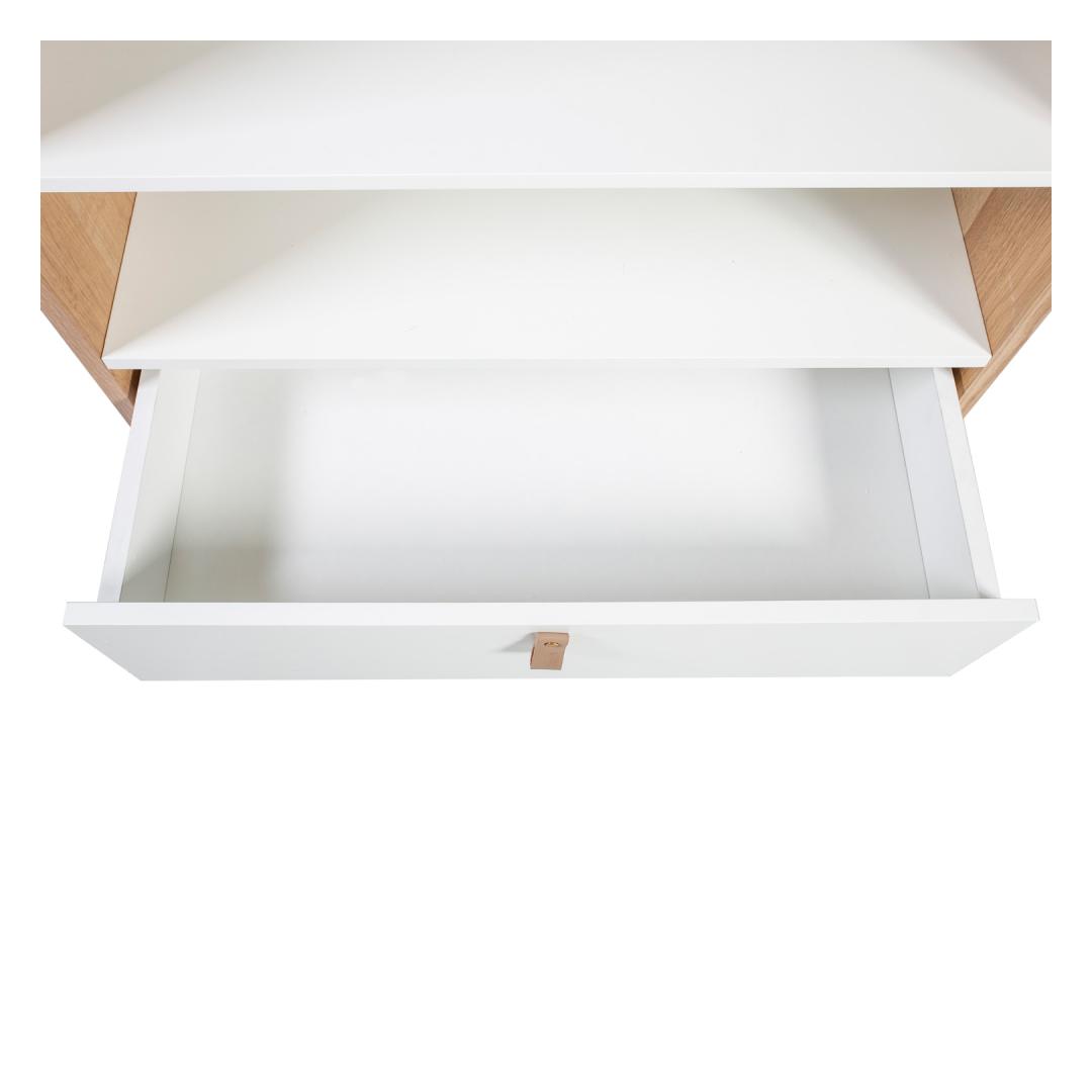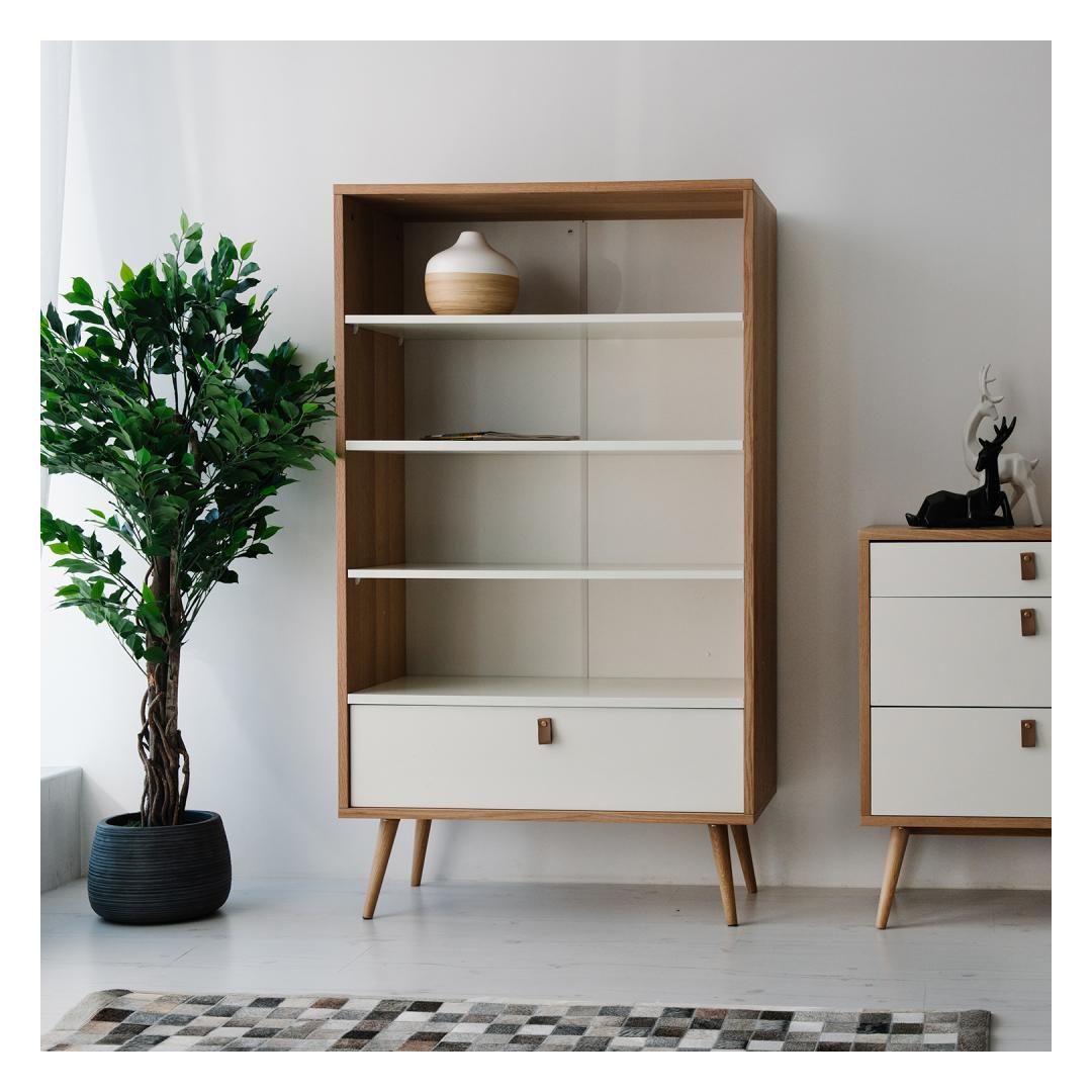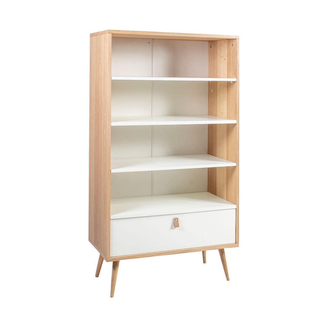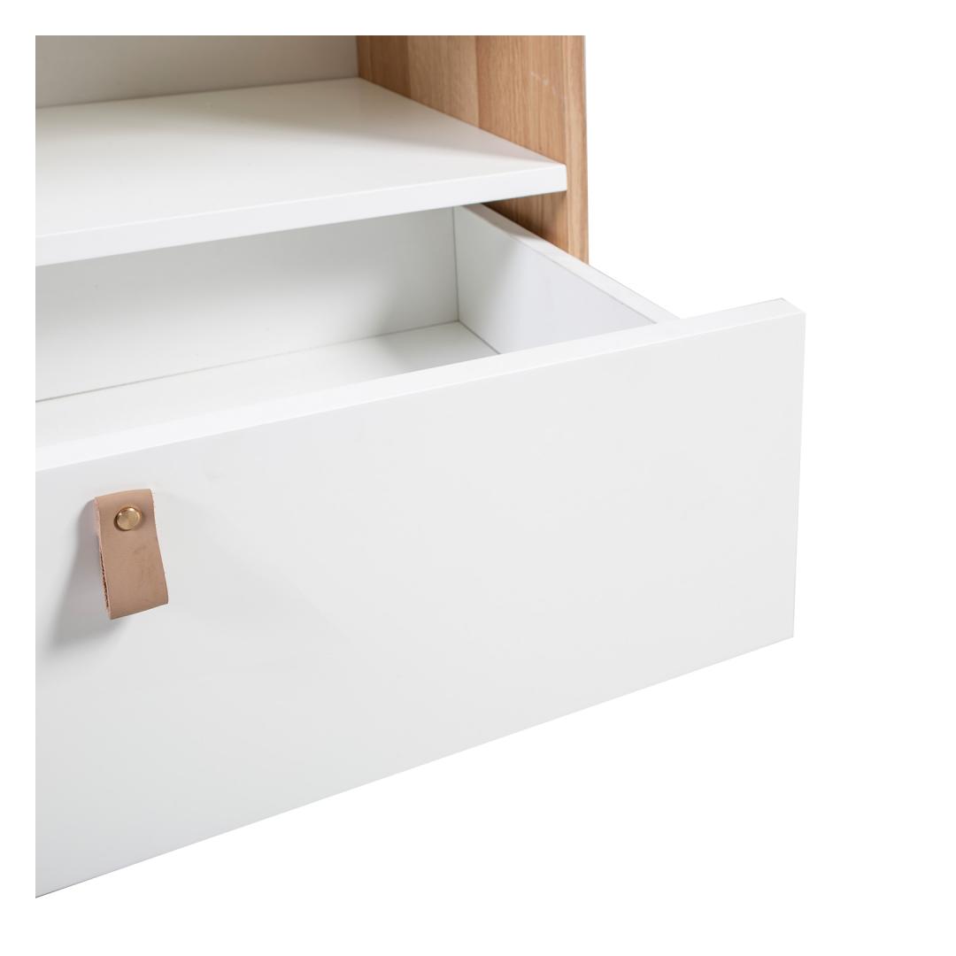 Полка HELENA WHITE с ящиком 80x40xH140см. Внешний корпус: плита МДФ толщиной 18 мм, покрытая натуральным шпоном дуба. Фронтальная панель ящика и промежуточные полки: белая плита МДФ. Ручка из синтетической кожи. Дубовые ножки.
