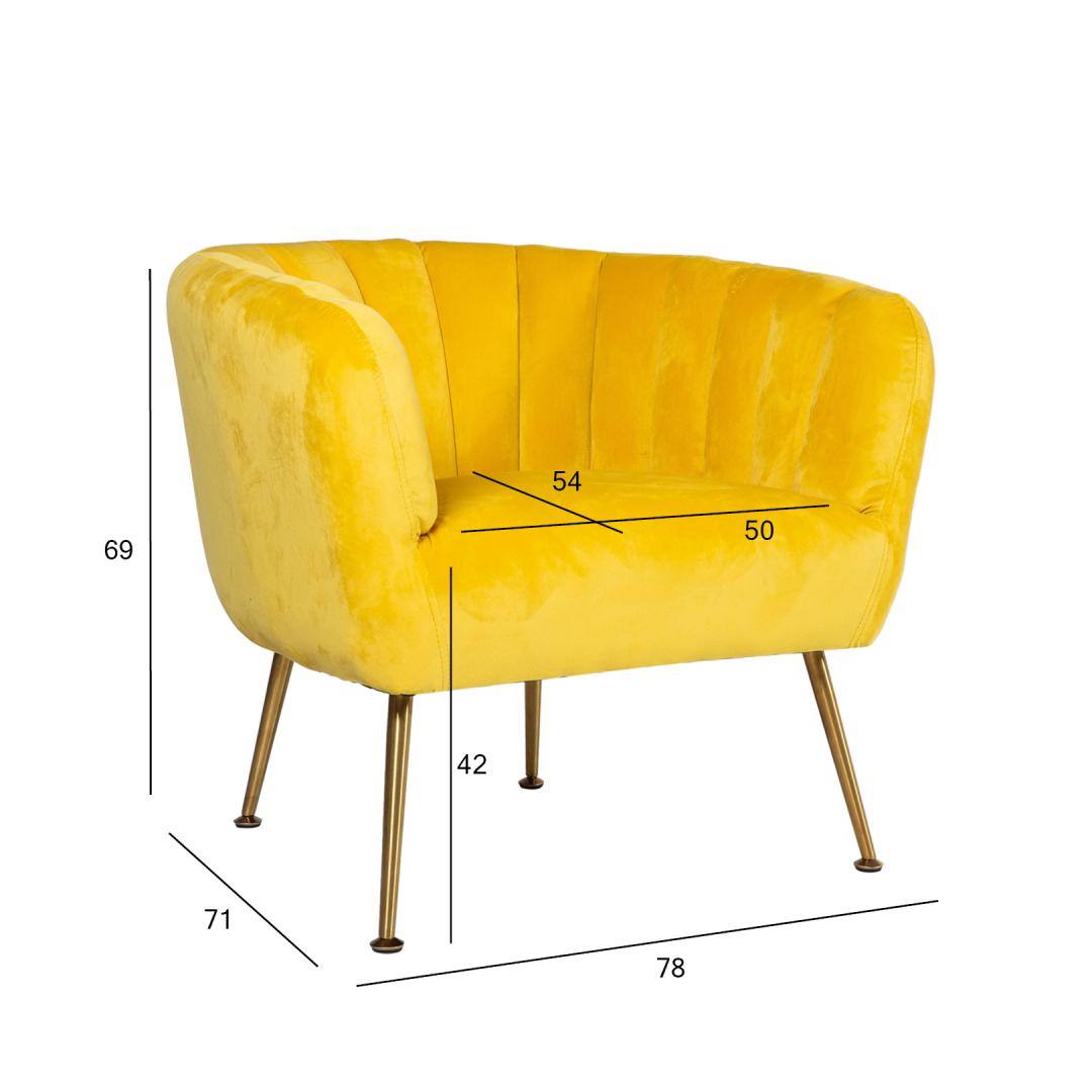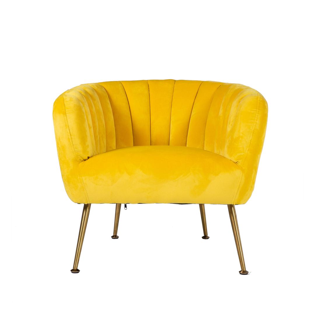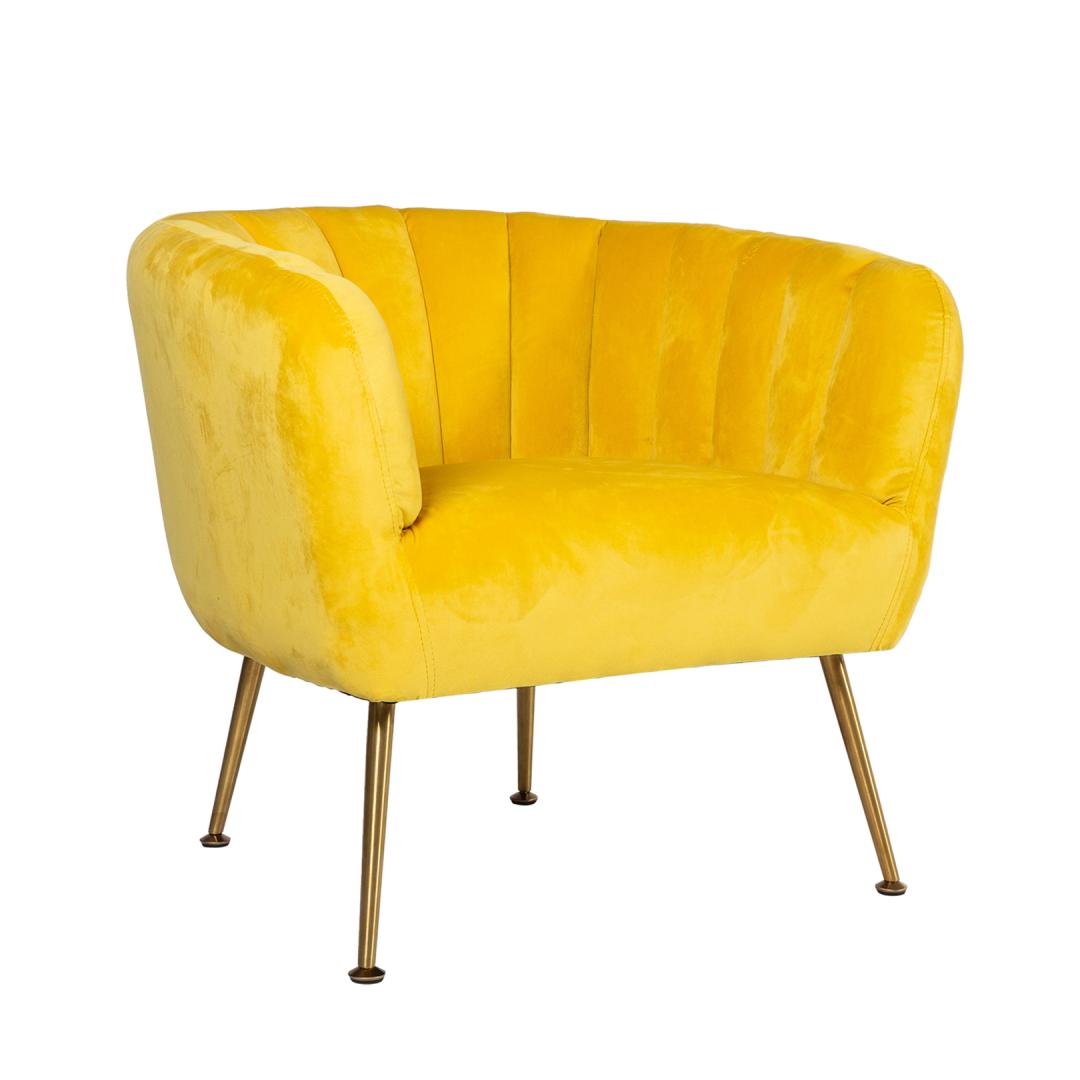 Кресло TUCKER желтый. Кресло обтянуто желтой бархатной тканью. Материал чехла - 100% полиэстер. Кресло имеет золотые ножки из нержавеющей стали. Размеры изделия 78x71xH69см.