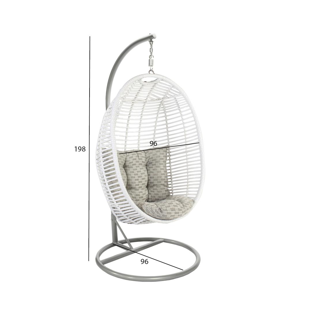 Подвесной стул CORA 96x96xH198см, белый. Превратите свою летнюю гостиную в оазис отдыха с помощью модного подвесного кресла! Приятно качающаяся корзина с мягкой подушкой обеспечивает приятную тень и достаточно открыта, чтобы наслаждаться солнечной летней погодой. Подвесное кресло также подходит для использования в помещении. Прочная стальная ножка подвесного стула окрашена порошковой краской серого цвета. Стальной каркас корзины с порошковым покрытием покрыт белой пластиковой оплеткой. В комплект поставки входят 2 подушки. Чехлы на подушки изготовлены из полиэстера серого цвета. Размеры подушек Д70хВ10см и 72х58х8см. Размеры корзины 90х65х123см. Ограничение по весу 120 кг. Изделие долговечно в изменяющихся погодных условиях и очень просто в уходе. Только подушки нуждаются в защите от непогоды. Чтобы продлить срок службы садовой мебели, мы рекомендуем использовать чехлы для садовой мебели. ХРАНЕНИЕ: В конце летнего сезона рекомендуем хранить садовую мебель в помещении. Перед хранением очистите и высушите мебель. Для хранения используйте сухое и хорошо проветриваемое помещение.