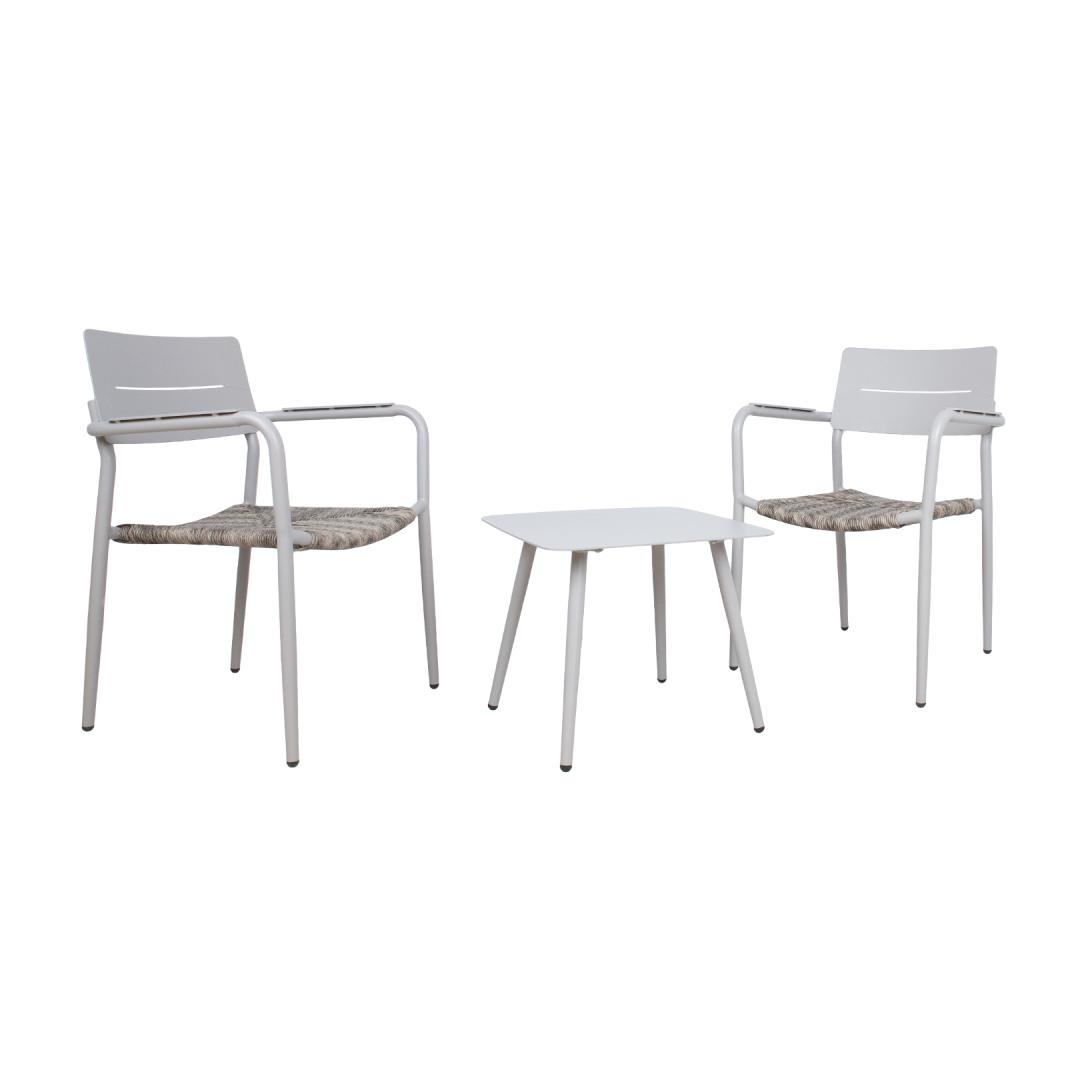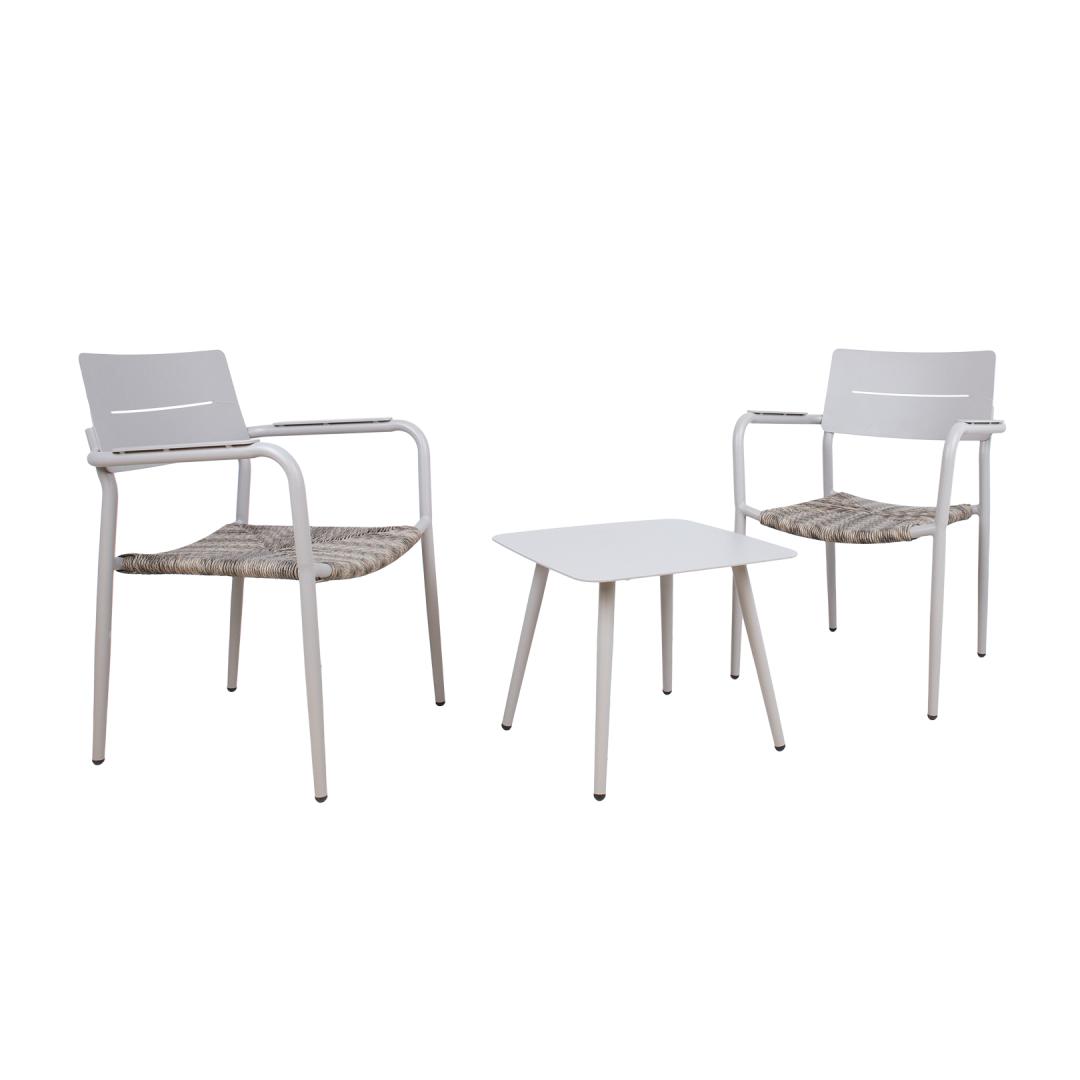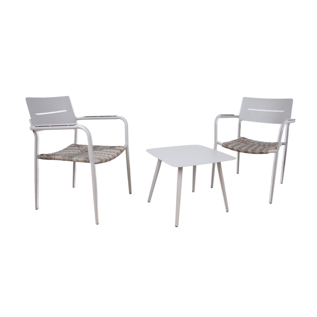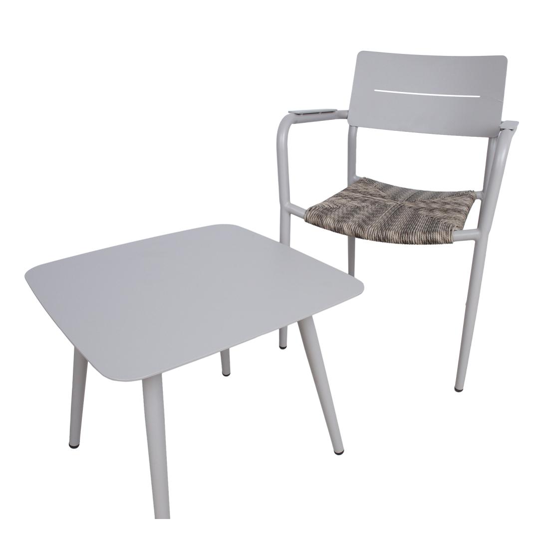 Балконный комплект COCORA стол и 2 стула. Каркасы столов и стульев, столешница и спинки стульев изготовлены из алюминия и окрашены порошковой краской серо-бежевого цвета. Основание сиденья стула покрыто веревочной тесьмой. Размеры стола 50x50xH42см, толщина столешницы 4мм. Размеры стула 57х58хВ81см, ширина сиденья 39см, глубина сиденья 49см, высота сиденья 42см, высота спинки 42см, высота подлокотника от земли 65см. Ограничение по весу 110 кг. Стулья штабелируются. Изделие долговечно в изменяющихся погодных условиях и очень просто в уходе. ХРАНЕНИЕ: В конце летнего сезона рекомендуем хранить садовую мебель в помещении. Перед хранением очистите и высушите мебель. Для хранения используйте прохладное, сухое и хорошо проветриваемое помещение.