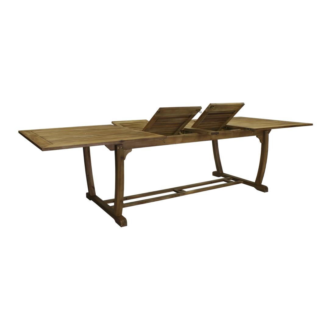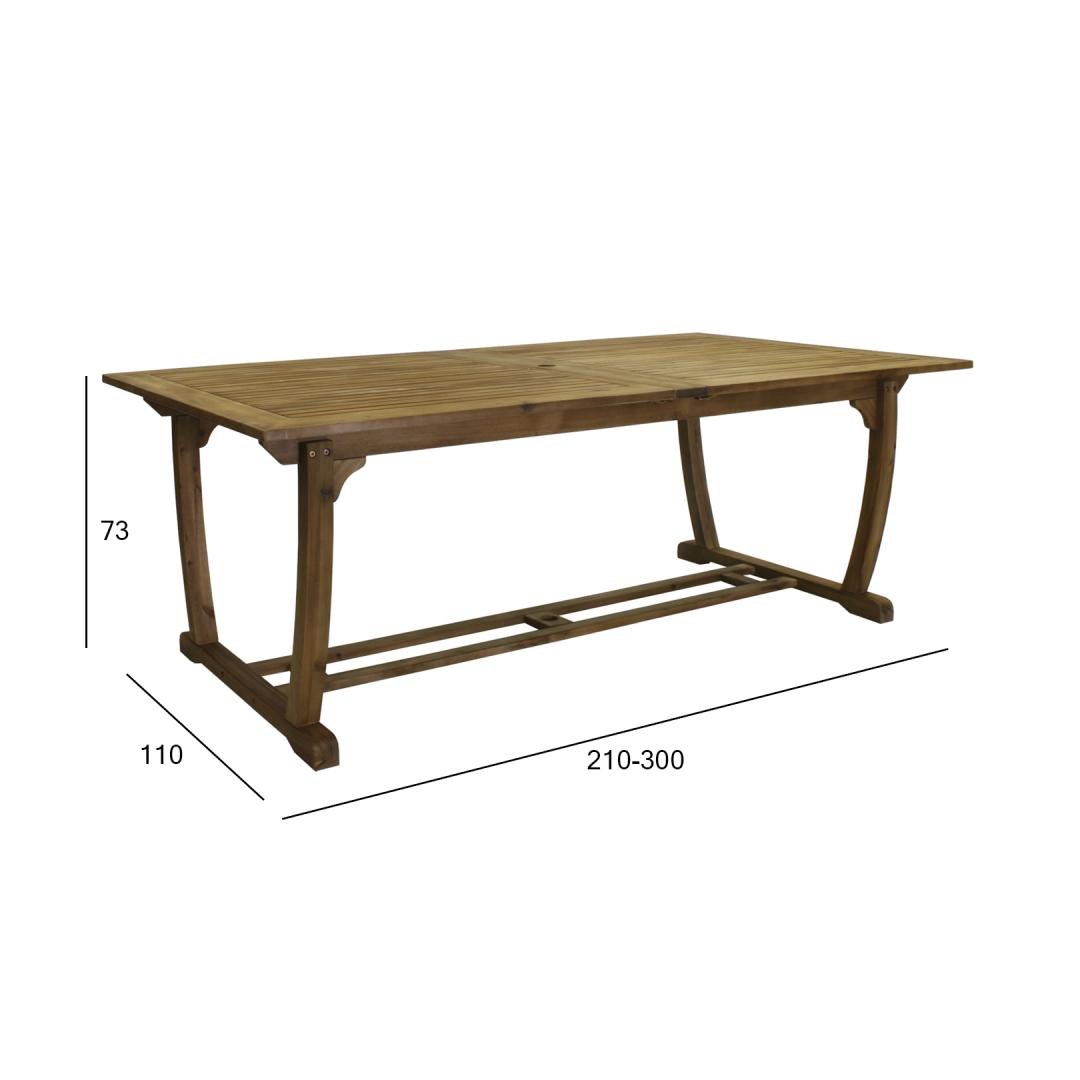 Стол БУДУЩЕЕ 210/300х110хВ73см. Стол выдвигается посередине. Под столешницей располагаются две удлинительные части шириной 45 см, которые можно сложить посередине. Расширения можно открывать независимо друг от друга по мере необходимости. Стол изготовлен из древесины акации и покрыт защитным маслом тикового цвета. УХОД: дерево – живой природный материал, внешний вид которого меняется под воздействием погодных условий. Регулярно чистите мебель, защищайте ее от лишней влаги и УФ-излучения. Легкой шлифовки и нанесения нового слоя масла хотя бы раз в год достаточно, чтобы освежить мебель и придать ей новый вид. ХРАНЕНИЕ: В конце летнего сезона рекомендуем хранить садовую мебель в помещении. Перед хранением очистите и высушите мебель. Для хранения используйте сухое и хорошо проветриваемое помещение.