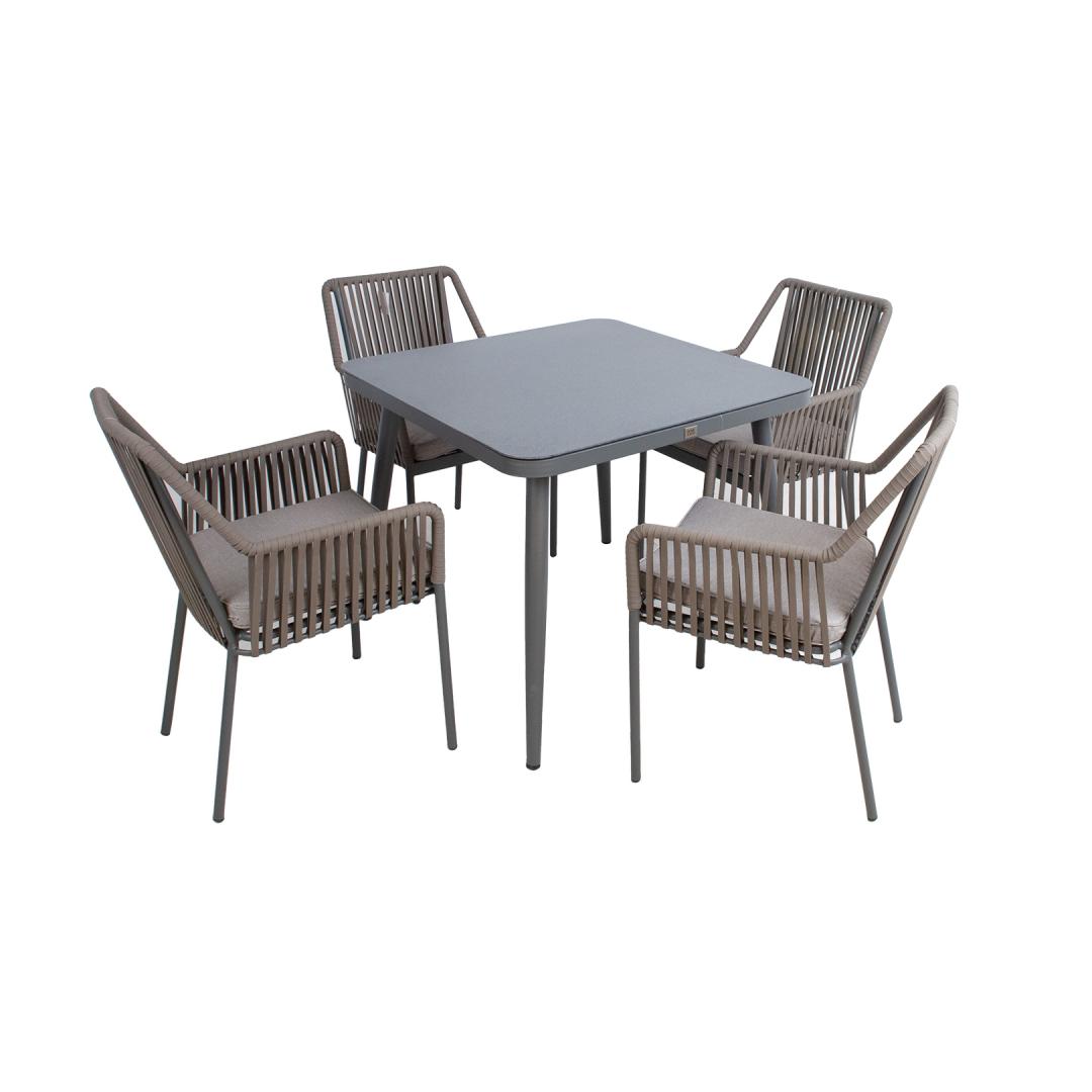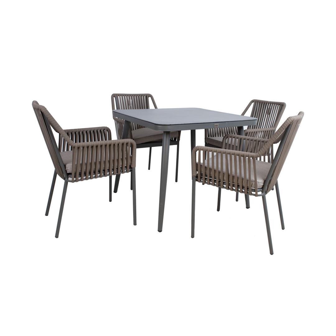 Комплект садовой мебели ANDROS стол и 4 стула. Размеры стола 90х90х75см. Столешница: 5мм серое закаленное стекло под камень. Ножки и каркас стола и стульев изготовлены из алюминия и окрашены порошковой краской серого цвета. Спинка и подлокотники стула обтянуты текстильной кордовой тесьмой. В комплекте подушки для сидения. Чехлы на подушки изготовлены из полиэфирной ткани. Толщина подушки 5 см. Основание сиденья поддерживается алюминиевыми планками. Размеры стула 56x57xH85см, высота сиденья 44см. Ограничение по весу 100 кг. Стулья можно штабелировать, а их хранение легко и компактно. Изделие устойчиво к изменяющимся погодным условиям и просто в уходе. Чтобы продлить срок службы садовой мебели, мы рекомендуем использовать чехлы для садовой мебели. ХРАНЕНИЕ: В конце летнего сезона мы рекомендуем хранить садовую мебель в помещении. Очистите и высушите мебель перед хранением. Для хранения используйте сухое и хорошо проветриваемое помещение.