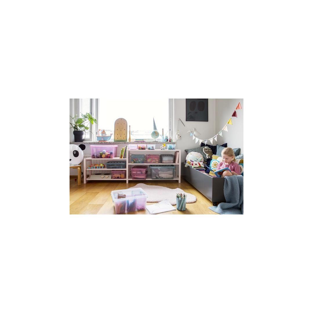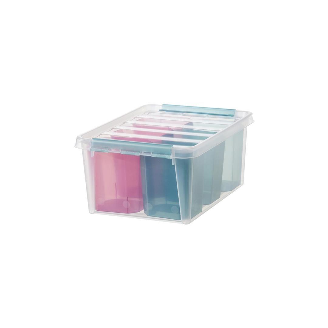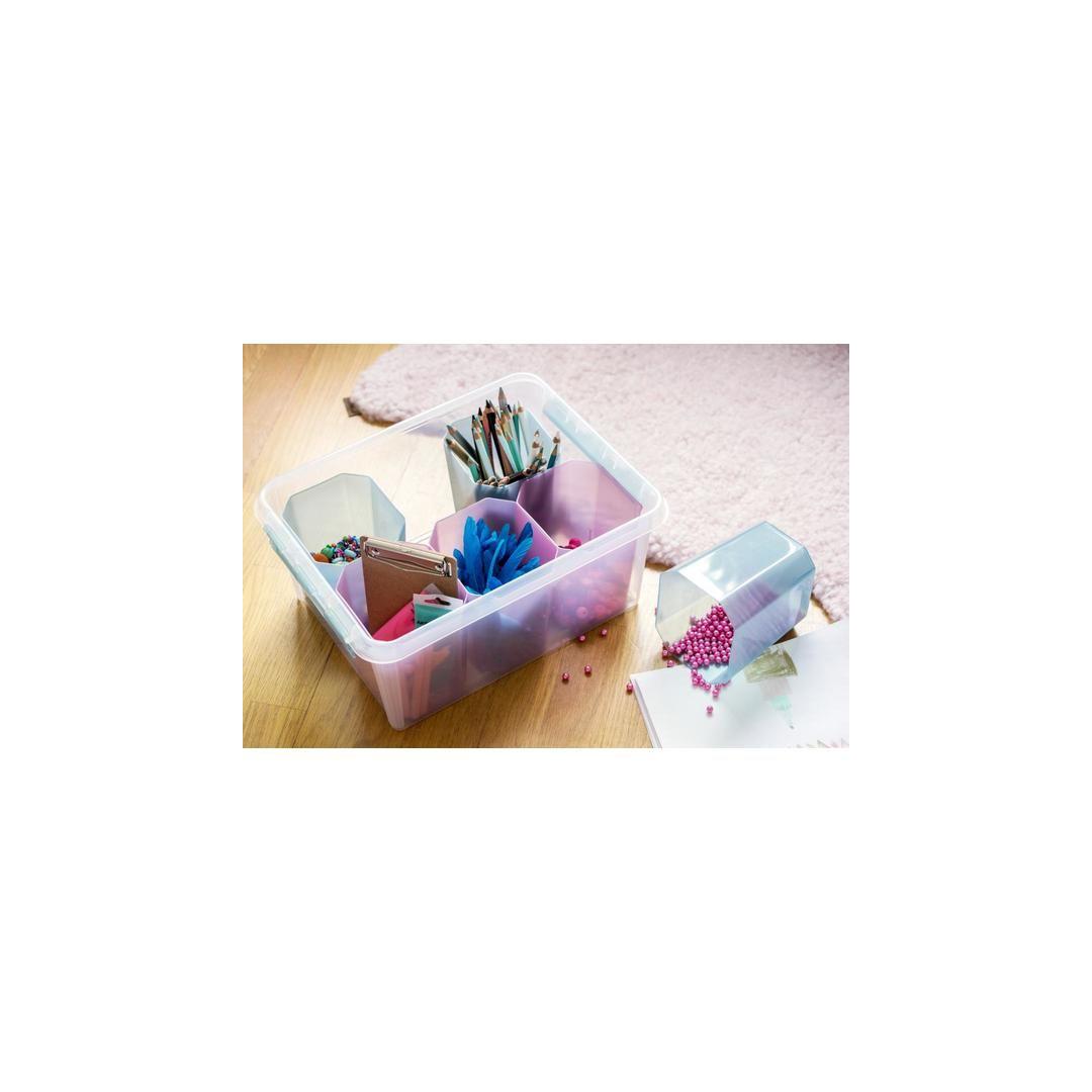 Практичный контейнер для хранения с цветными разделителями. Идеально подходит для организации хранения мелких предметов, таких как карандаши, мелки и различные принадлежности для творчества. Контейнер штабелируется, имеет крышку, а прочные защелки обеспечивают плотное закрытие крышки. Внешние размеры: 40 x 30 x 18 см Внутренние размеры: 32,7 x 24,5 x 15,5 см Объем: 14 л Прозрачный белый контейнер + 3 контейнера бирюзового цвета + 3 контейнера розового цвета Материал: пластик Цвет: прозрачный белый, светло-голубой, светло-розовый