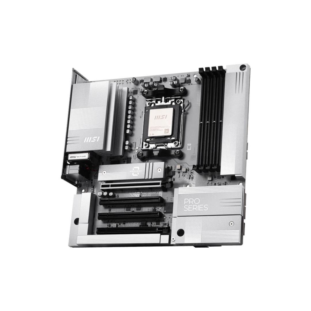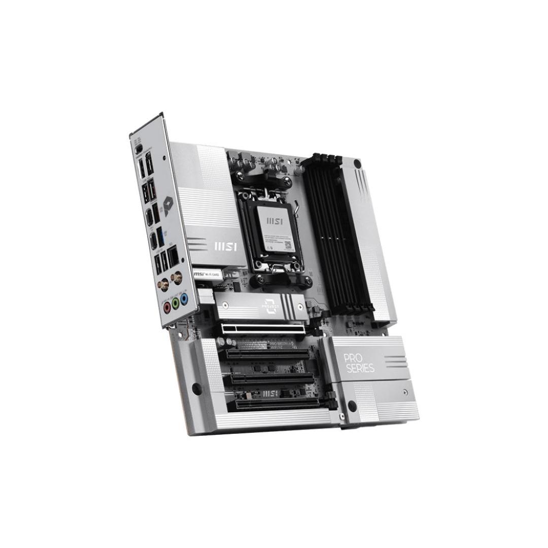 PRO B850M-A WIFI PZ offers a sleek design with a harmonious silver-white color scheme that perfectly matches white PC builds. Its innovative back-connect design reduces the complexity of cable management, resulting in an aesthetically pleasing appearance for the system. It is engineered with many exclusive features of MSI, Wi-Fi 7 with EZ Antenna, 5G LAN, PCIe 5.0 M.2, and Supplemental PCIe Power, ready for the AMD Ryzen™ 9000 series processors.