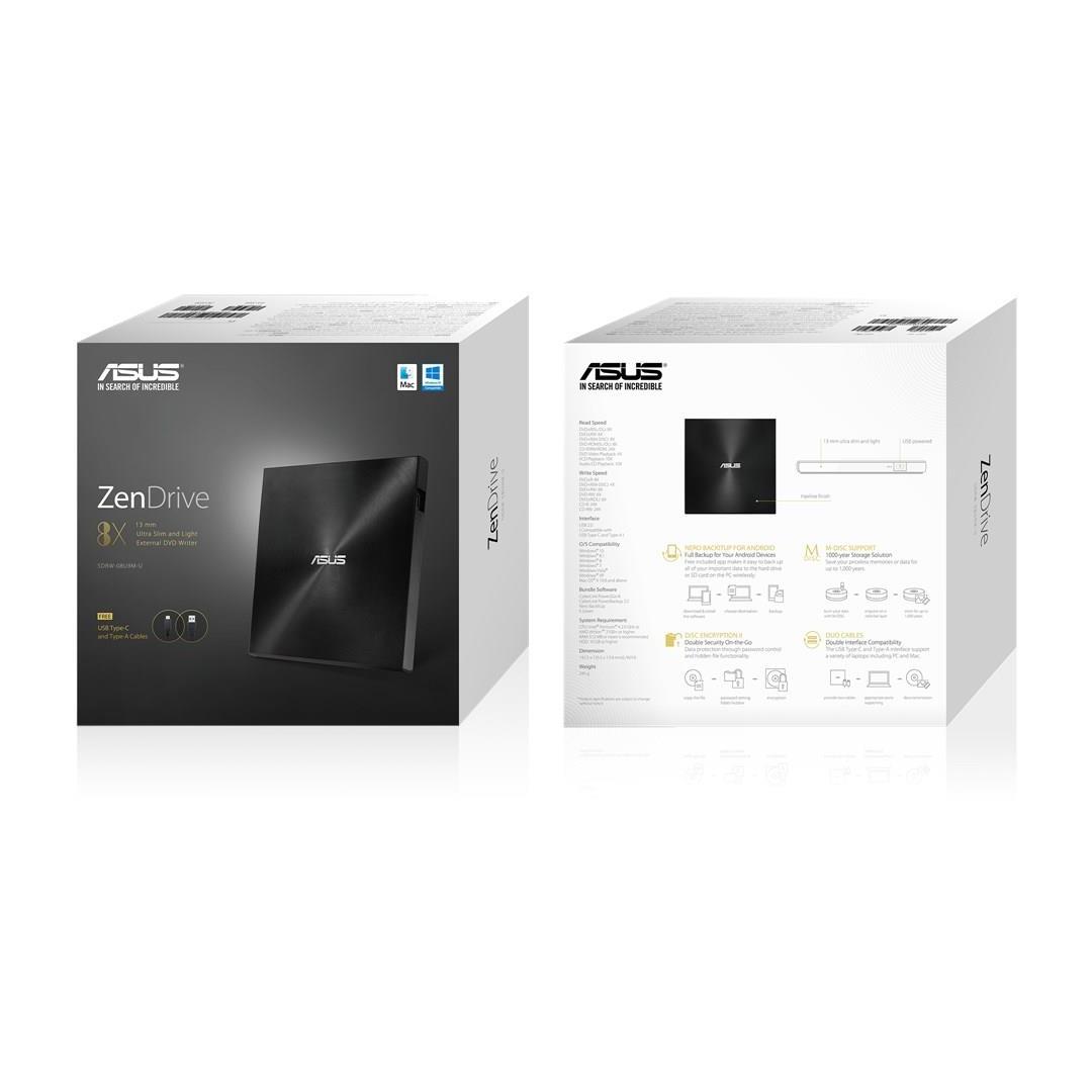 ASUS ZenDrive U9M is an ultra-slim external DVD Writer which supports USB Type-C and Type-A interfaces, provides two cables to allow data transmission including PC and Mac. Its sophisticated Zen-inspired design with concentric-circle hairline finish demonstrated the aesthetics of technology.