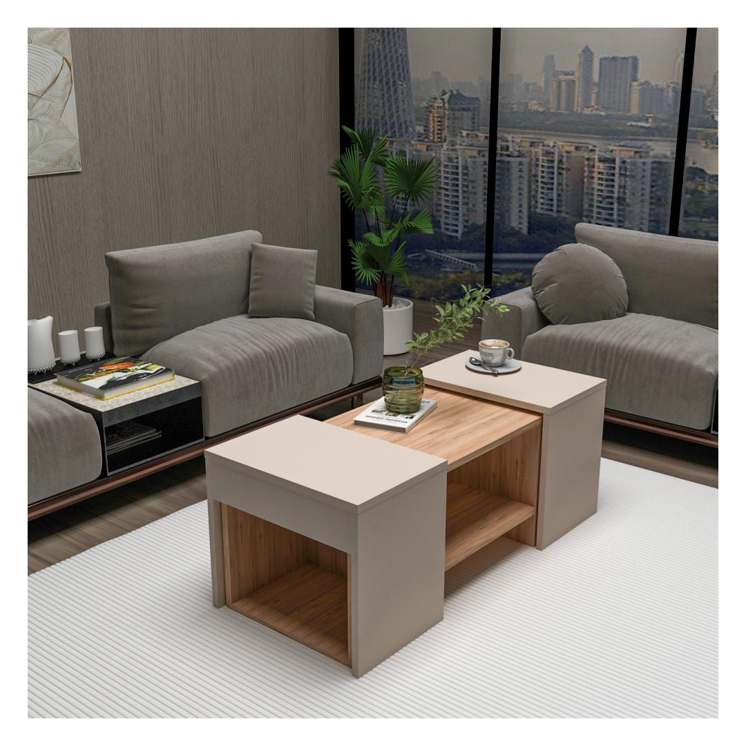 Muuda oma elutuba hubaseks ja stiilseks ruumiks meie uimastava kohvilaudade komplektiga. See 100% melamiiniga kaetud puitlaastplaadist valmistatud komplekt ei ole mitte ainult vastupidav, vaid väljendab ka elegantsust, mis tõstab teie kodu sisekujundust.