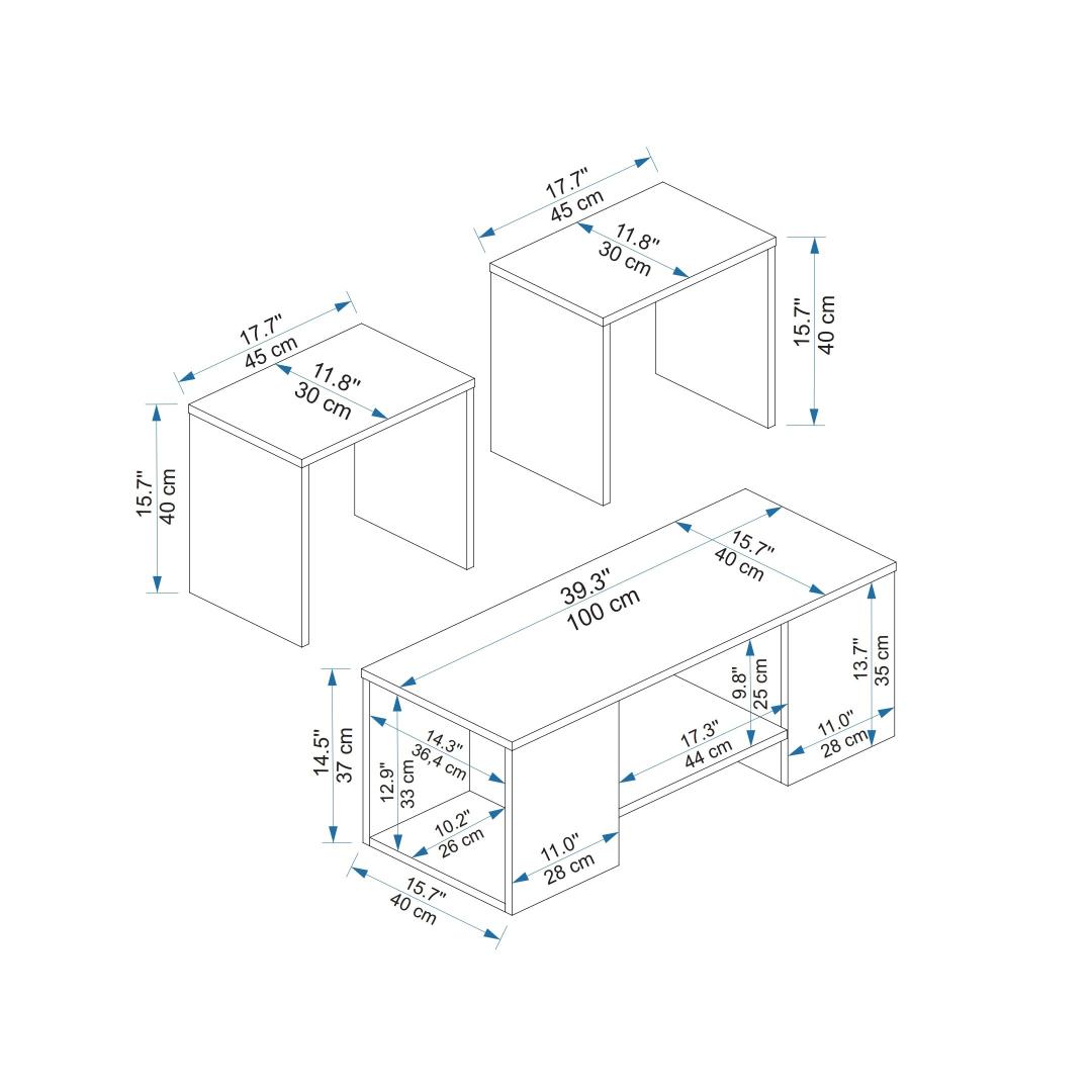 See 18 mm paksusega komplekt on vastupidav ja usaldusväärne kõigi teie vajaduste jaoks. Kohvilaud pakub piisavalt ruumi hommikukohvi või õhtuste suupistete jaoks, samas kui kaks küljelaua pakuvad täiendavat ruumi raamatute, ajakirjade või dekoratiivsete esemete jaoks.