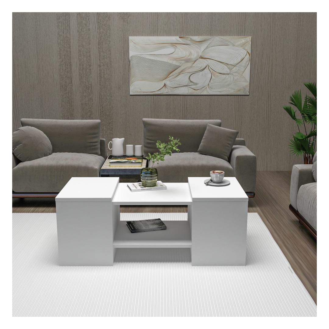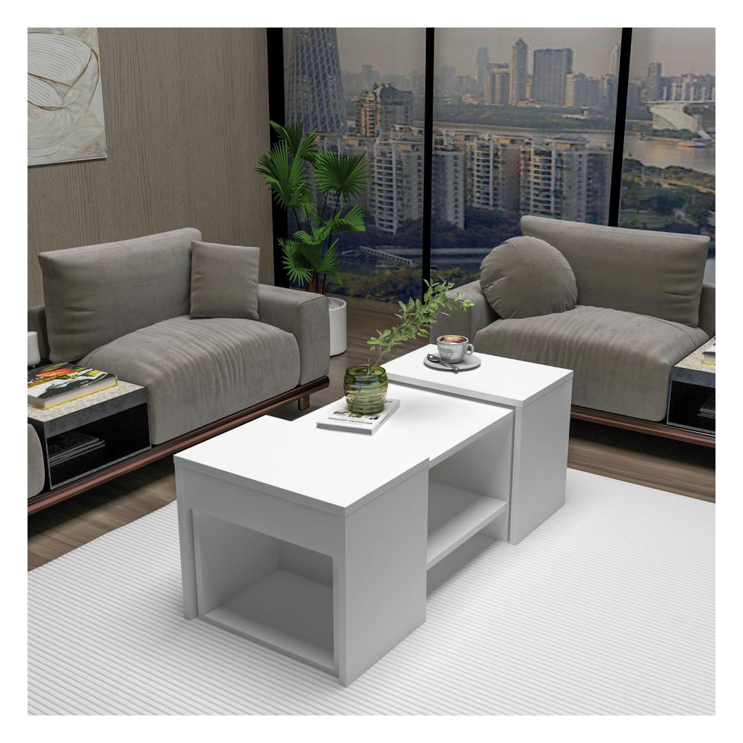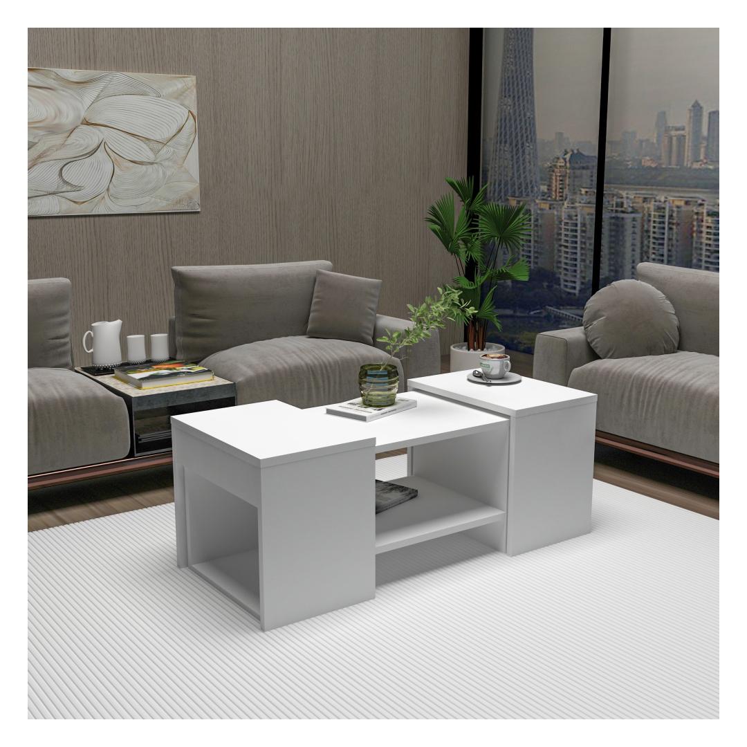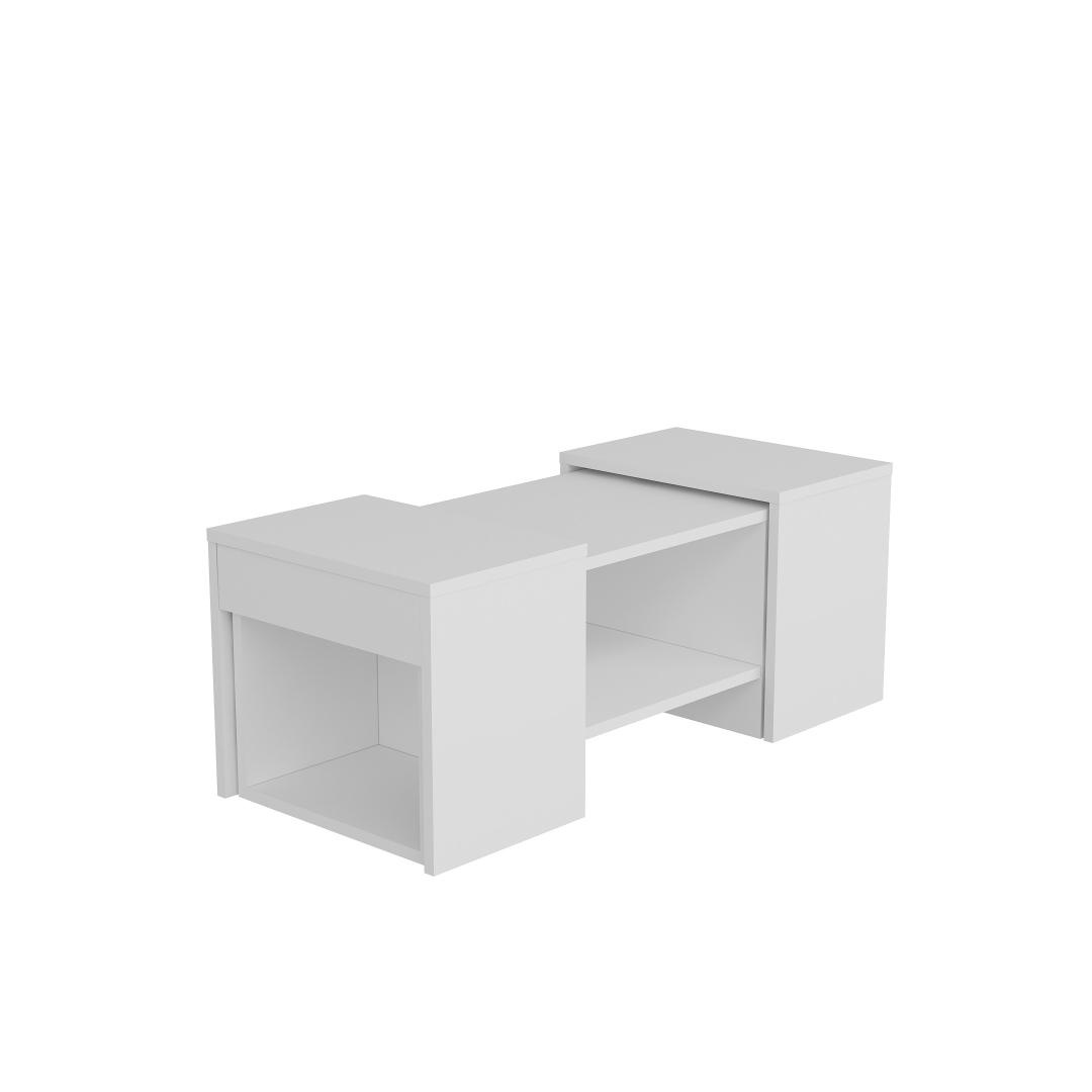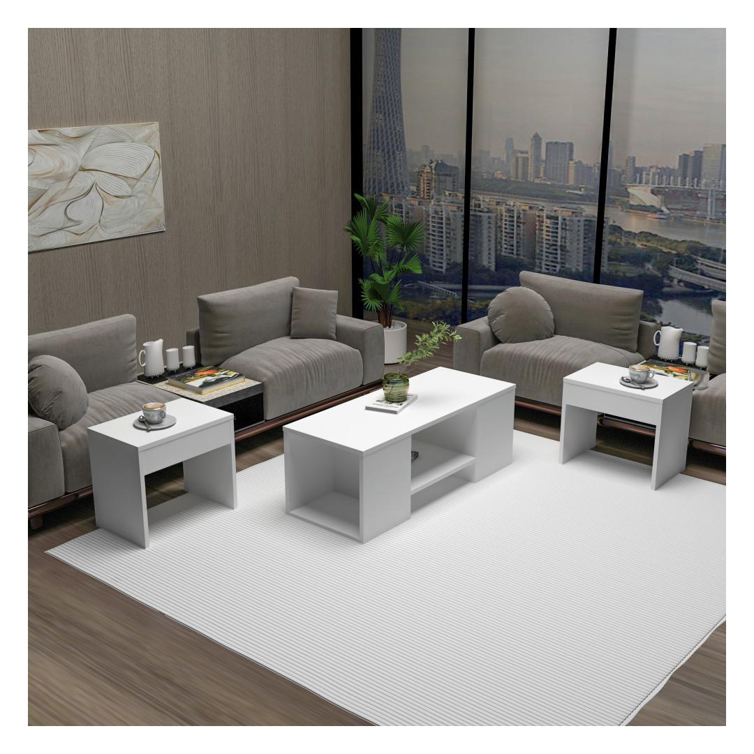 Komplekti kuuluvad kohvilaud ja kaks küljelaua, mis on elegantse valge viimistlusega, mis sobib igasse interjööristiili. Kohvilaud sobib ideaalselt jookide ja suupistete serveerimiseks, samal ajal kui küljelauad pakuvad täiendavat hoiuruumi raamatute, ajakirjade või dekoratiivsete esemete jaoks.
