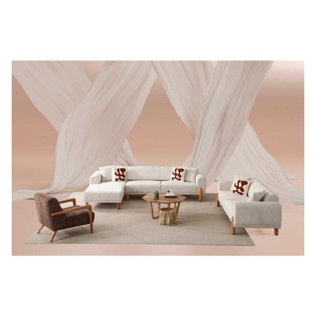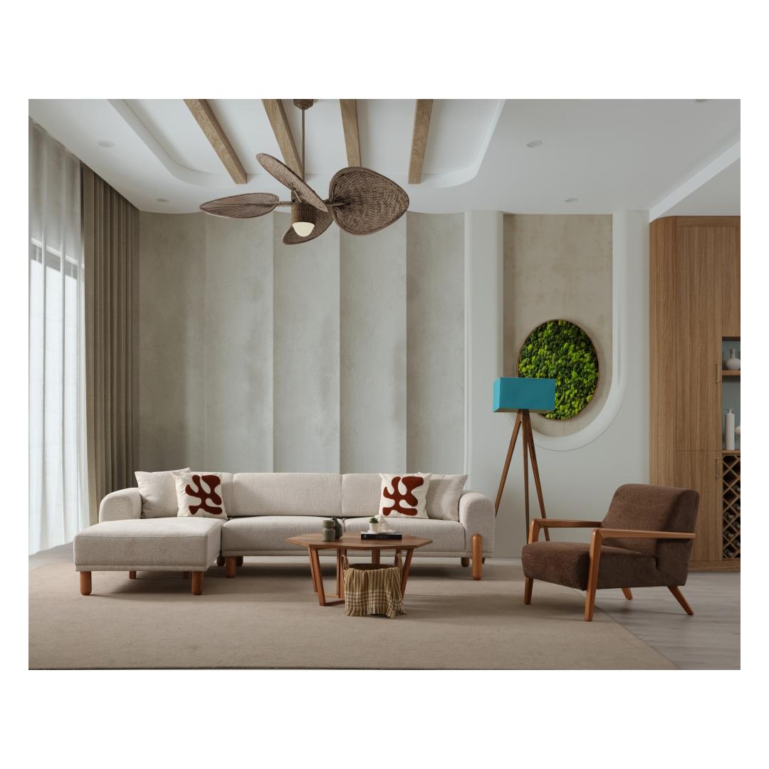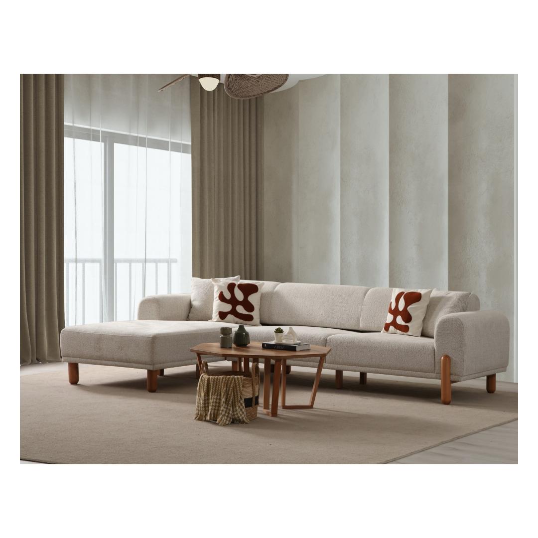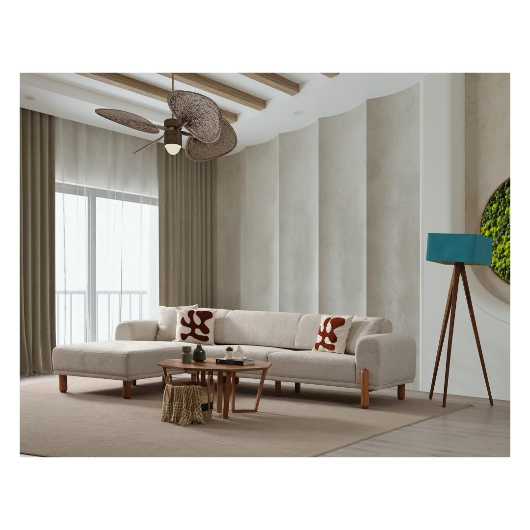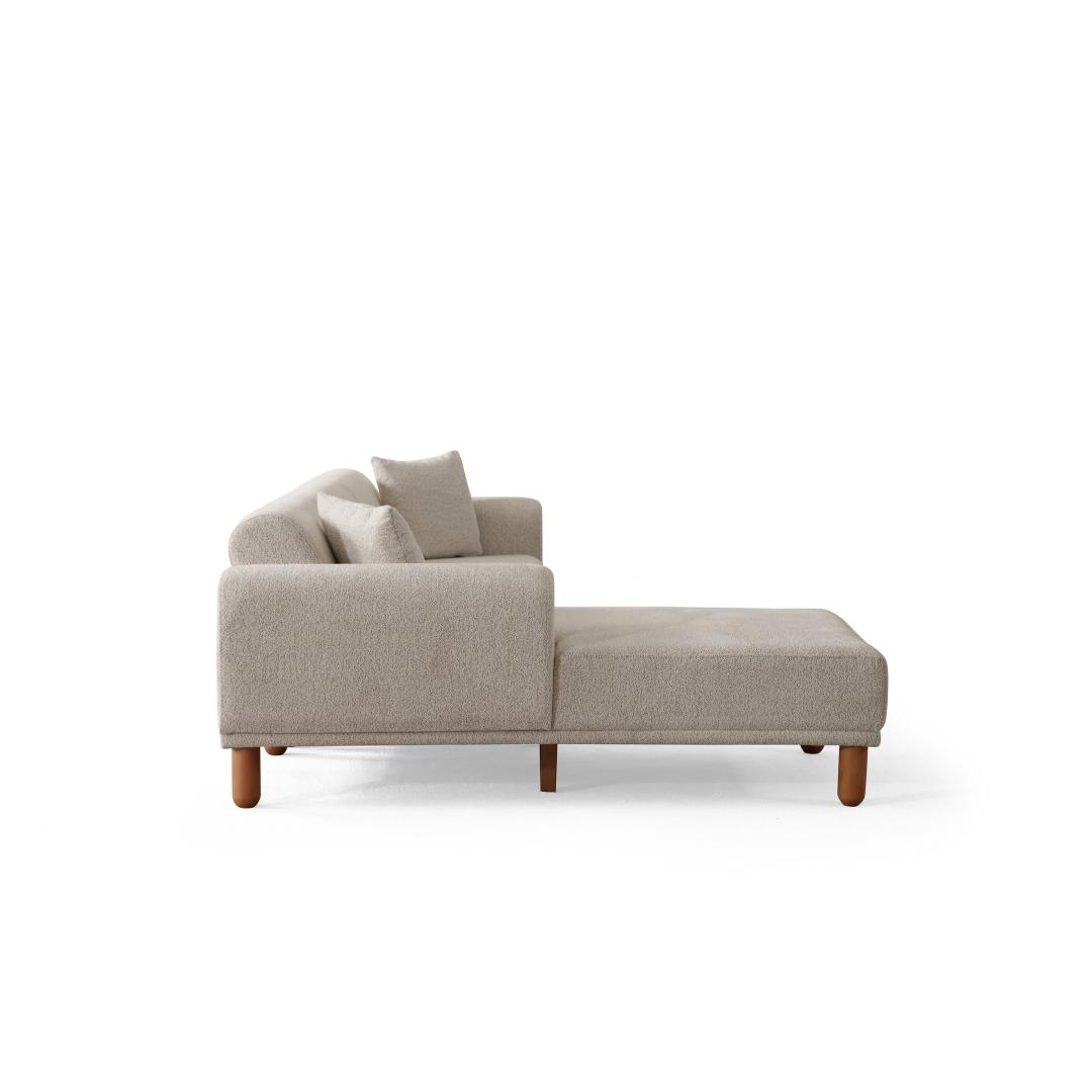 Selle nurgadiivan-voodi elegantse disainiga tõstab teie kodu mis tahes ruumi välimust. Kreemjas värv lisab elegantsust, samas kui must puidust alus ja jalad annavad moodsa kontrasti. See on täiuslik segu stiilist ja funktsionaalsusest.