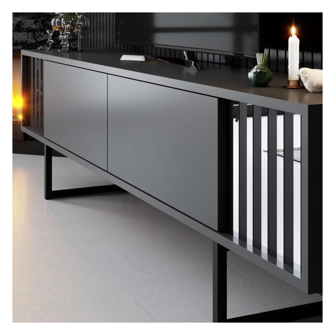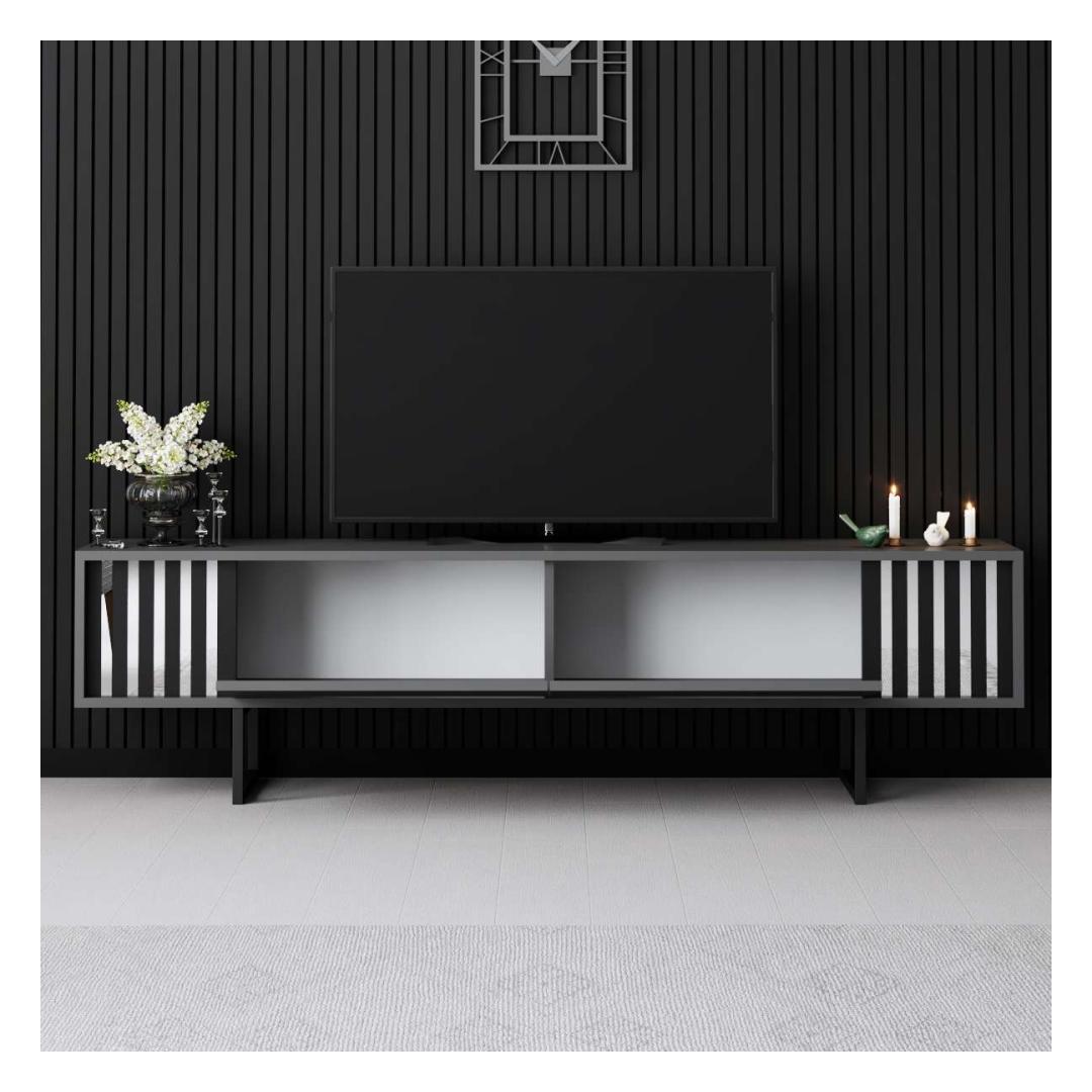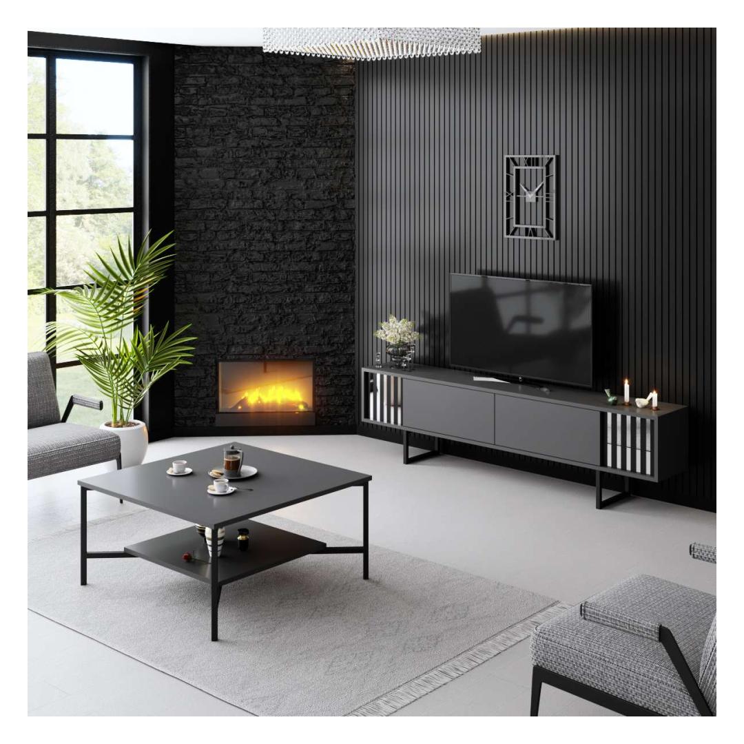 Muuda oma elutuba stiilseks ja modernseks ruumiks meie elegantse telerialuse abil. Valmistatud 100% melamiinkattega puitlaastplaadist, on see alus mitte ainult vastupidav, vaid kiirgab ka elegantsi. Metalljalad lisavad peenust, samas kui antratsiidi ja musta värvikombinatsioon toob sinu kodu sisustusse kaasaegse ilme.