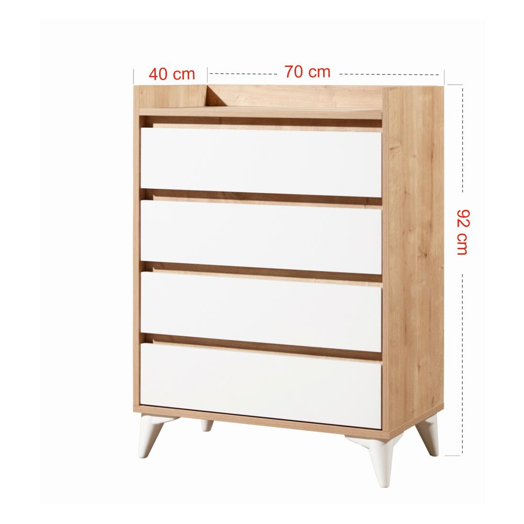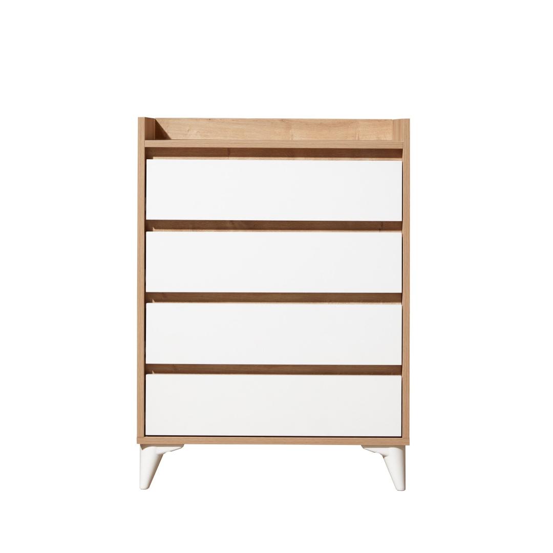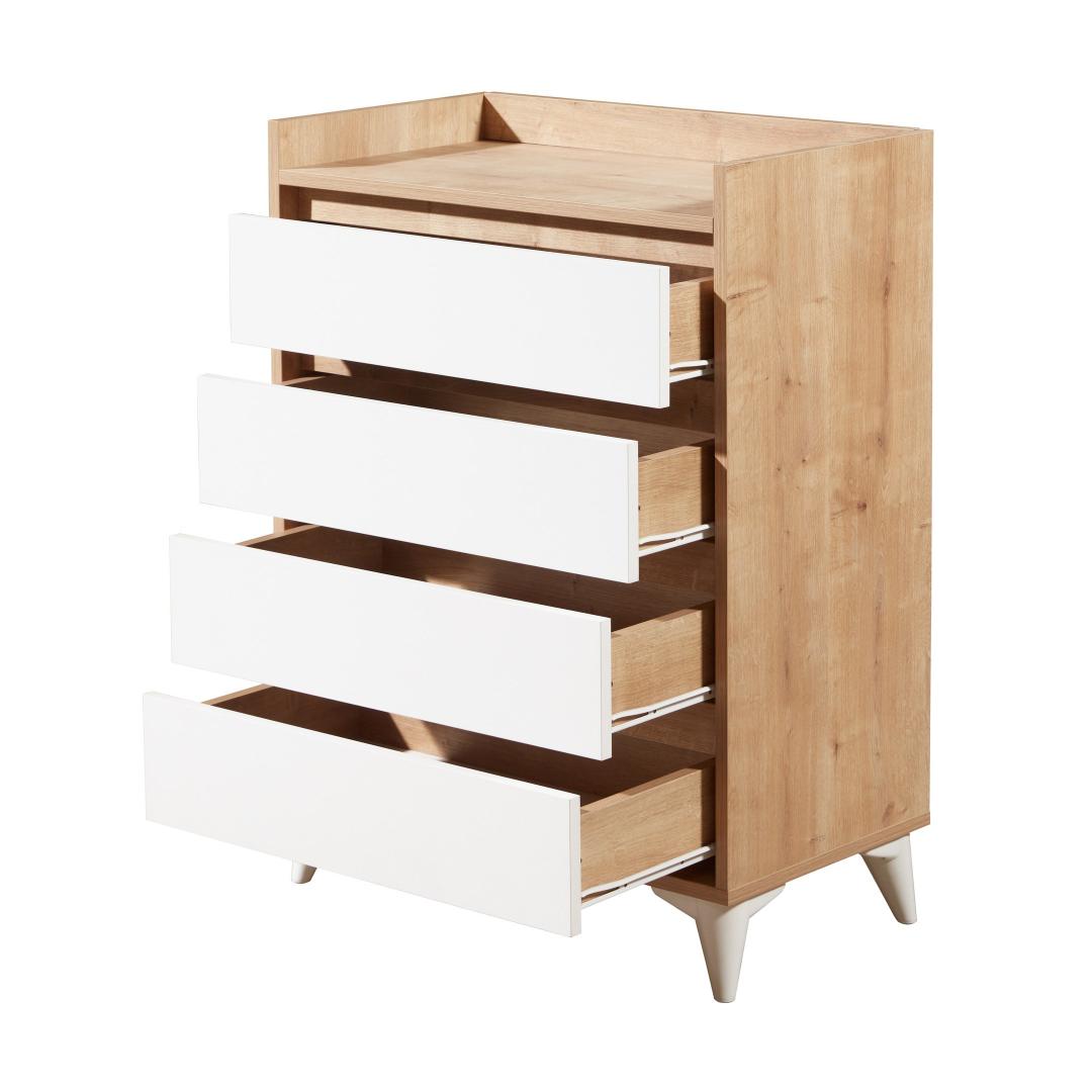 Tänu neljale avarale sahtlile ja täiendavale panipaigale pakub see kapp piisavalt ruumi, et hoida oma riideid, aksessuaare ja isiklikke asju korrastatult. 35 cm pikkused rööpad tagavad sujuva avanemise ja sulgemise, samas kui hõõrdepiduriga hinged lisavad mugavust.