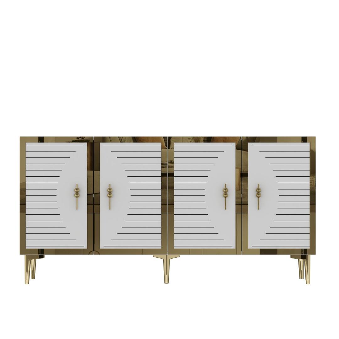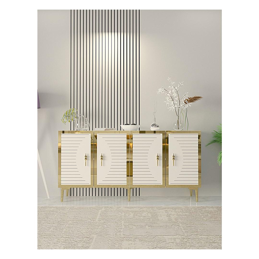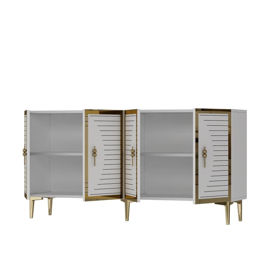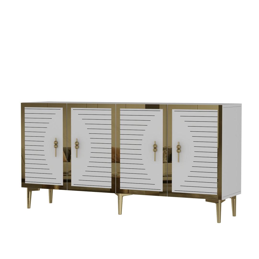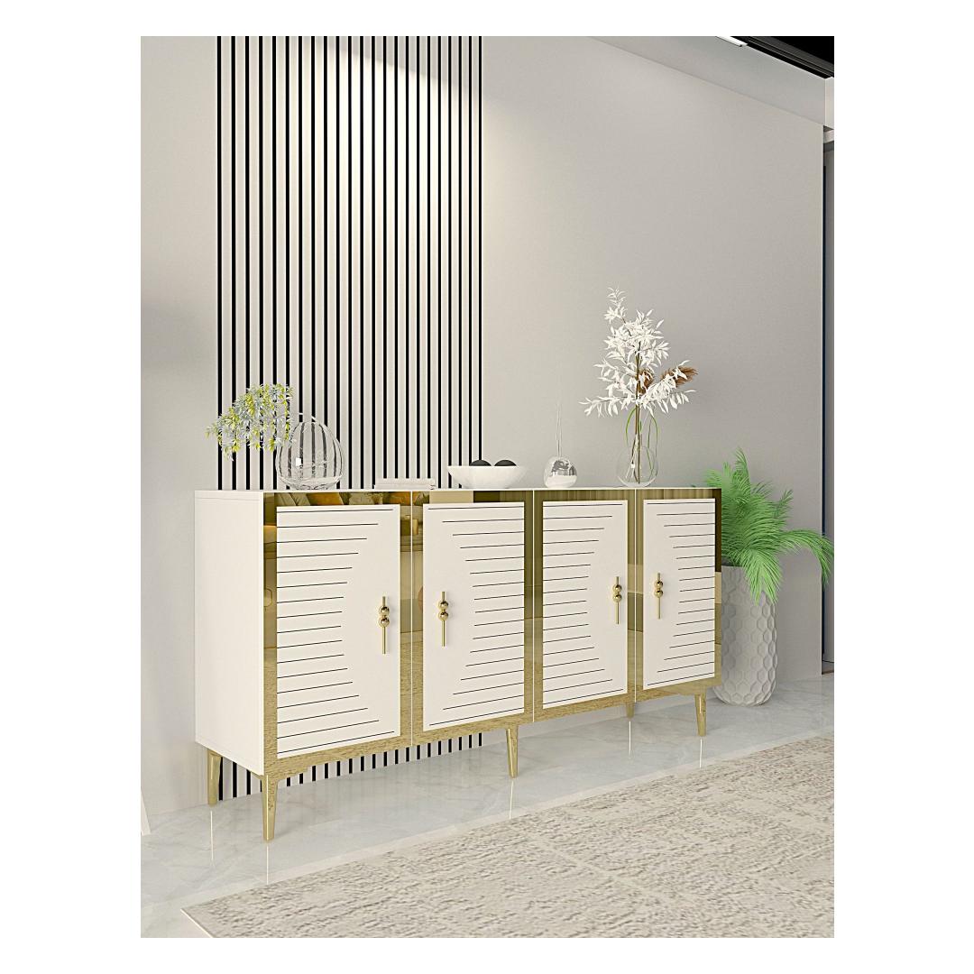 Muuda oma eluruum meie hämmastava konsooliga, mis kiirgab elegantsi ja rafineeritust. Valmistatud 100% melamiinkattega puitlaastplaadist, on see konsool mitte ainult vastupidav, vaid ka uskumatult stiilne. Sujuv disain ja kaunis valge ja kuldne värvikombinatsioon tõstavad kohe iga ruumi ilmet.