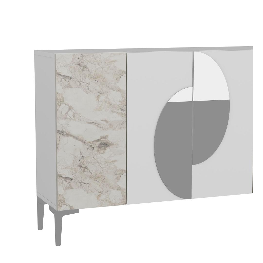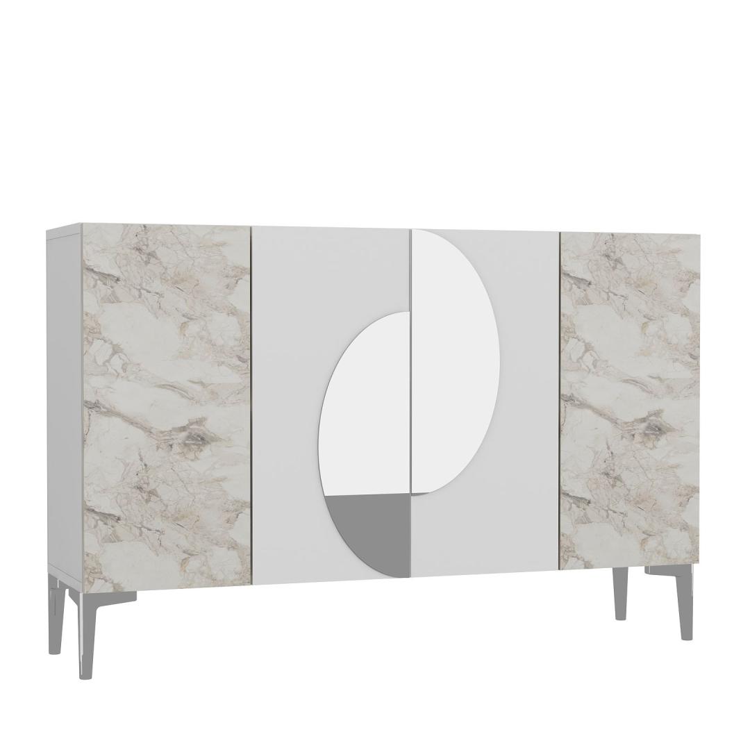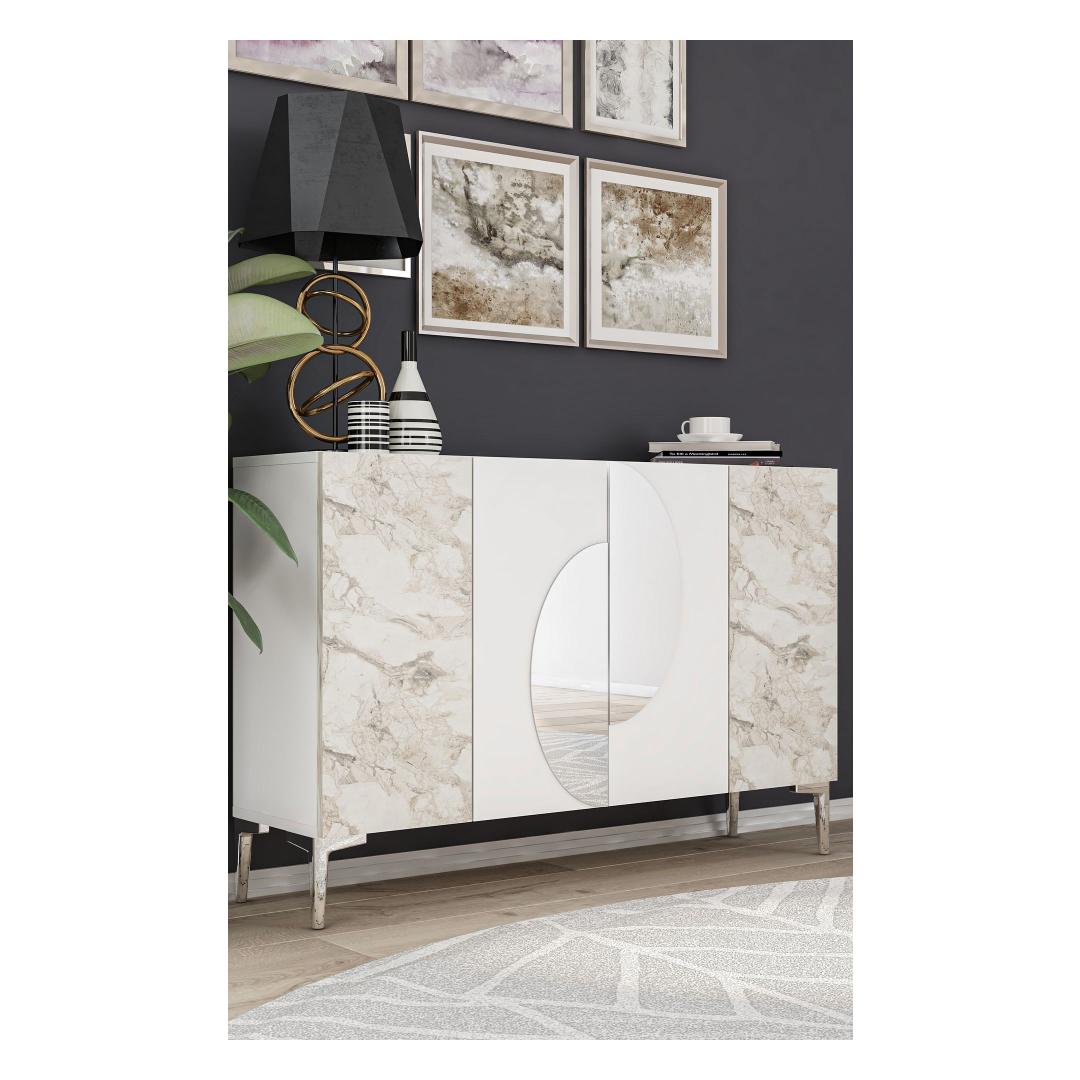 Valge ja Efesose marmoriga viimistlus, millele on lisatud hõbedased detailid, toob igasse ruumi kaasaegse elegantsi. Sujuv ja modernne disain tõstab koheselt sinu sisustust, luues stiilse keskpunkti, mis jätab mulje sinu külalistele.