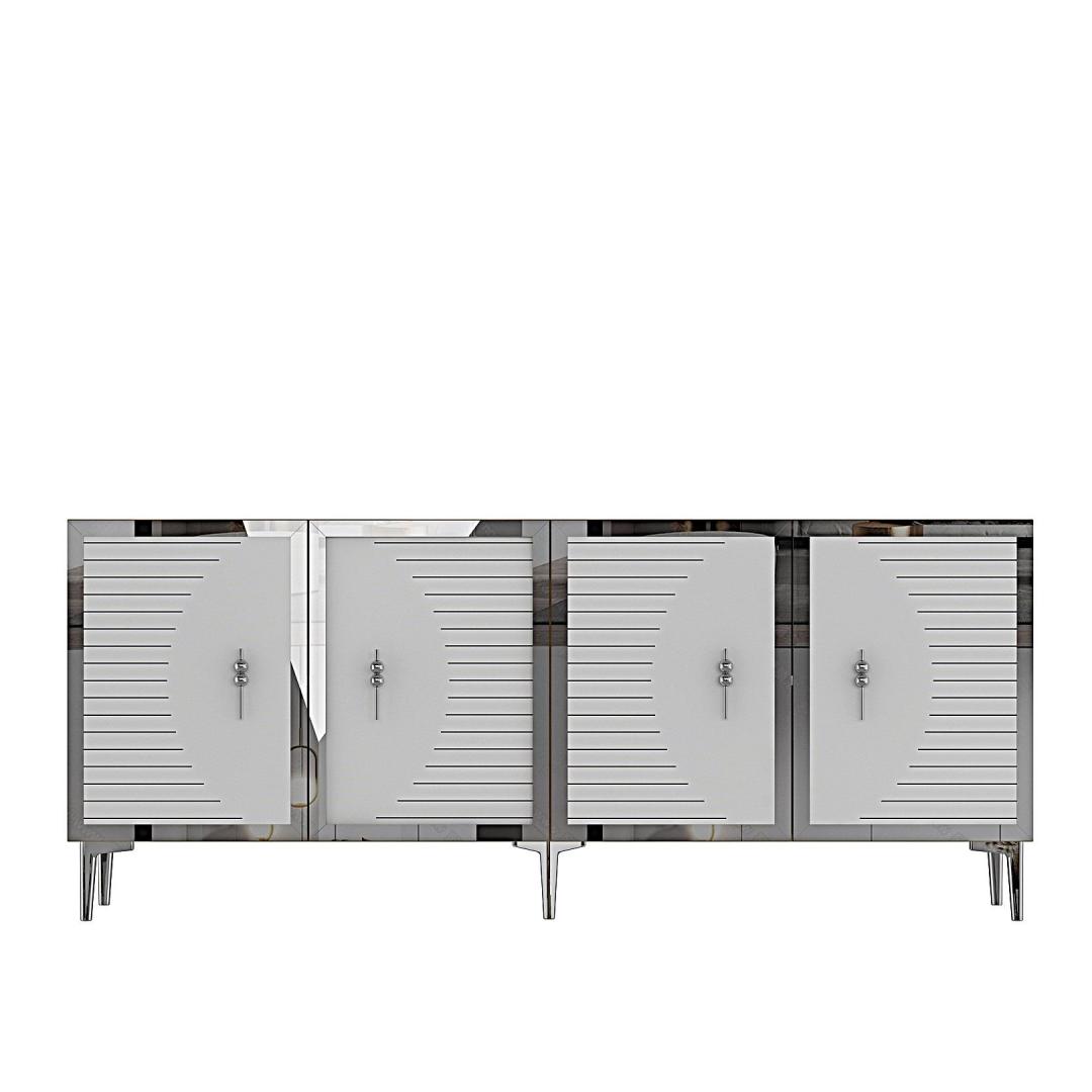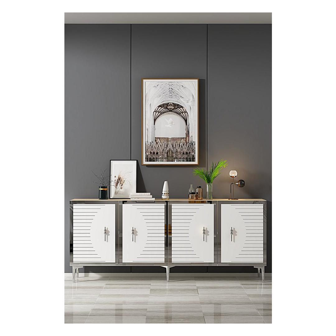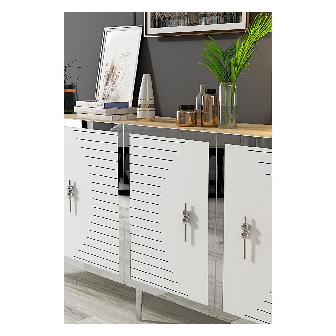 Selle konsooli voolujooneline disain tõstab koheselt iga ruumi välimust. Safiirpruuni, valge ja hõbedase värvi kombinatsioon loob modernse ja šiki esteetika, mis jätab mulje kõigile teie külalistele.