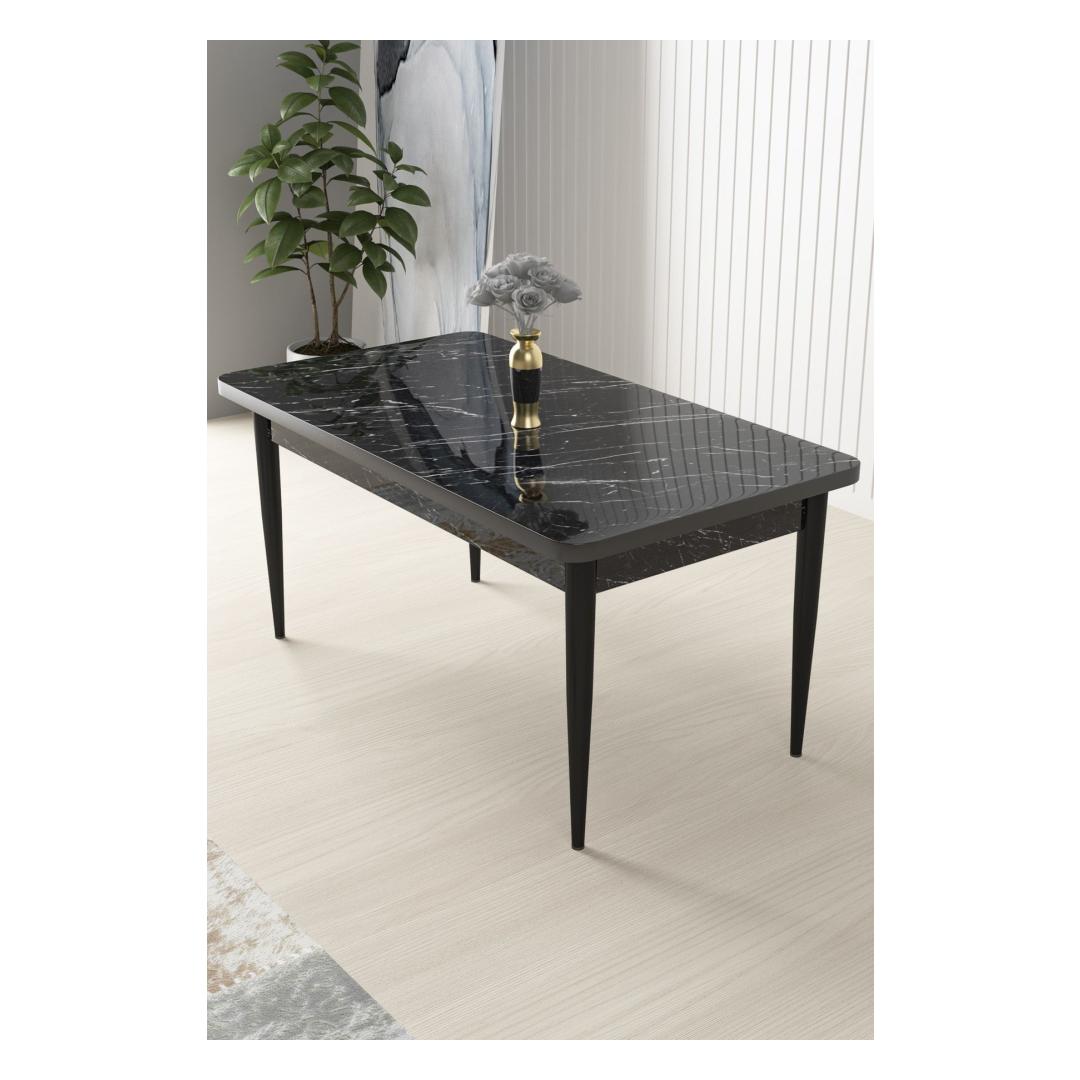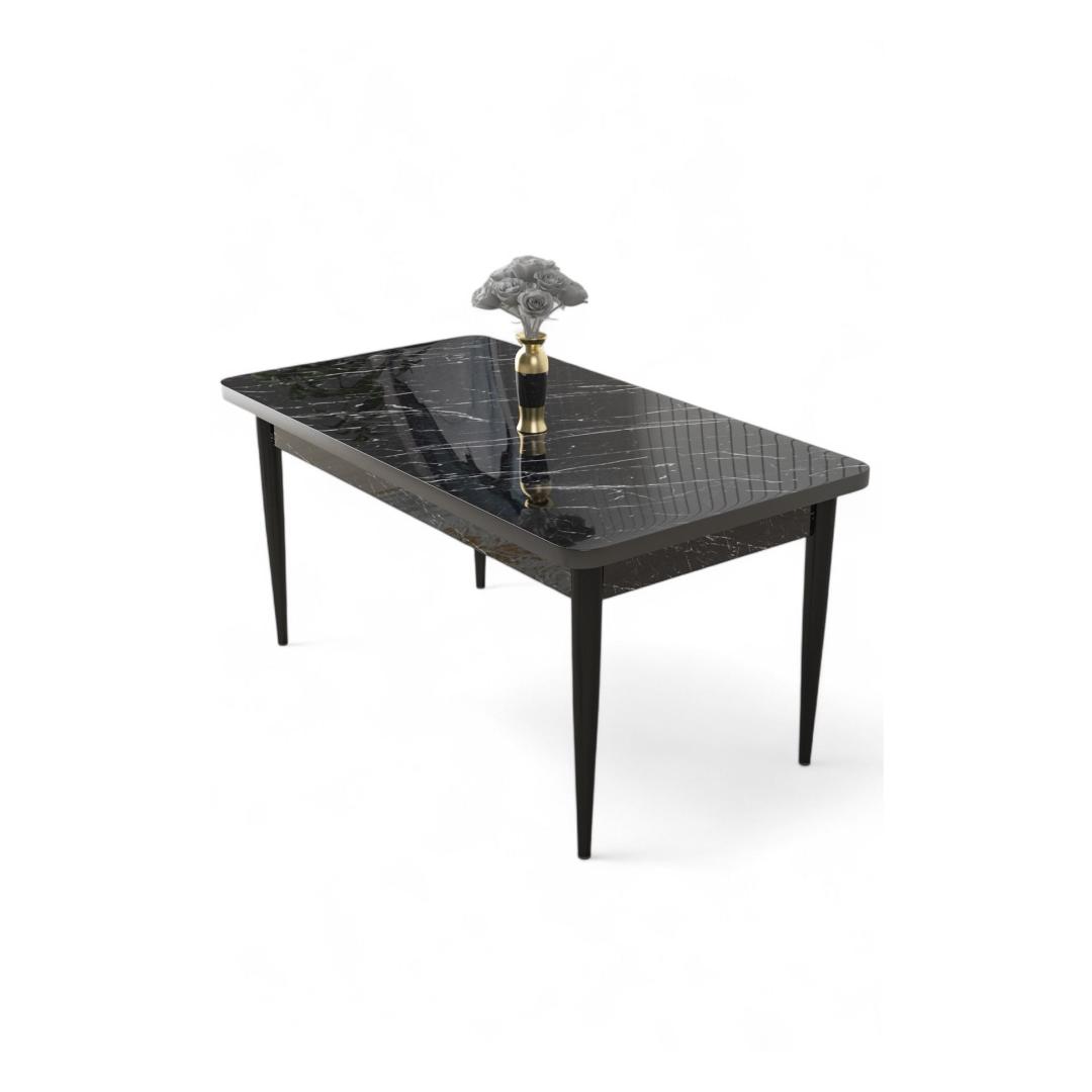 Muuda oma söögituba luksuslikuks pelgupaigaks meie hämmastava musta marmorist söögilaua abil. Valmistatud 100% puitlaastplaadist, kiirgab see laud elegantsi ja rafineeritust, olles ideaalne keskpunkt igas moodsas kodus. Sujuv must marmorist pind lisab luksuse puudutuse, samas kui metalljalad tagavad stabiilsuse ja stiili.
