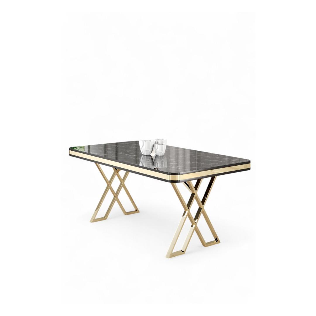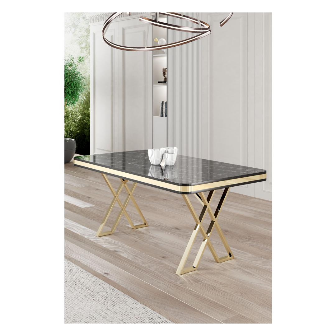 Muuda oma söögituba luksuslikuks ja elegantseks ruumiks meie hämmastava söögilaua abil. Valmistatud 100% lakitud paneelist ja stiilsetest metalljalgadest, kiirgab see laud rafineeritust ja stiili. Musta marmi ja kuldsete aktsentide kombinatsioon lisab igasse söögikohta glamuurset puudutust, muutes selle teie kodu ideaalseks keskpunktiks.