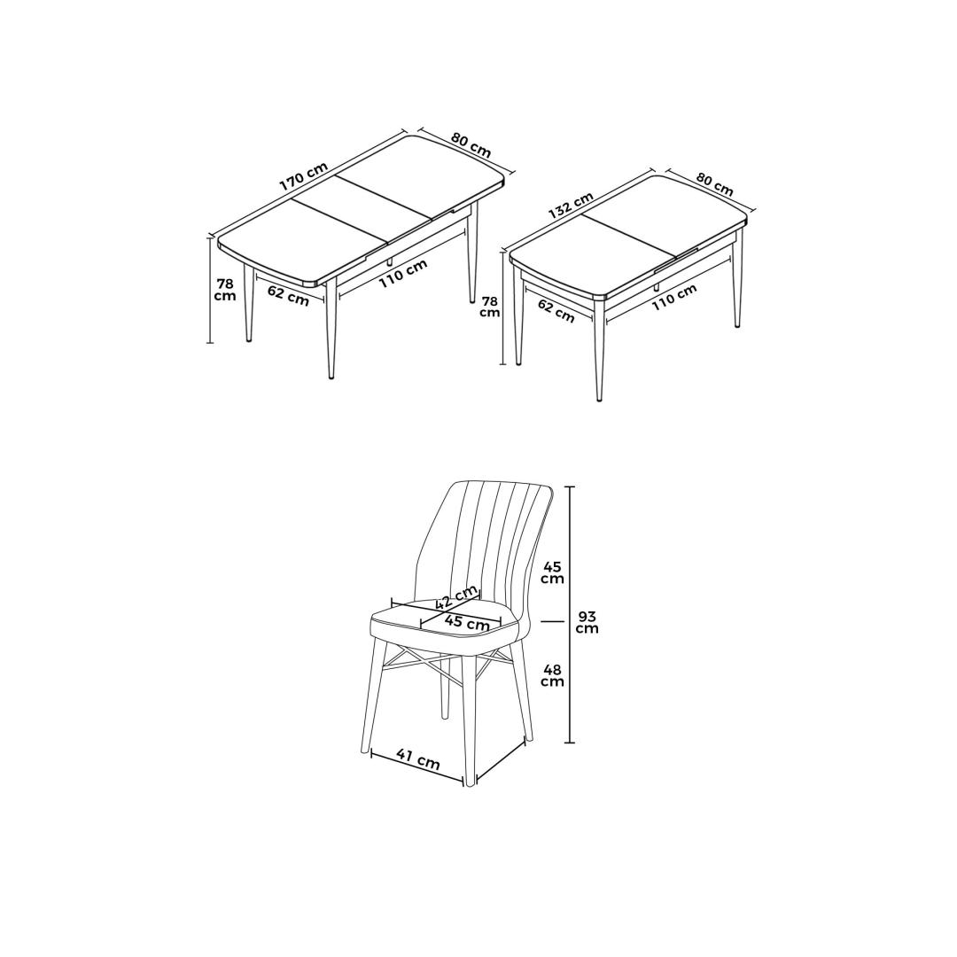 Mitmekülgne funktsionaalsus: Söögilaud on 132 cm lai ja seda saab pikendada 170 cm-ni, pakkudes piisavalt ruumi kõigi teie söögivajaduste jaoks. Toolid on disainitud mugavuseks, 22 DNS vaht seljatoe jaoks ja 28 DNS vaht istumise jaoks tagavad hubase söögikogemuse.