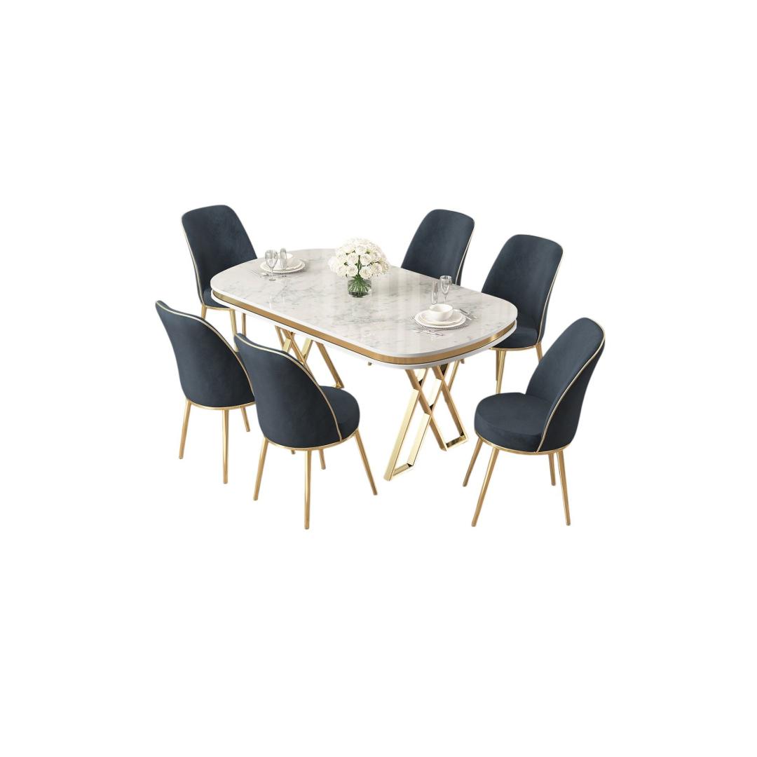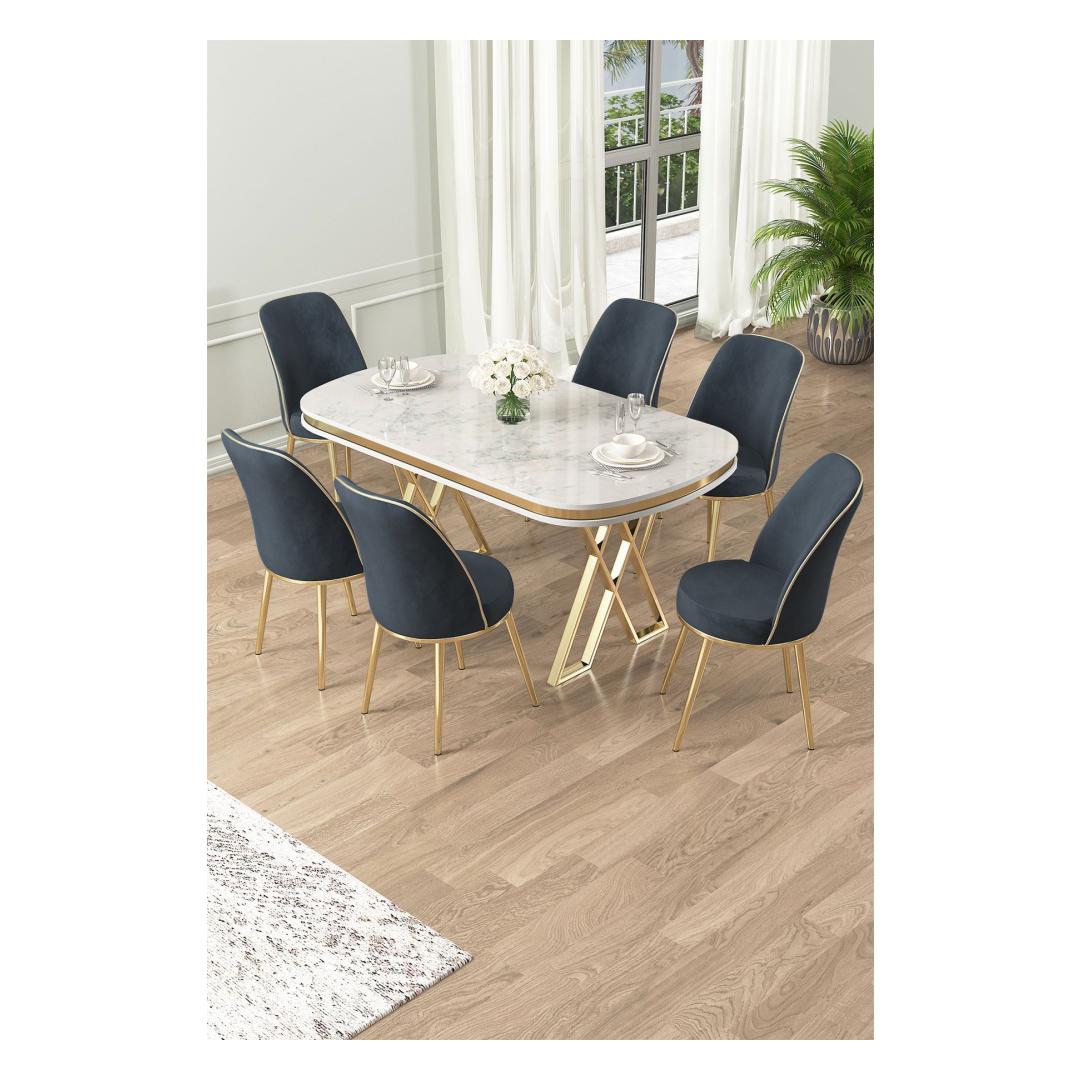 Kujutle, et korraldad õhtusööke ja koosolekuid sõprade ja perega selle suurepärase söögikomplekti ümber. Kaasaegne disain ja šikk värvikombinatsioon valgest, kullast ja antratsiidist tõstavad koheselt sinu söögitoa ilmet.