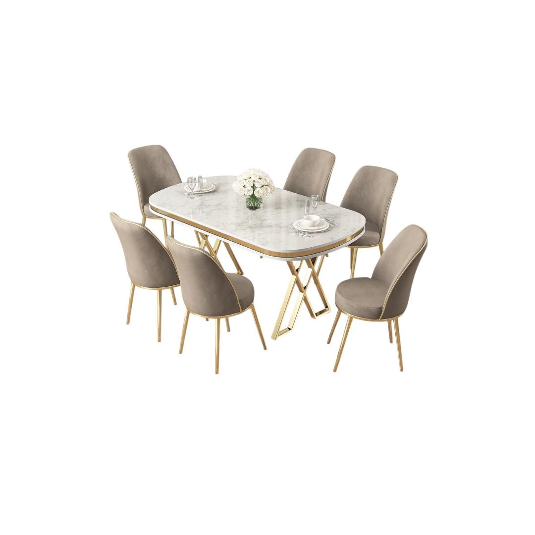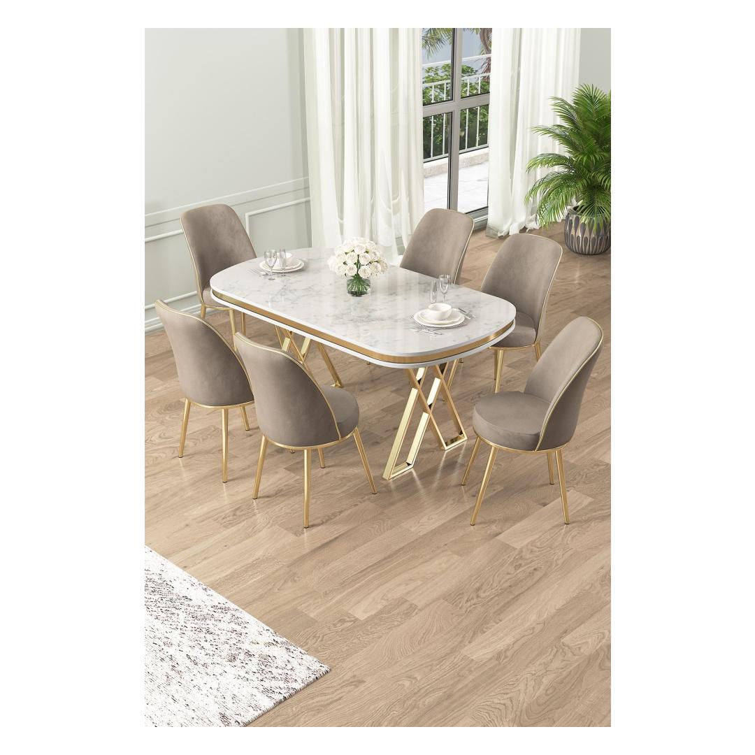 Valge, kuldse ja kaputsiinovärvi kombinatsioon lisab teie söögitoa dekoreerimisele elegantsi ja rafineeritust. Olgu tegemist ametliku õhtusöögiga või juhusliku eine nautimisega lähedastega, see söögikomplekt on ideaalne valik unustamatute mälestuste loomiseks.