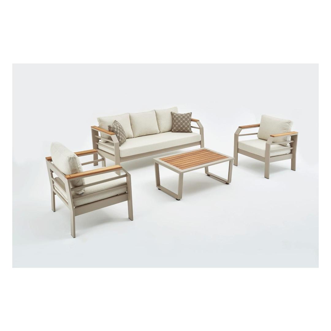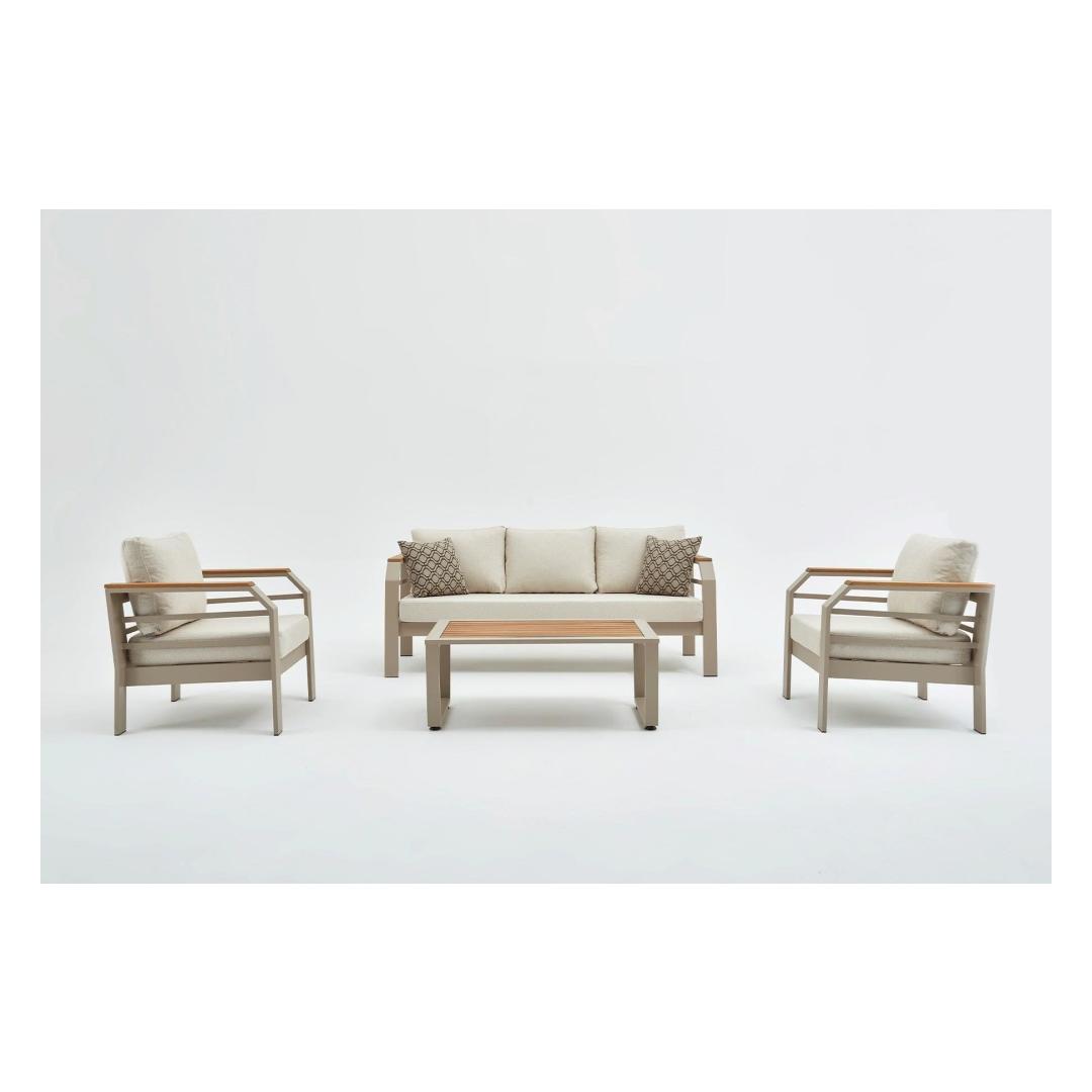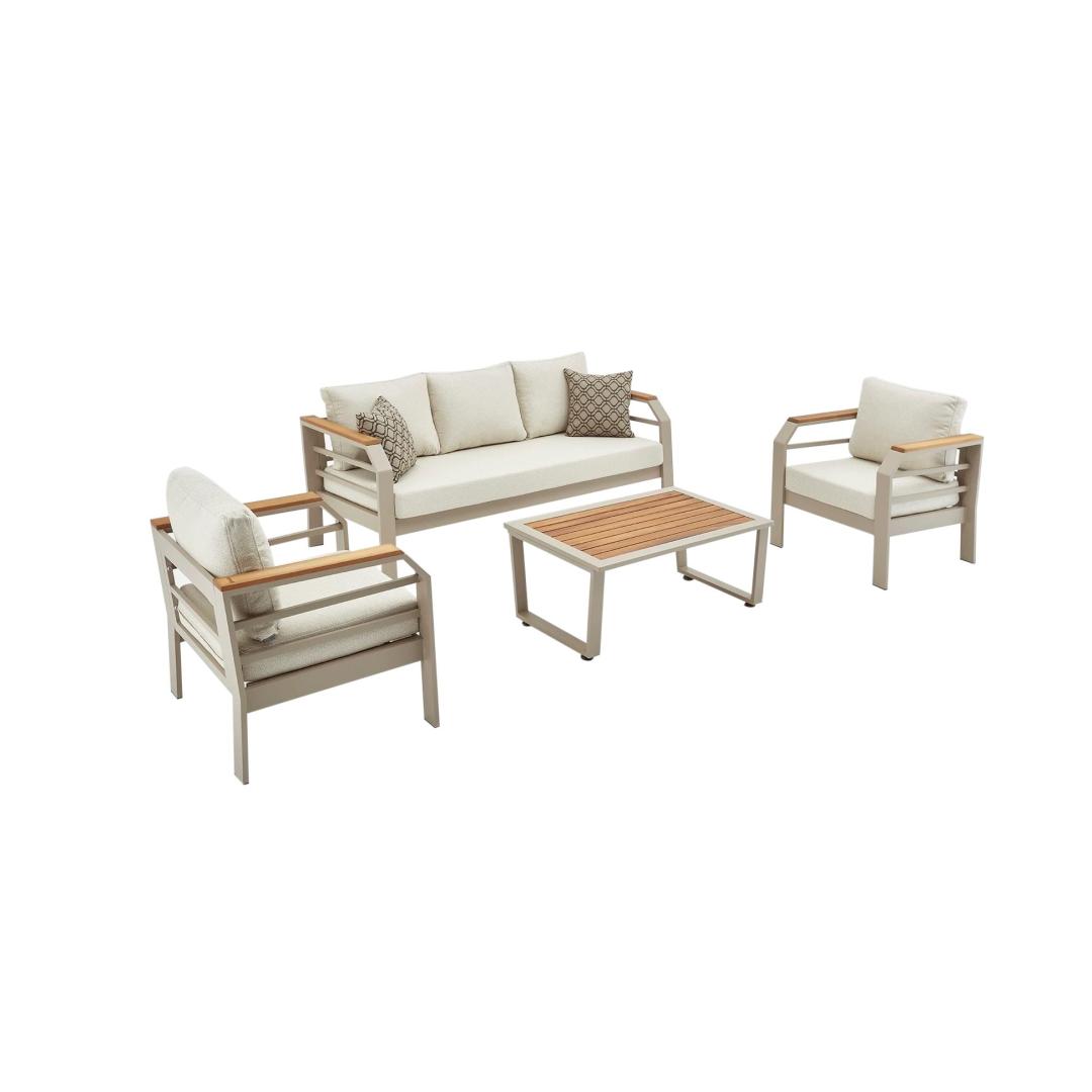 Komplekt sisaldab 3-kohalist diivanit, kahte 1-kohalist diivanit ja kohvilauda, kõik koos modernsete alumiiniumjalgadega. Beez värv lisab igale välistingimustes asuvale keskkonnale elegantsi, muutes selle ideaalseks lisandiks teie terrassile või aeda.