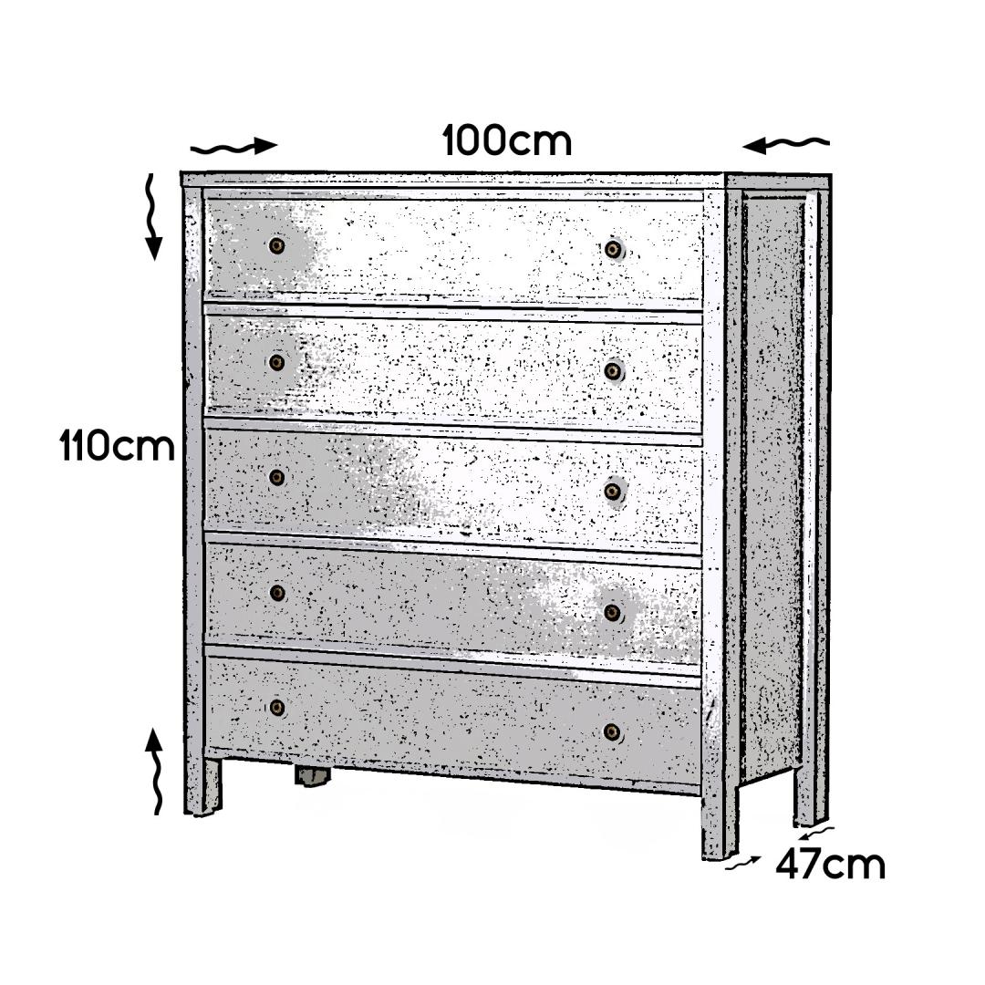 100 cm laiuse, 110 cm kõrguse ja 47 cm sügavusega kapp pakub piisavalt hoiuruumi kõigile teie riietele, aksessuaaridele ja isiklikele asjadele. Avarad sahtlid pakuvad segadusteta lahendust, mis võimaldab teil oma esemeid hõlpsasti korraldada. Ütle hüvasti segastele tubadele ja tere hästi organiseeritud pühamuuseumile.