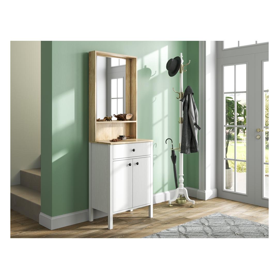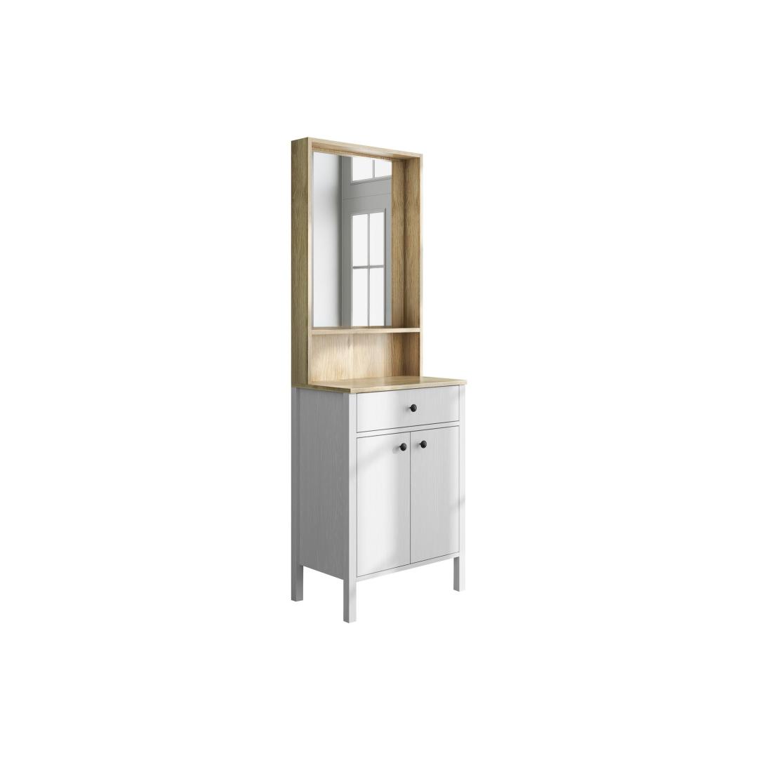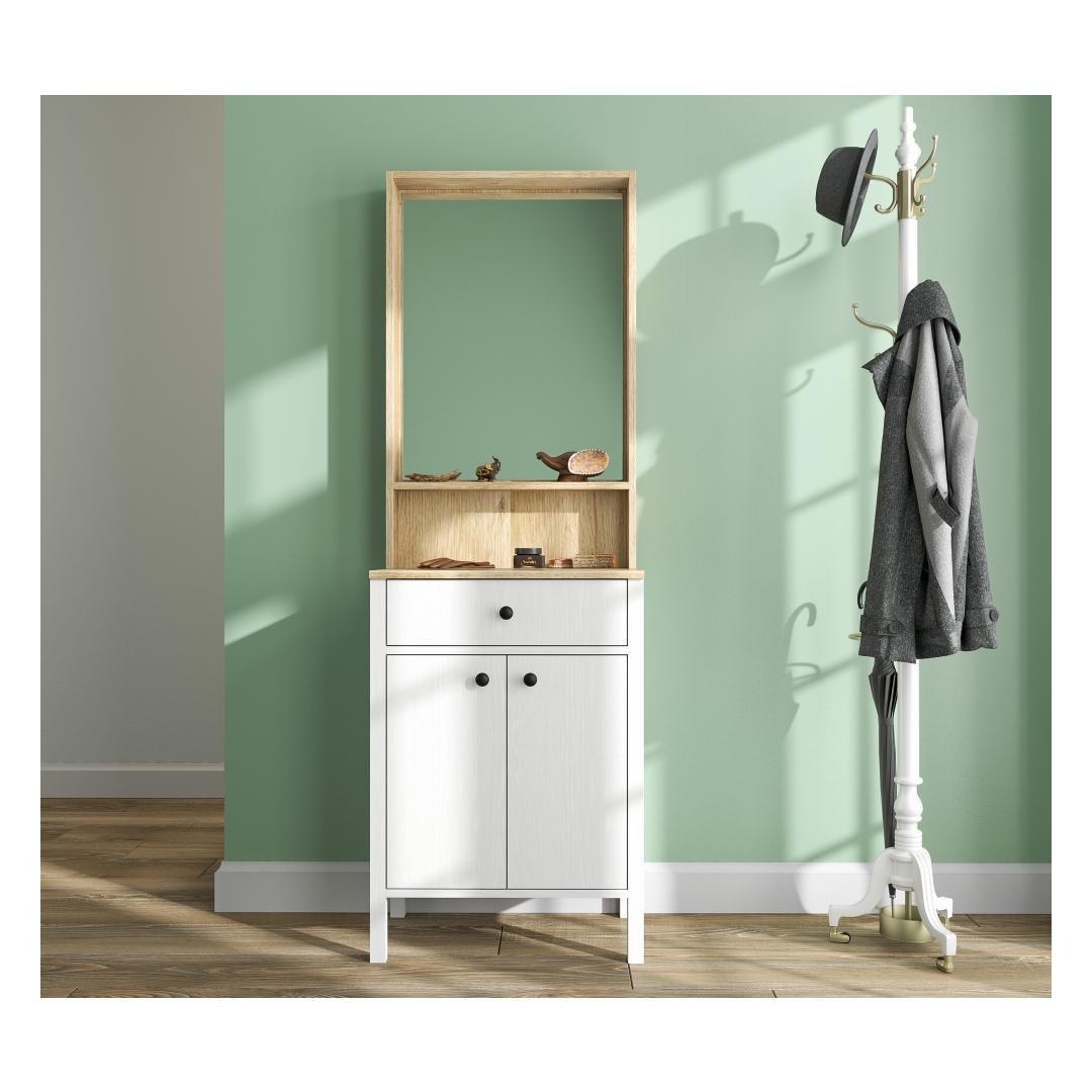 MDF profiiljalad ja metallist käepidemed lisavad sellele tükile kaasaegse puudutuse, muutes selle stiilseks lisandiks igasse kodu sisustusse. Puit- ja valge värvikombinatsioon lisab elegantsi, samas kui võimalus see seina kinnitada tagab stabiilsuse ja ohutuse.