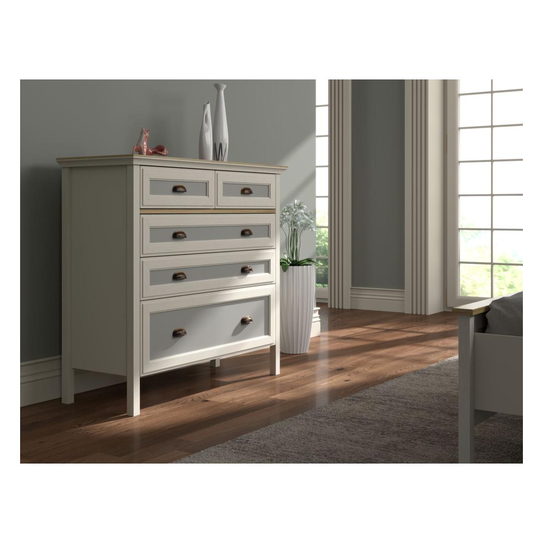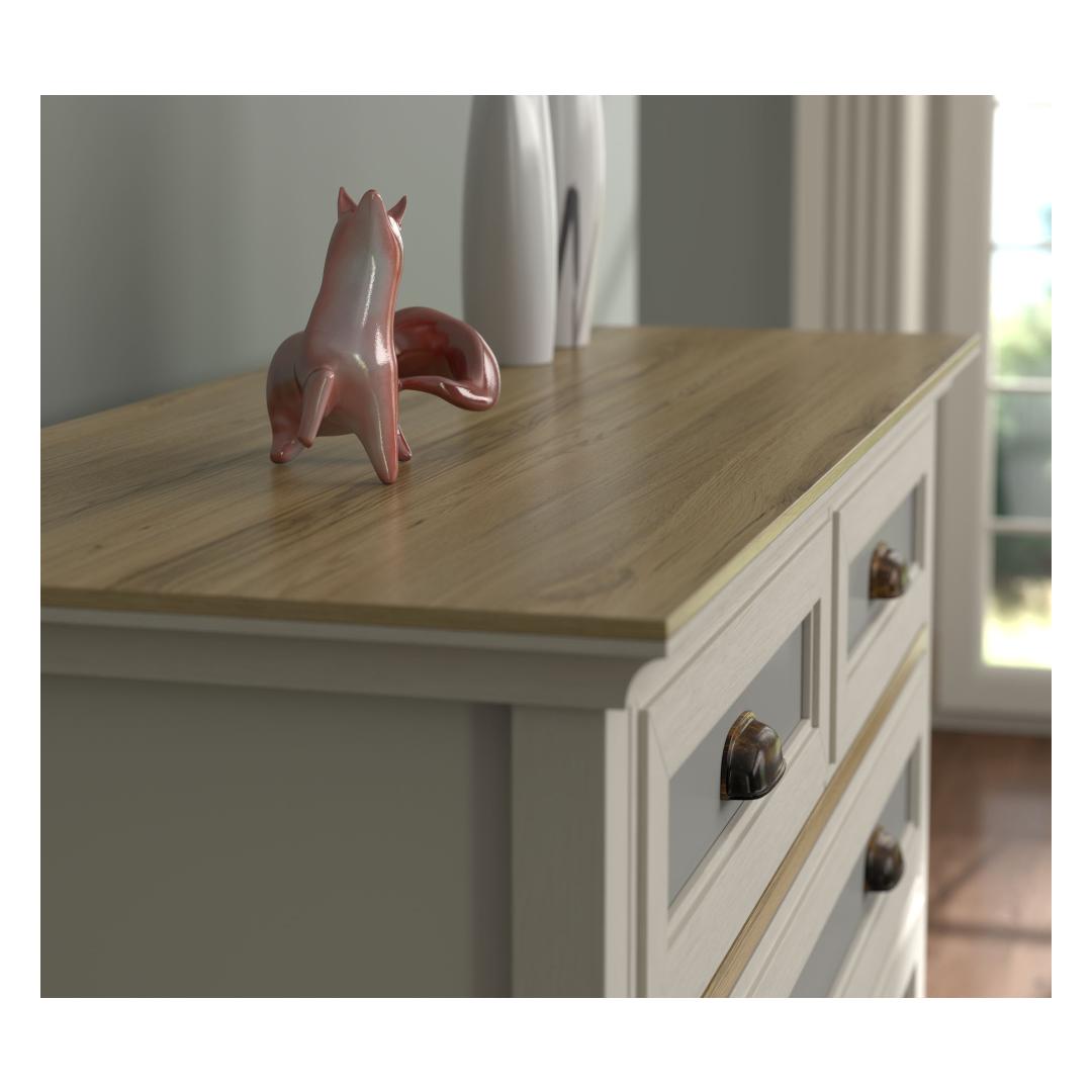 Kummutil on sujuv disain MDF-profiiliga jalad ja metallist käepidemed, mis lisavad sinu ruumile modernsuse puudutuse. Kreemi, tamme ja halli värvid sulanduvad harmooniliselt, luues kutsuva ja meeldiva atmosfääri sinu magamistoas.