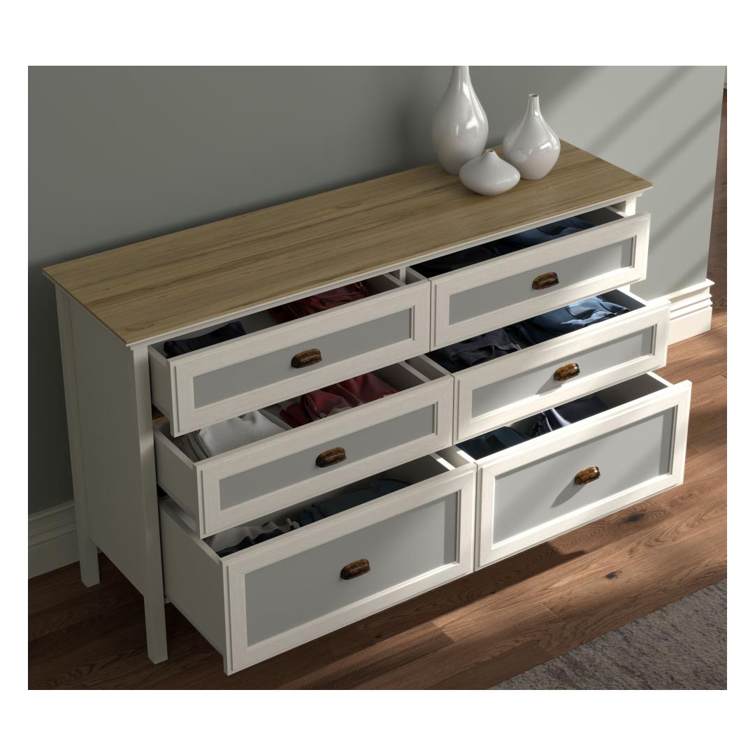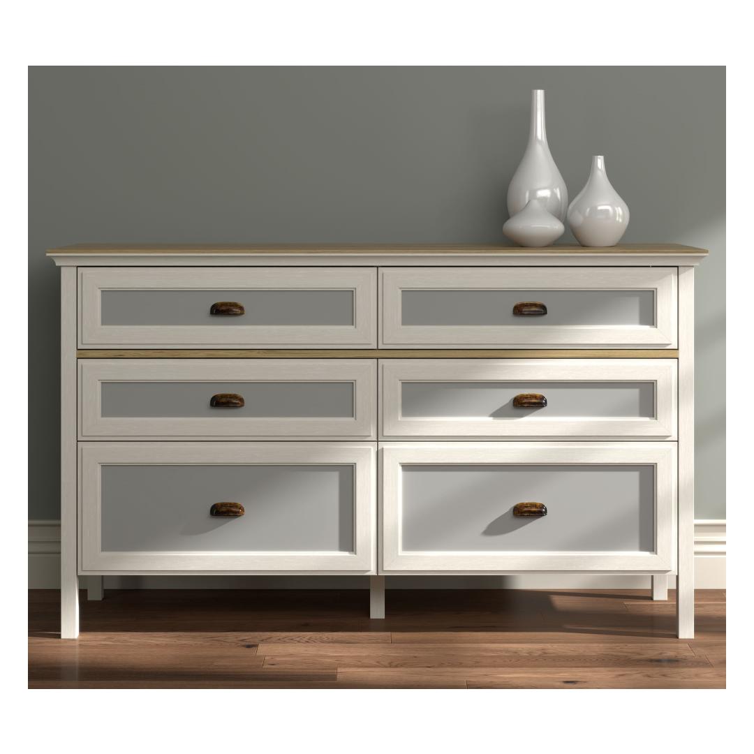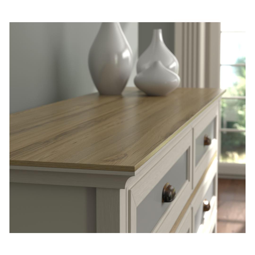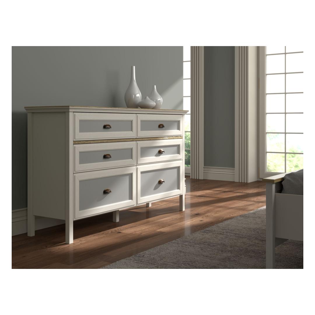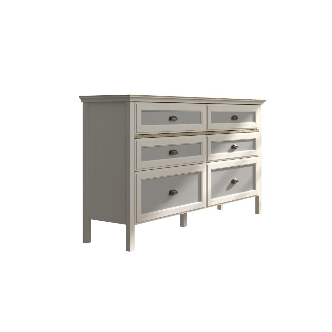 Selle voolujoonelise disaini ja kaasaegse värvipaleti – kreem, tamm ja hall – abil tõstab see kummut koheselt teie magamistoa ilmet. 100% melamiiniga kaetud puitlaastplaadi konstruktsioon tagab vastupidavuse ja pikaealisuse, samas kui 100% MDF uksed lisavad luksuse puudutuse.