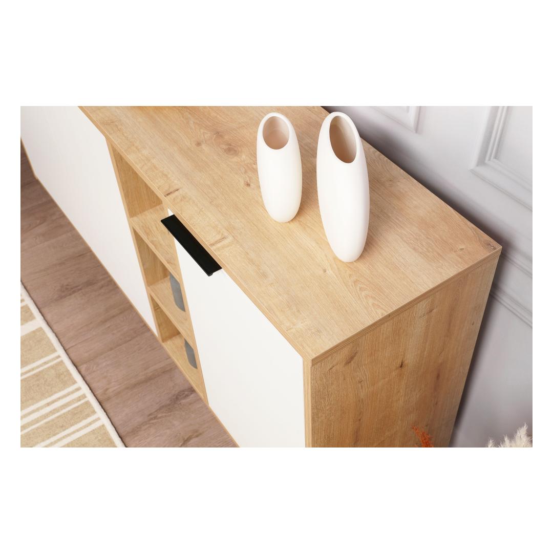 Meie konsool pakub arvukate riiulitega rohkelt hoiuruumi kõigile teie asjadele. Kas soovite näidata oma lemmikraamatuid, esitleda oma kollektsioonitarbeid või organiseerida oma hädavajalikke asju, see konsool on teie jaoks olemas. Selle avar disain tagab, et saate oma eluruumi hoida segadusteta ja organiseerituna.