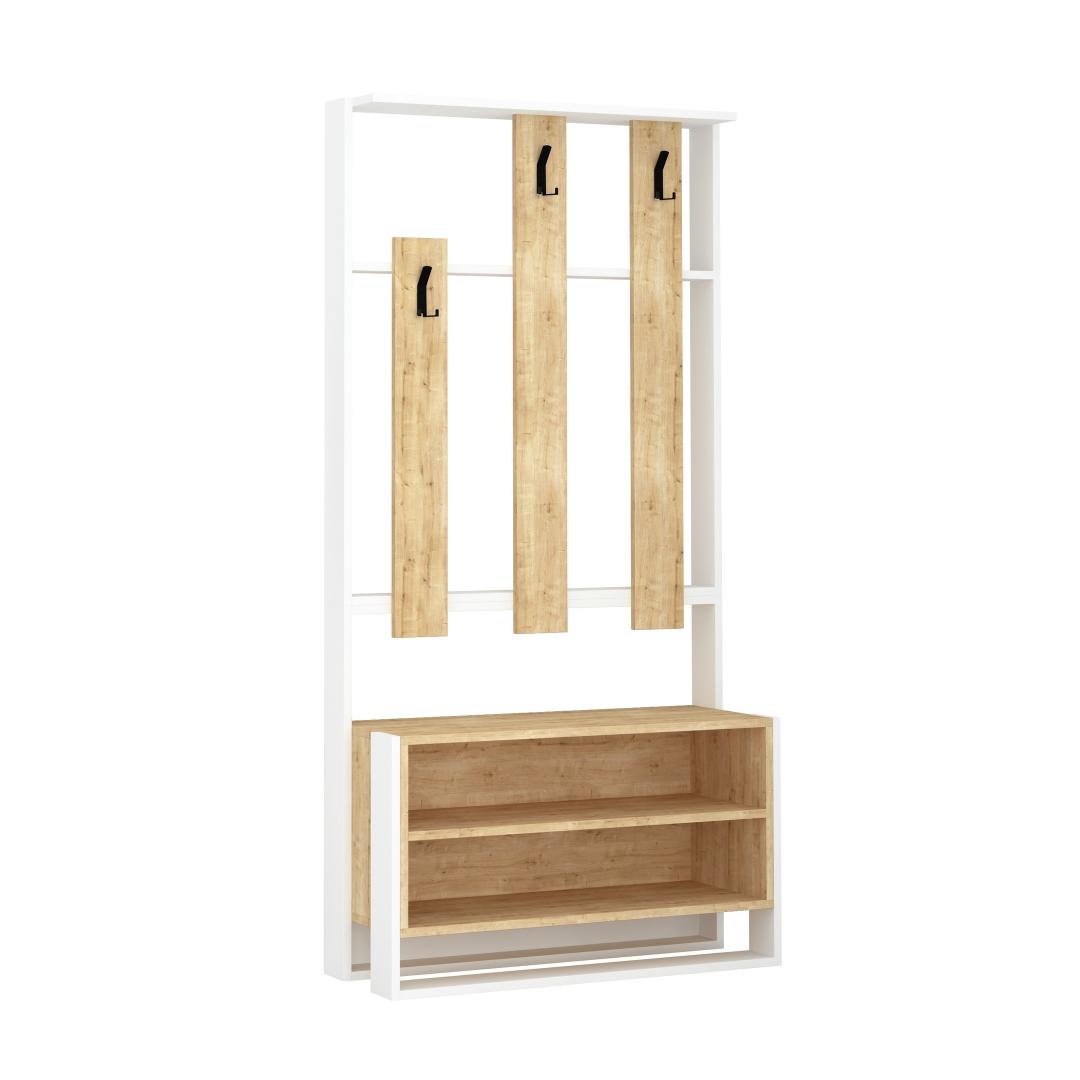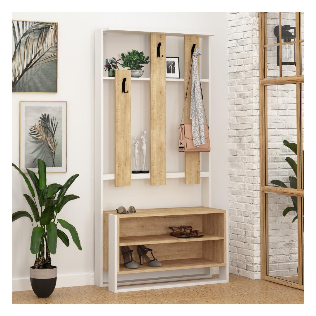 Oma elegantse ja ühevärvilise disainiga on meie koridorikapp ideaalne täiendus igasse kaasaegsesse koju. Valge ja tamme värvi kombinatsioon lisab elegantsust ja rafineeritust, muutes selle teie koridoris väljapaistvaks esemeks. Hüvasti kaose ja kaosega, sest sellel stendil on arvukalt riiuleid, mis võimaldavad teil oma kingi, kotte ja muid asju kenasti korraldada.