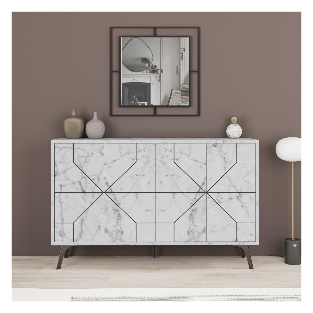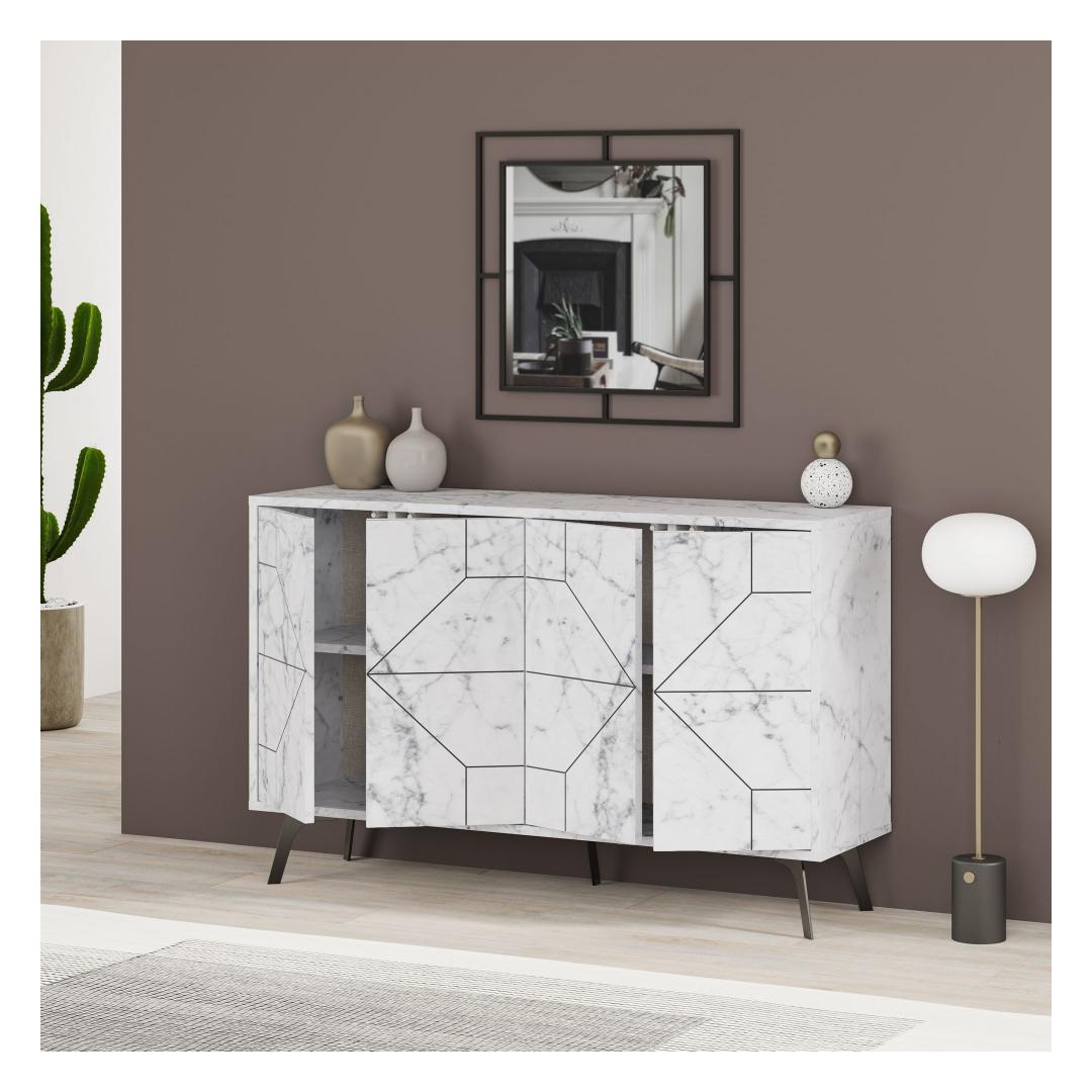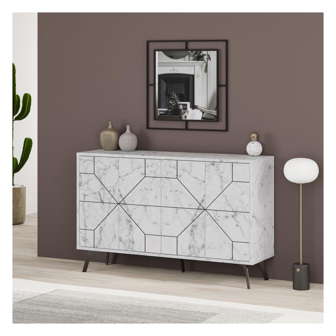 Laius 123 cm, kõrgus 62 cm. 4cm ja sügavus 35cm, pakub see konsool rohkelt hoiuruumi kõigile teie asjadele. Alates raamatutest ja ajakirjadest kuni dekoratiivsete esemete ja elektroonikani saate hõlpsasti korraldada ja eksponeerida oma lemmiktarbeid. Jalgade kõrgus 15 cm lisab stiilset lisatooni, pakkudes samas stabiilsust.