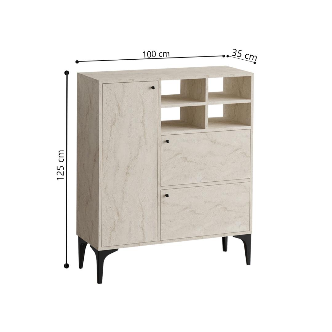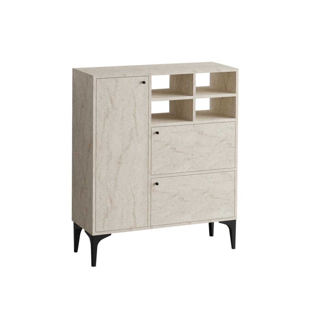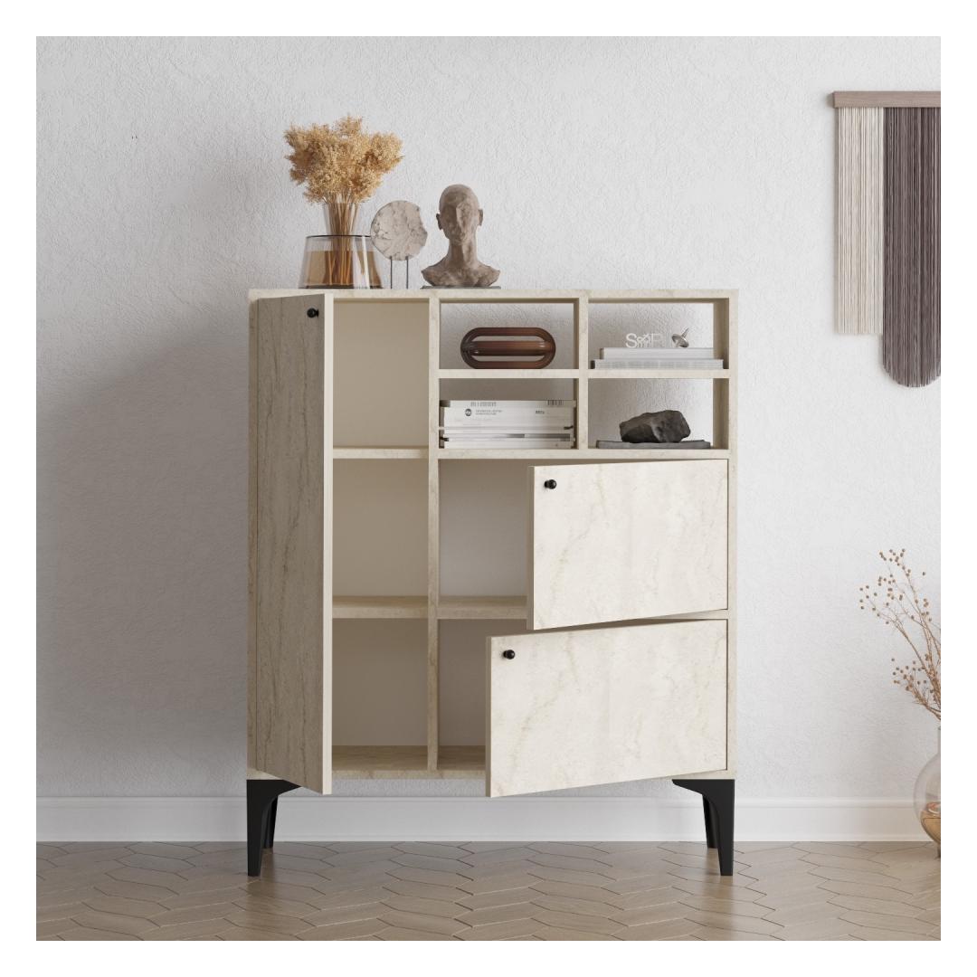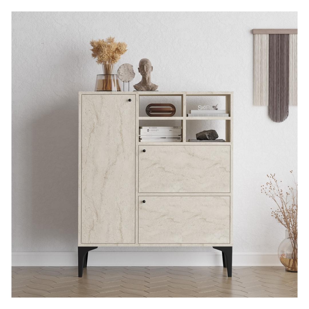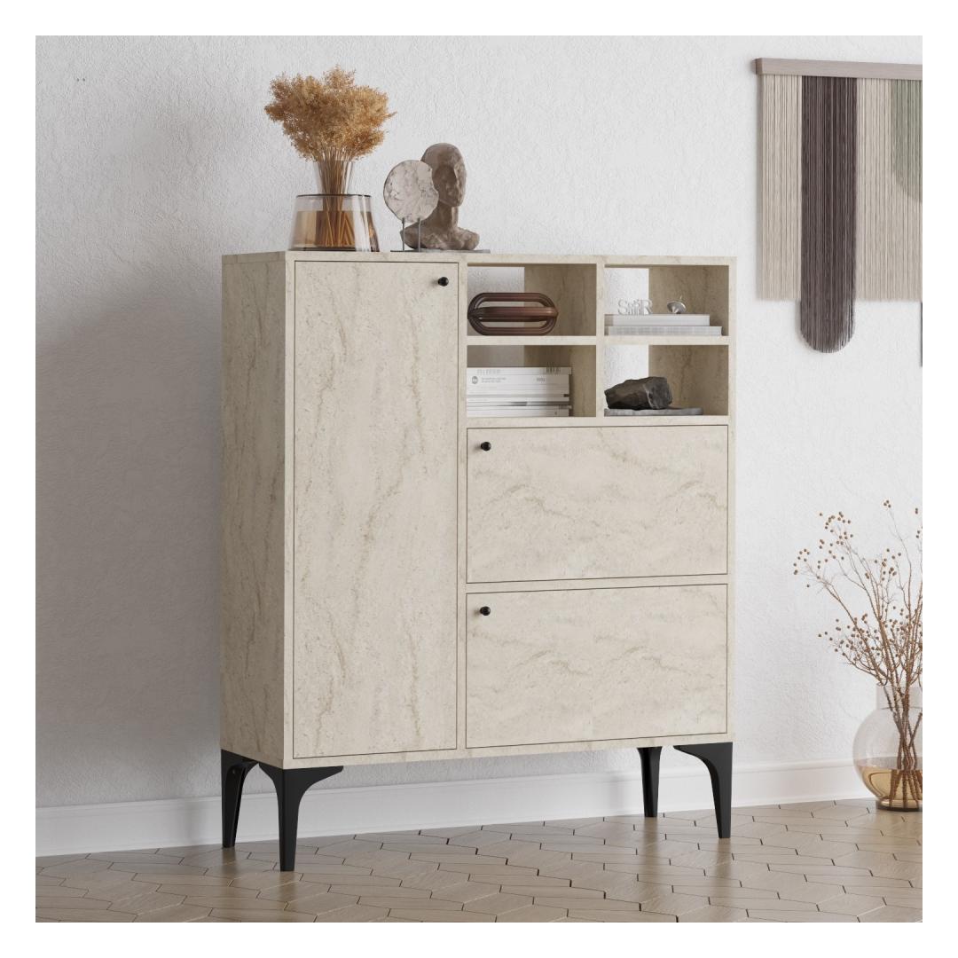Muutke oma elamispind meie uimastatava konsooliga, mis on valmistatud 100% melamiiniga kaetud osakeste tahvlilt. Klanitud disain ja travertiinvärv lisavad igale ruumile elegantsi, samas kui palju salvestusruum ja arvukad riiulid pakuvad funktsionaalsust ja korraldust.