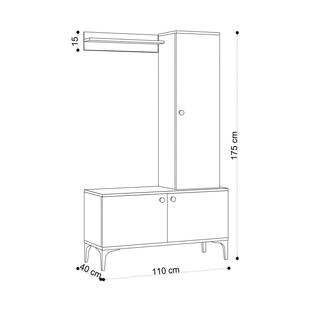 Meie koridoristendi saab hõlpsasti seinale kinnitada, mis maksimeerib teie ruumi kasutamist. Kompaktsete mõõtmete (110 cm laius, 175 cm kõrgus ja 40 cm sügavus) tõttu sobib see ideaalselt ka kõige väiksematesse koridoridesse.